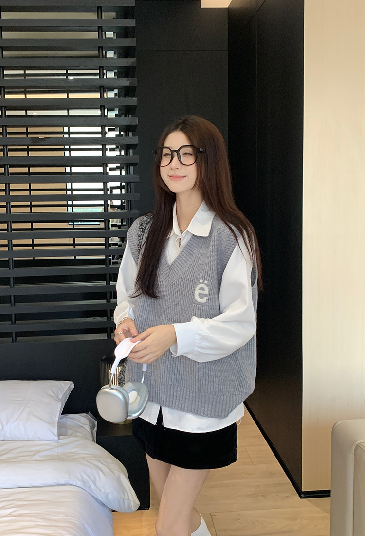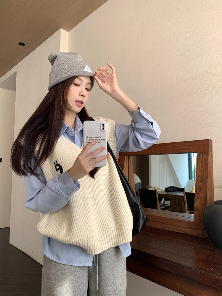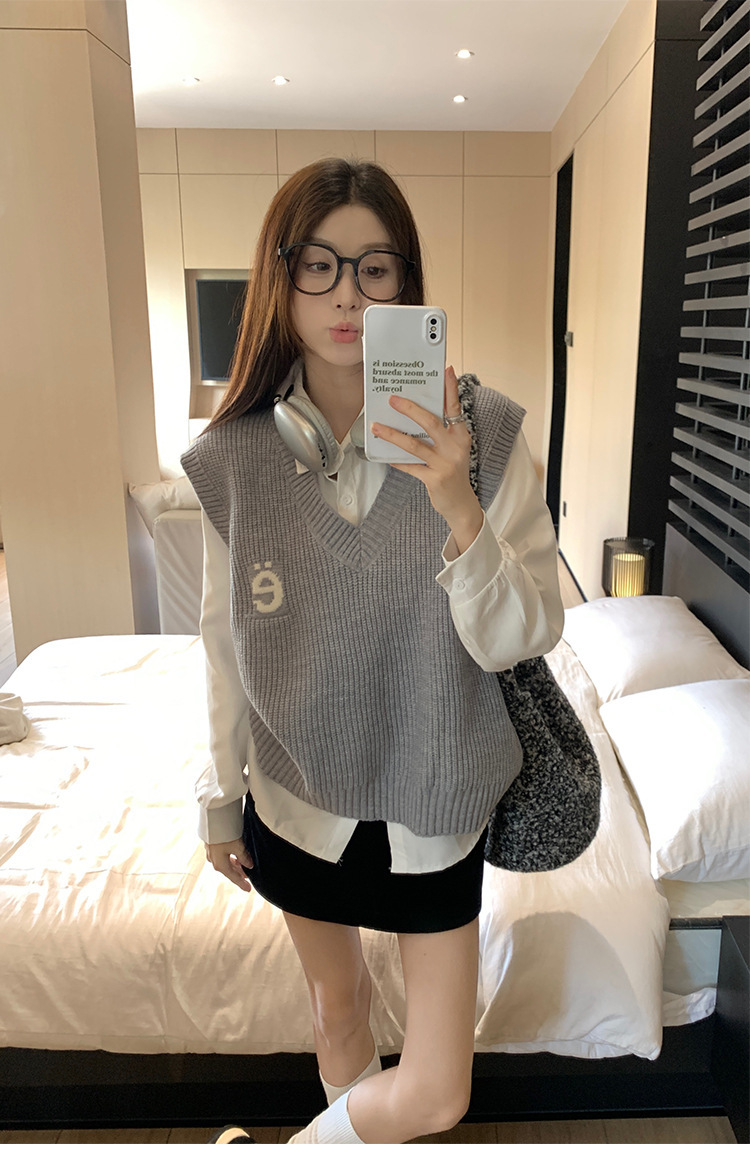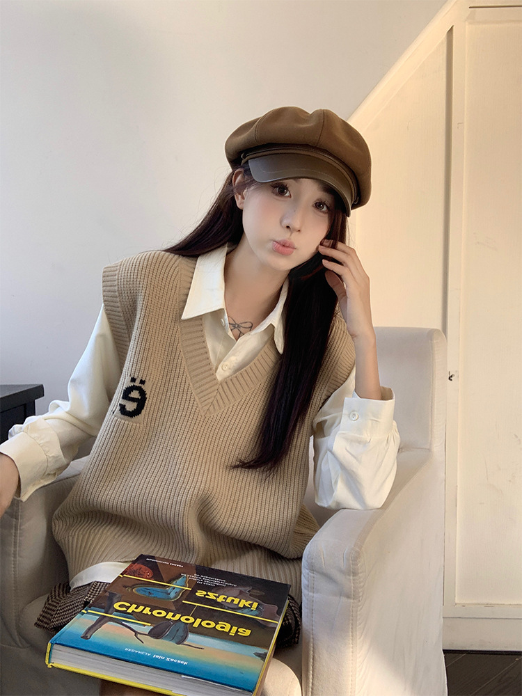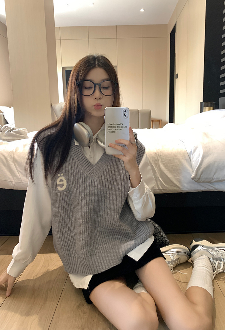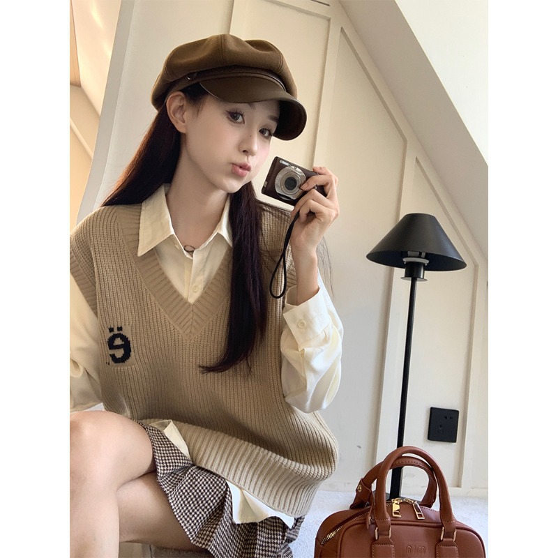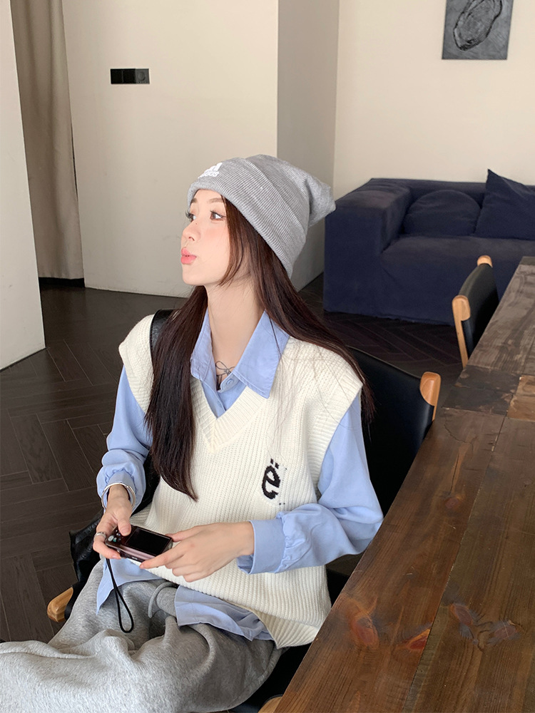 알파벳 자카드 V넥 민소매 니트 조끼 여성 봄 한국식 칼리지 스타일 웨이스트 밴드 쌓인 외부 조끼