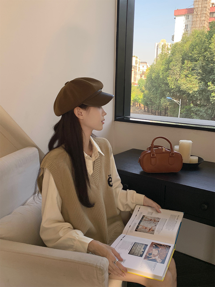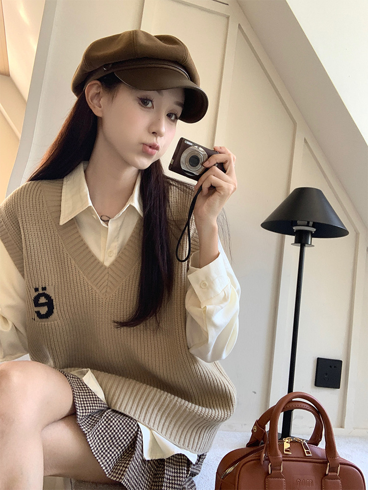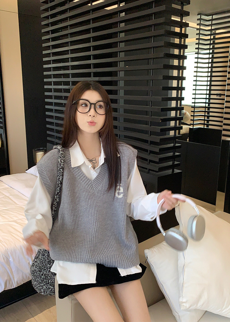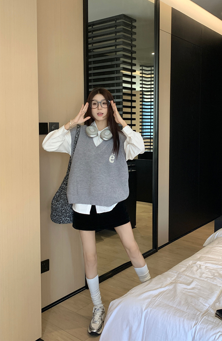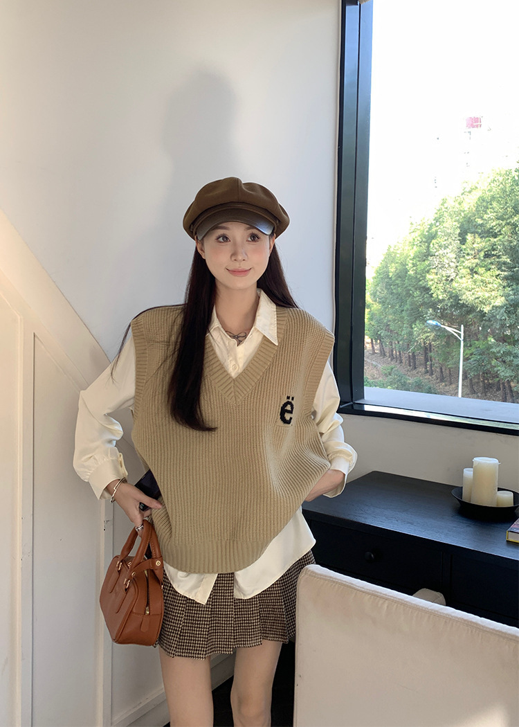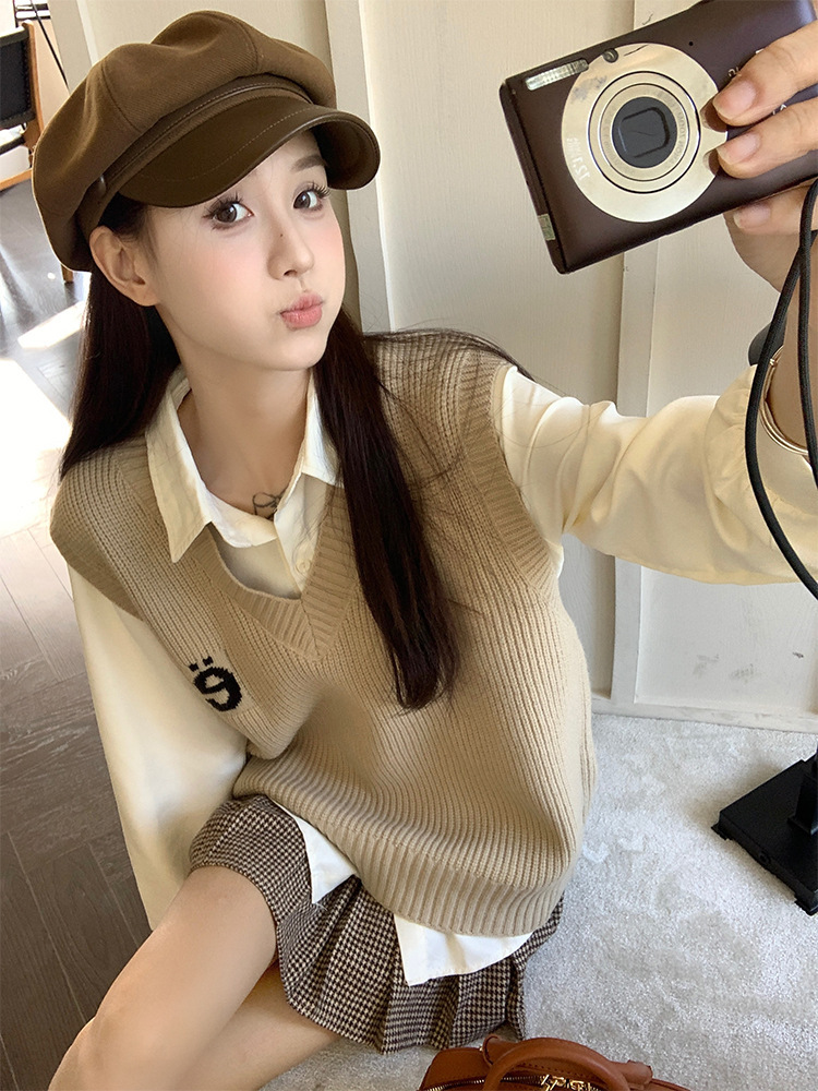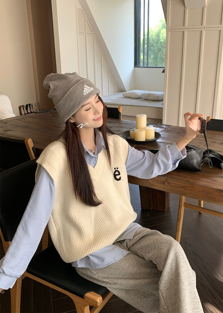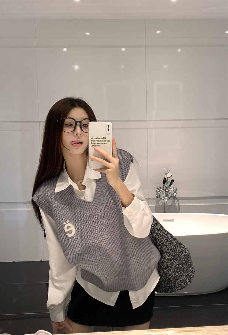 알파벳 자카드 V넥 민소매 니트 조끼 여성 봄 한국식 칼리지 스타일 웨이스트 밴드 쌓인 외부 조끼