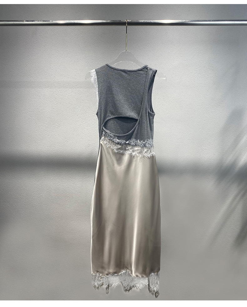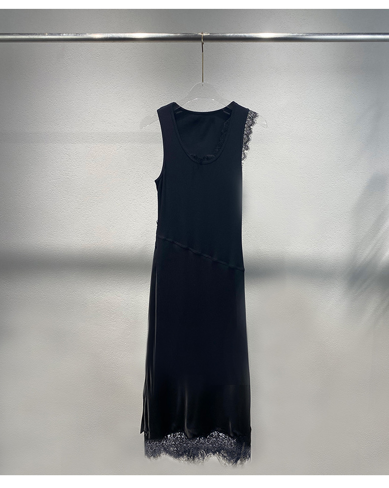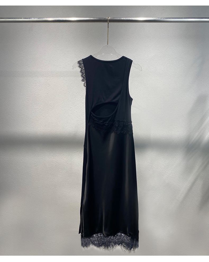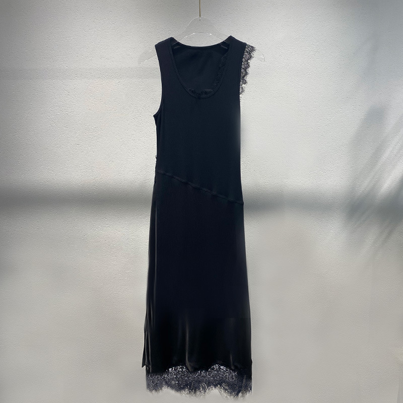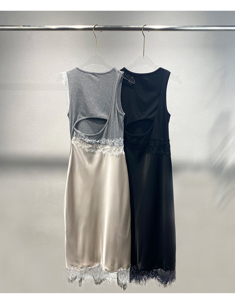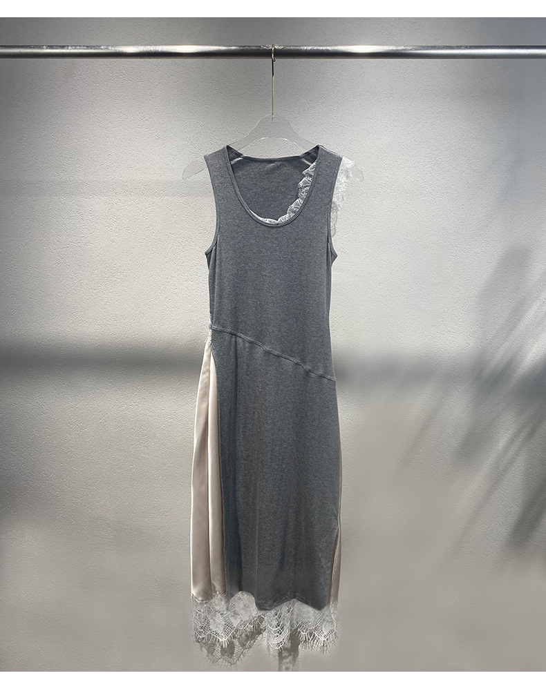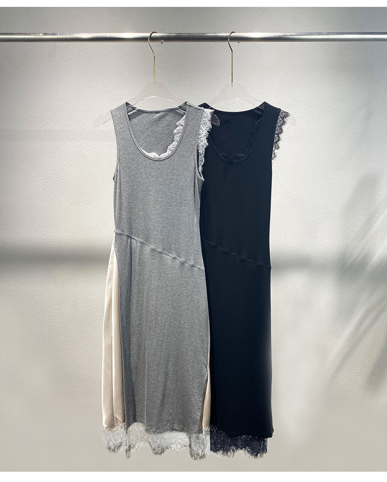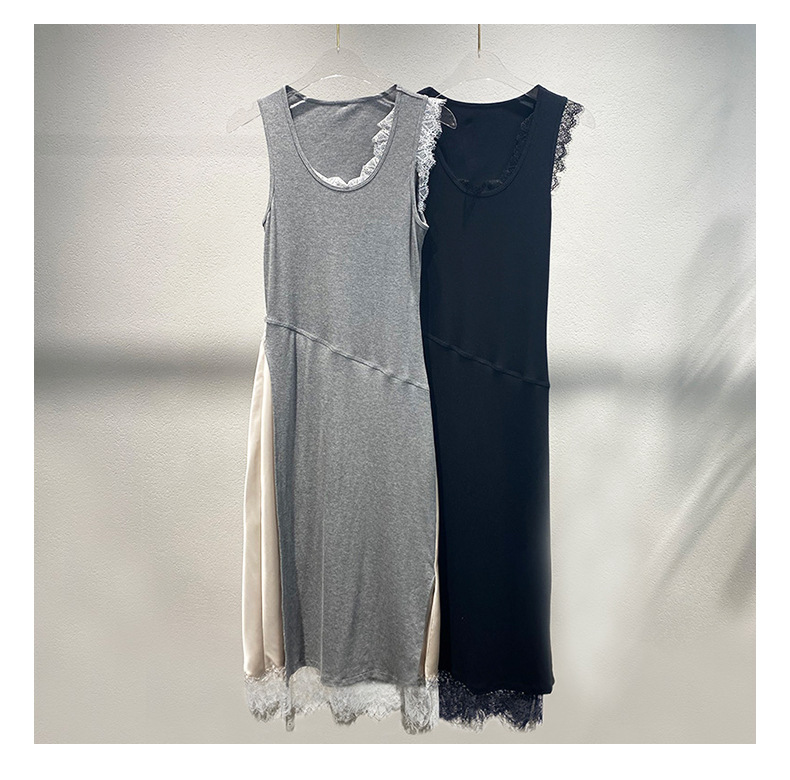 Xiaozhong 2024 봄과 여름 새로운 대비 색상 라운드 넥 레이스 사이드 원피스 여성스토어 가기