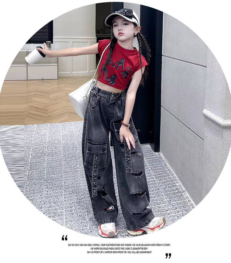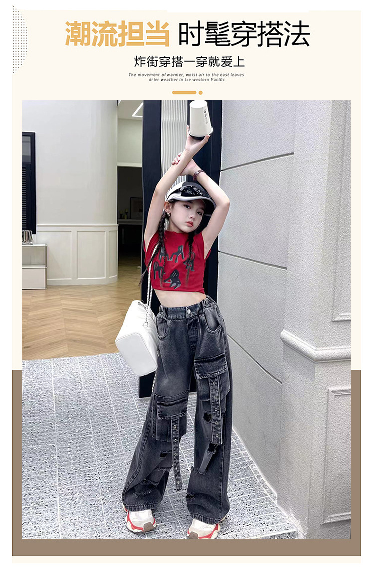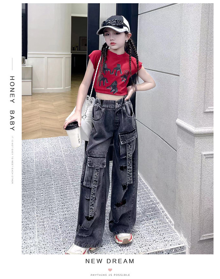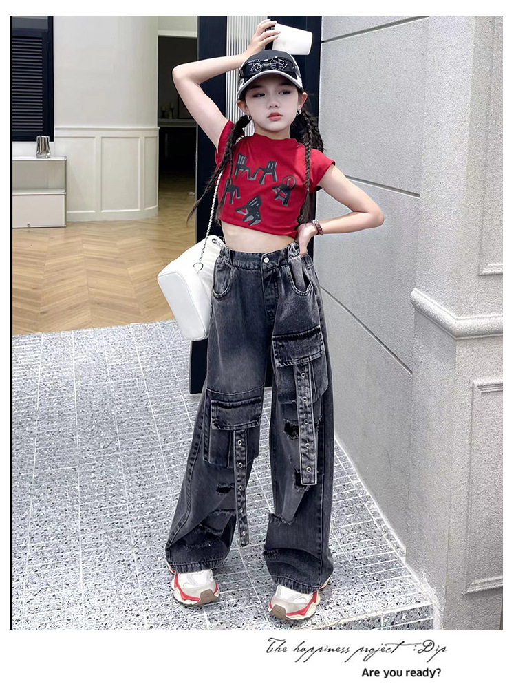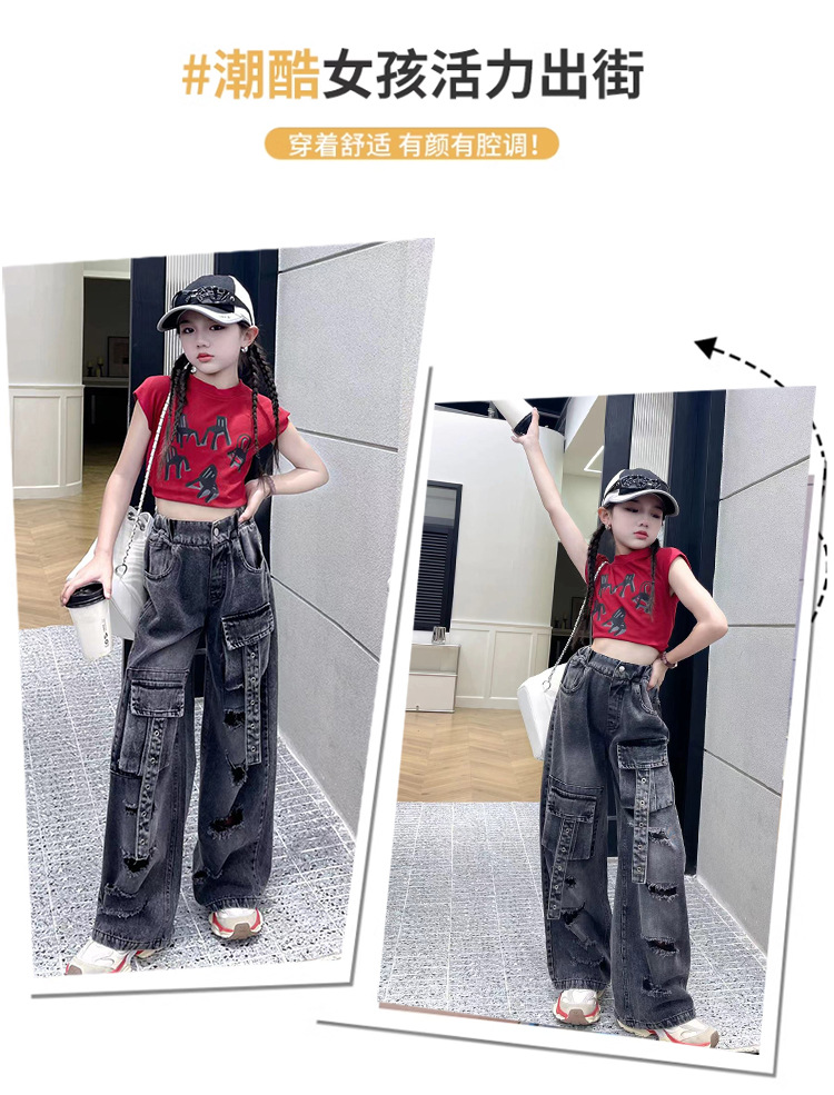 소녀 청바지 2024 여름 새로운 홍콩 스타일 높은 허리 느슨한 넓은 다리 바지 블랙 리핑 작업복 캐주얼 유행 바지스토어 가기