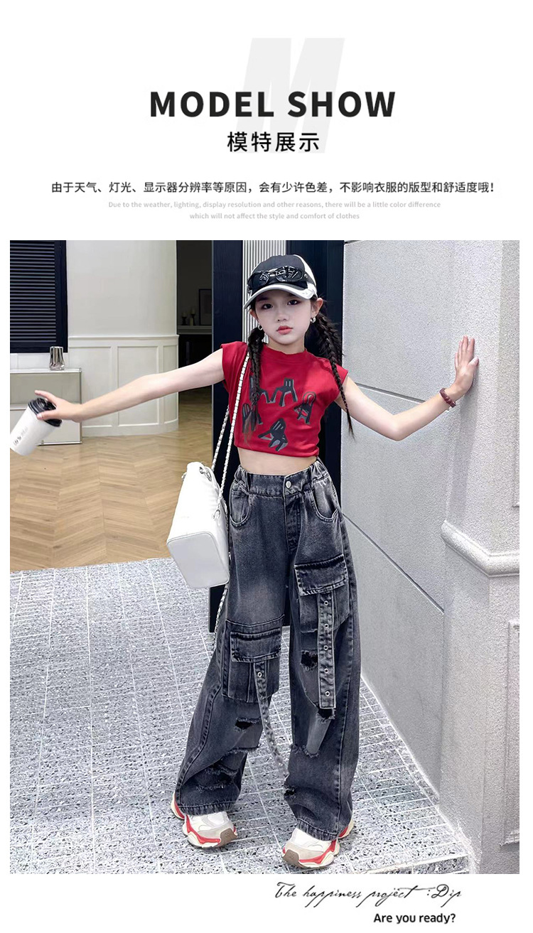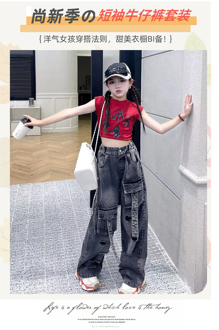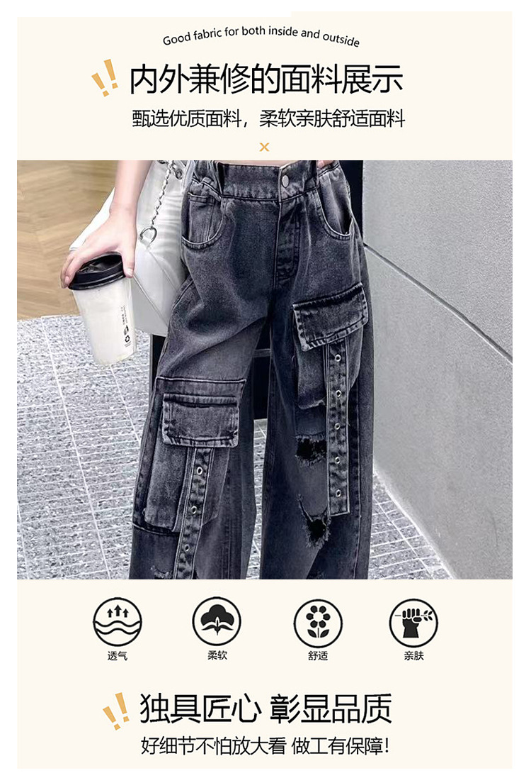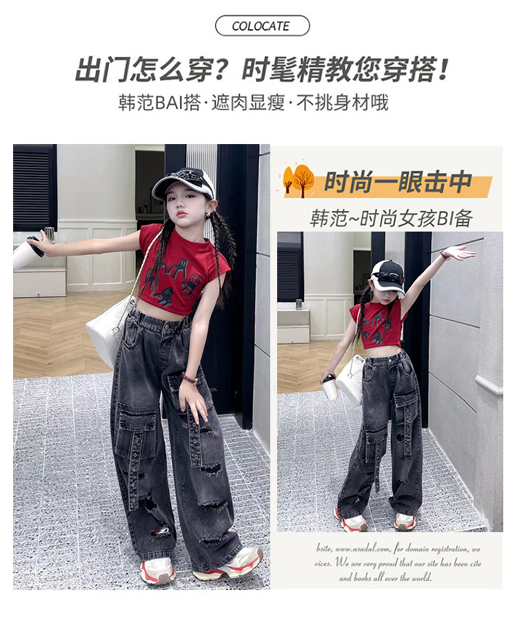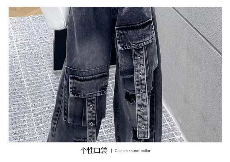 소녀 청바지 2024 여름 새로운 홍콩 스타일 높은 허리 느슨한 넓은 다리 바지 블랙 리핑 작업복 캐주얼 유행 바지스토어 가기