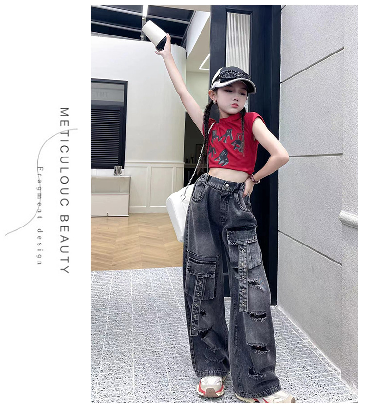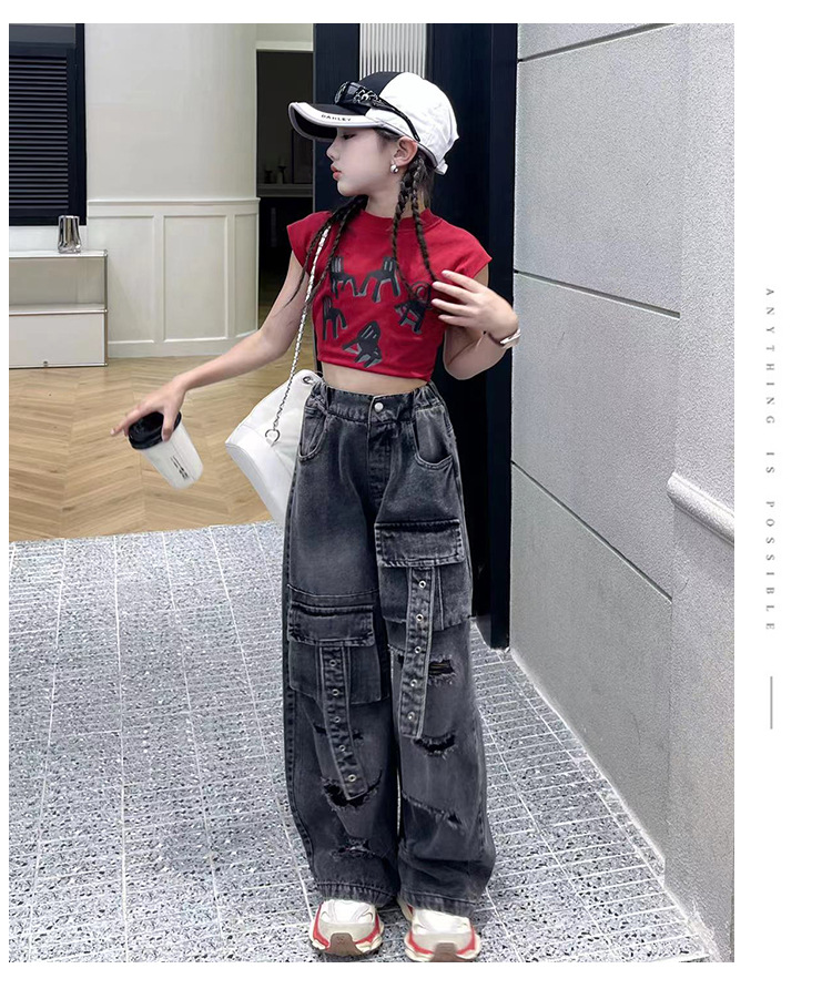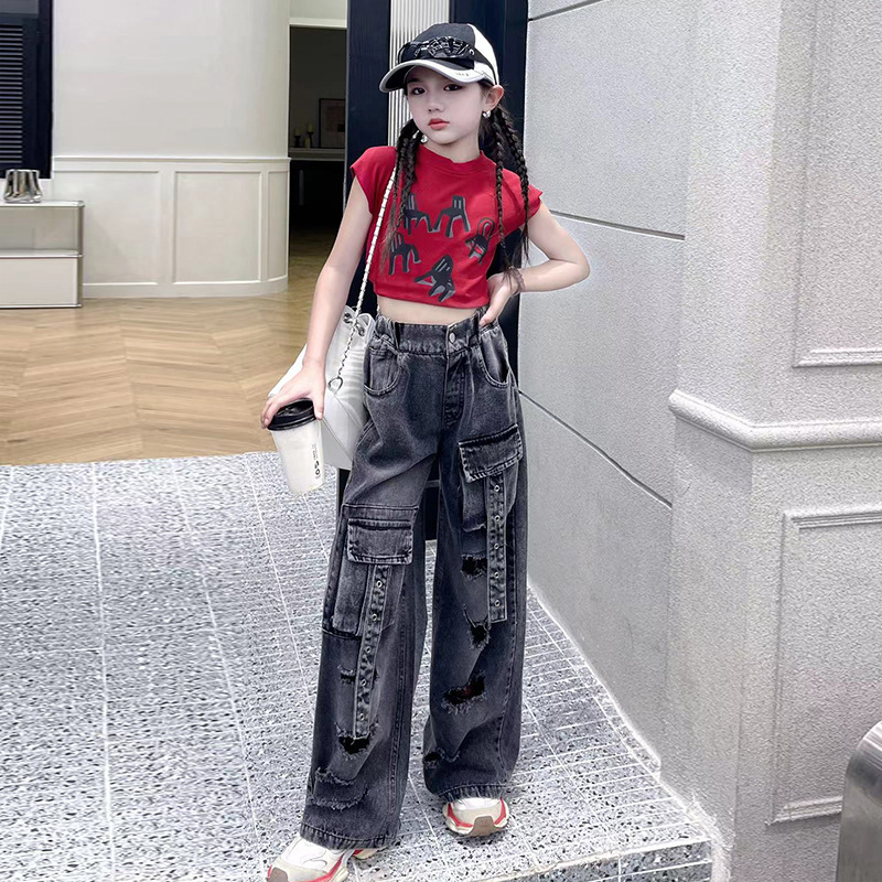 소녀 청바지 2024 여름 새로운 홍콩 스타일 높은 허리 느슨한 넓은 다리 바지 블랙 리핑 작업복 캐주얼 유행 바지