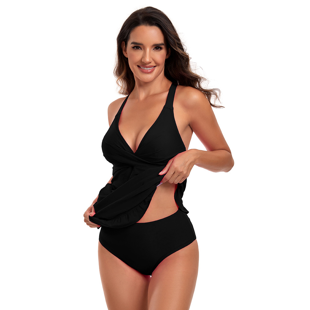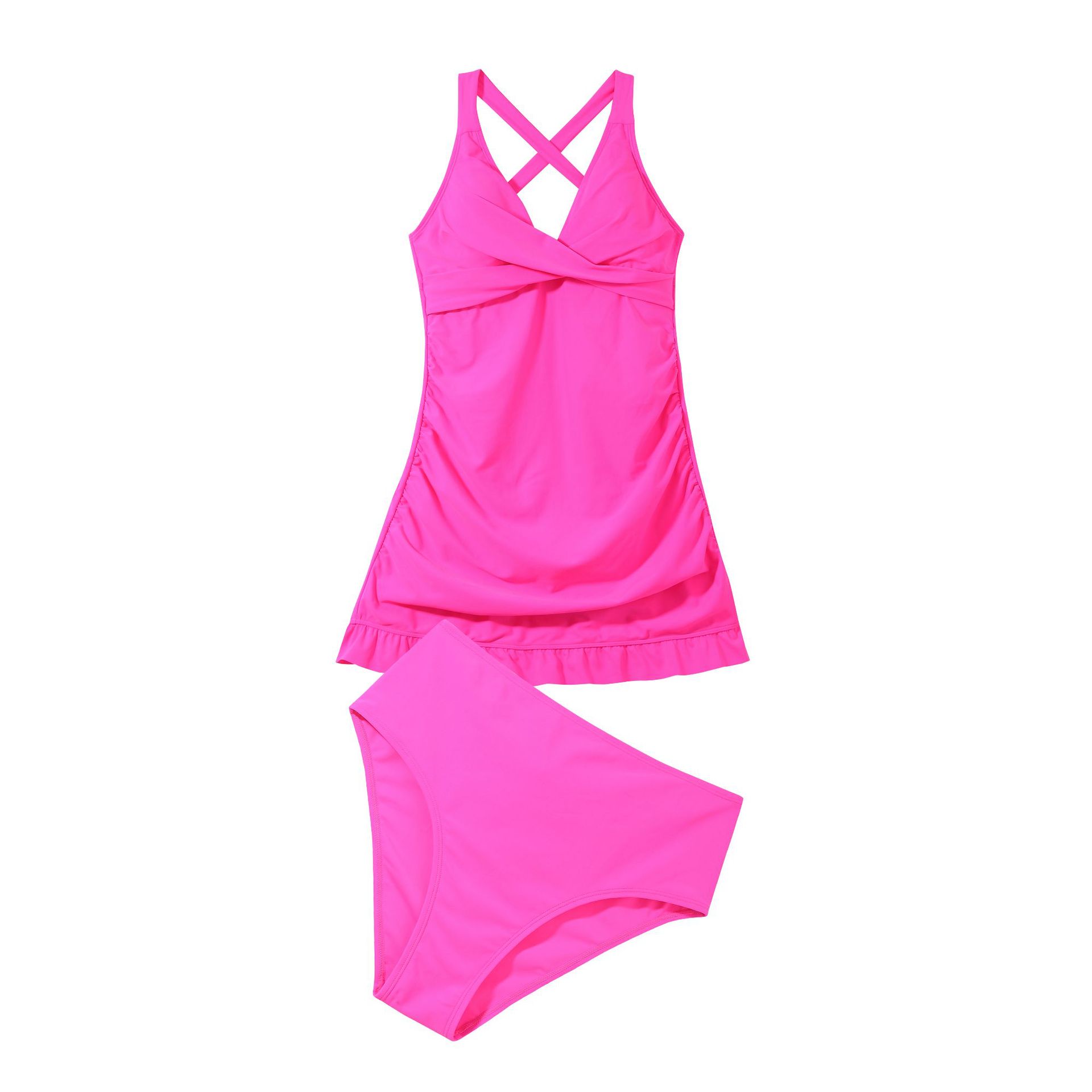 아마존 대외 무역 2024 유럽과 미국의 여름 스커트 Tankini 딥 V 솔리드 컬러 스트랩 코드 분할 수영복 여성