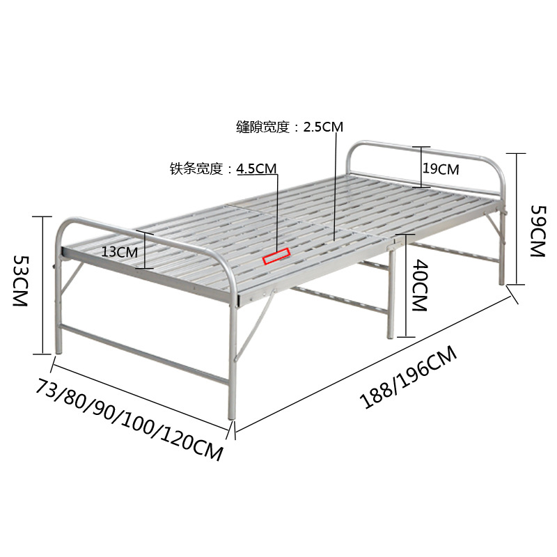 产品尺寸;标配都是内径长度183的外径长度188 加长款的内径长度是190外径长度195 床面距离地面高度40厘米左右.宽度有73宽.80宽.90宽.1米宽 1.2米宽【可以自选】 本公司折叠床采用加厚铁条,质量保证,限时促销 产品材质;支架采用优质加厚铁管,表面经过除锈、磷化、静电喷塑、高温固化而成。耐磨、耐高温 超强承重 结实耐用。
