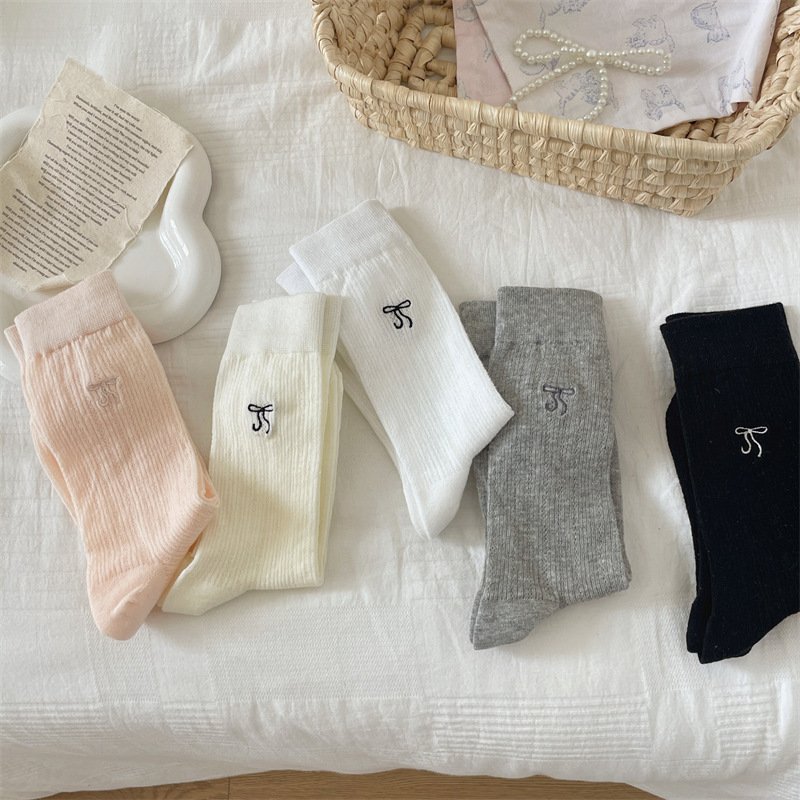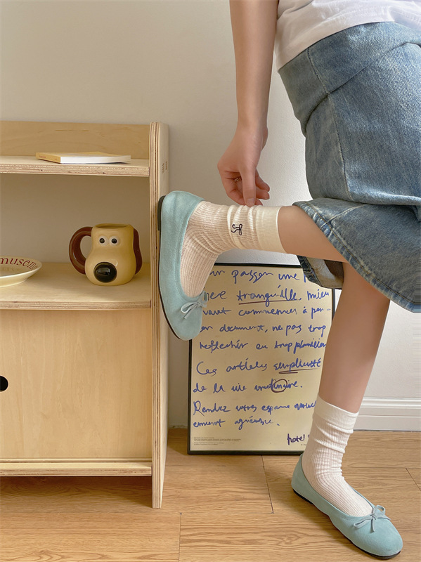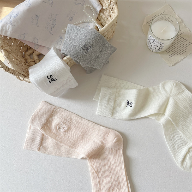 봄과 여름 우유 흰색 얇은 JK 양말 여성 중반 송아지 양말 발레 스타일 활 중공 더미 양말 다목적 단색스토어 가기