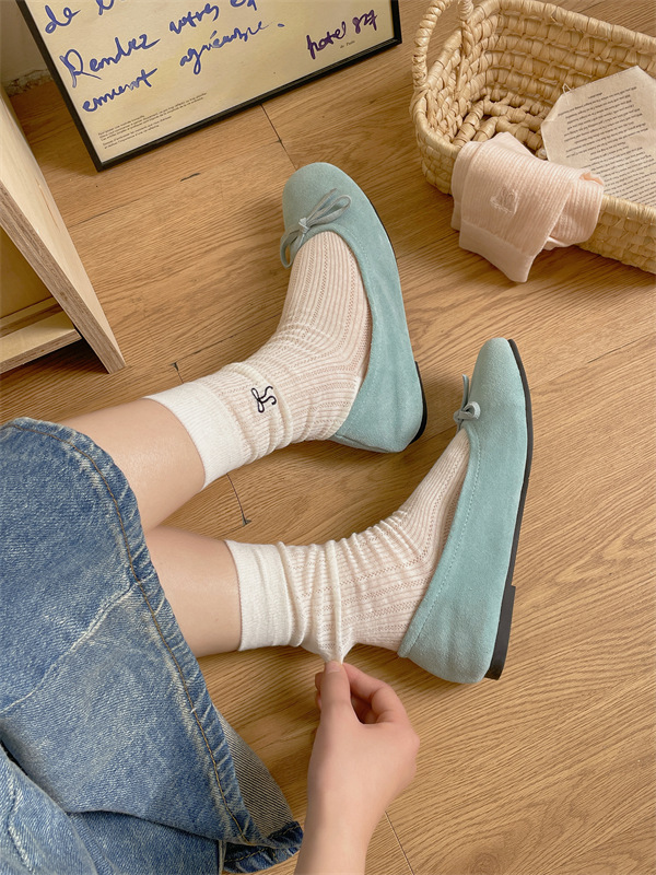 봄과 여름 우유 흰색 얇은 JK 양말 여성 중반 송아지 양말 발레 스타일 활 중공 더미 양말 다목적 단색
