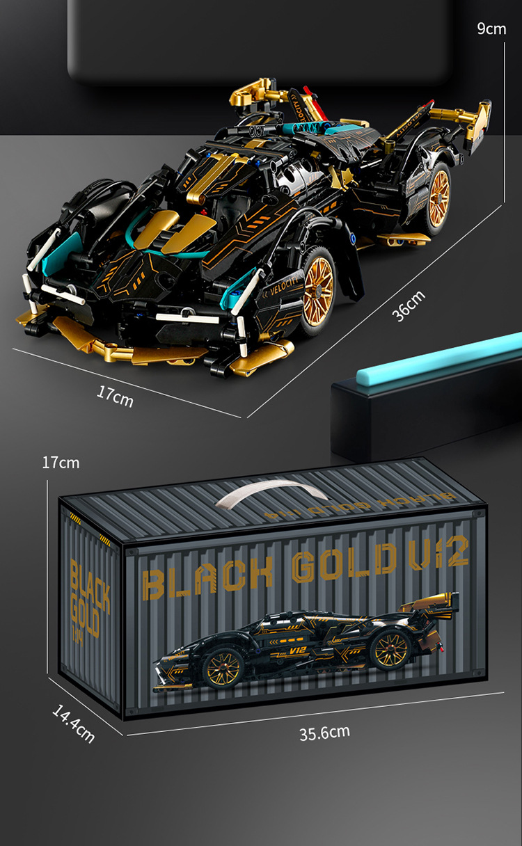 36cm 길이의 V12 블랙 골드 람보 블랙 워리어 빌딩 블록 원격 제어 사이버 스포츠카 퍼즐 조립 모델 남자아이 선물