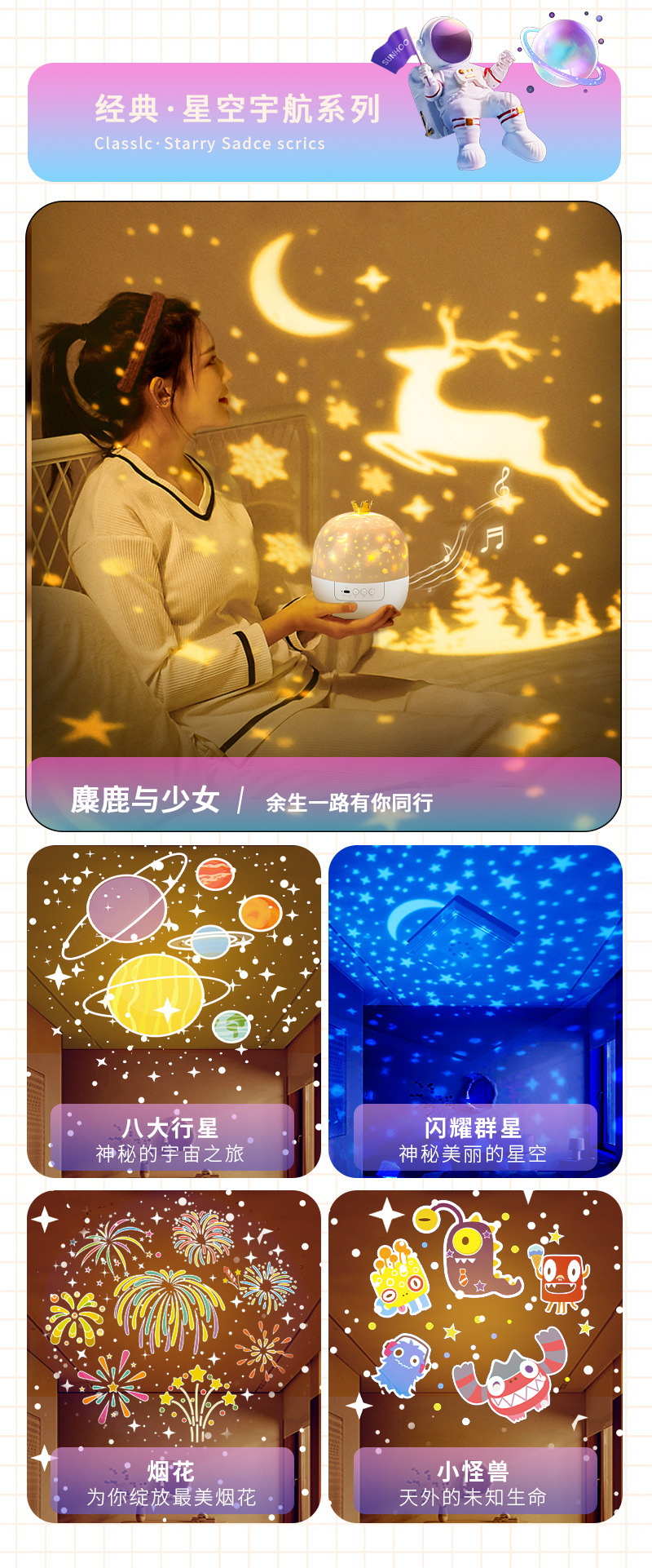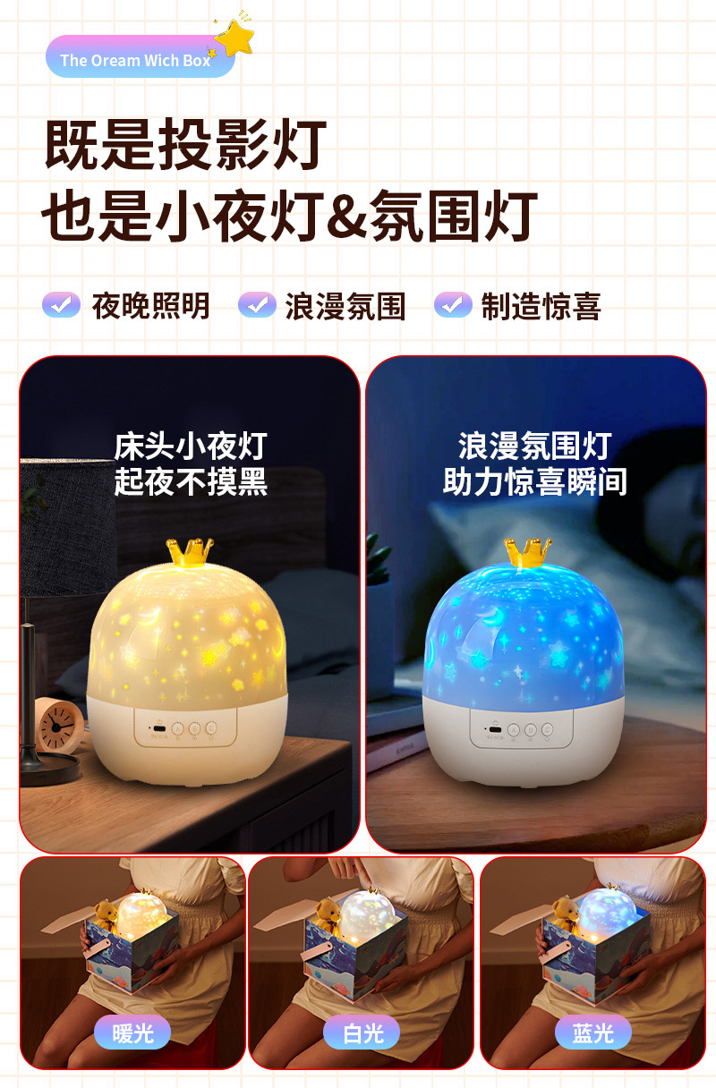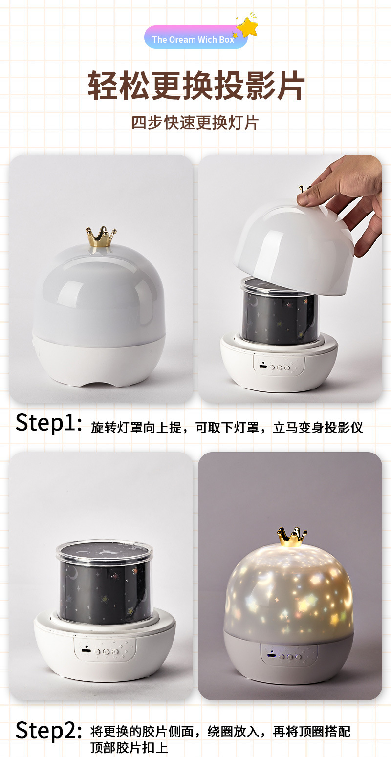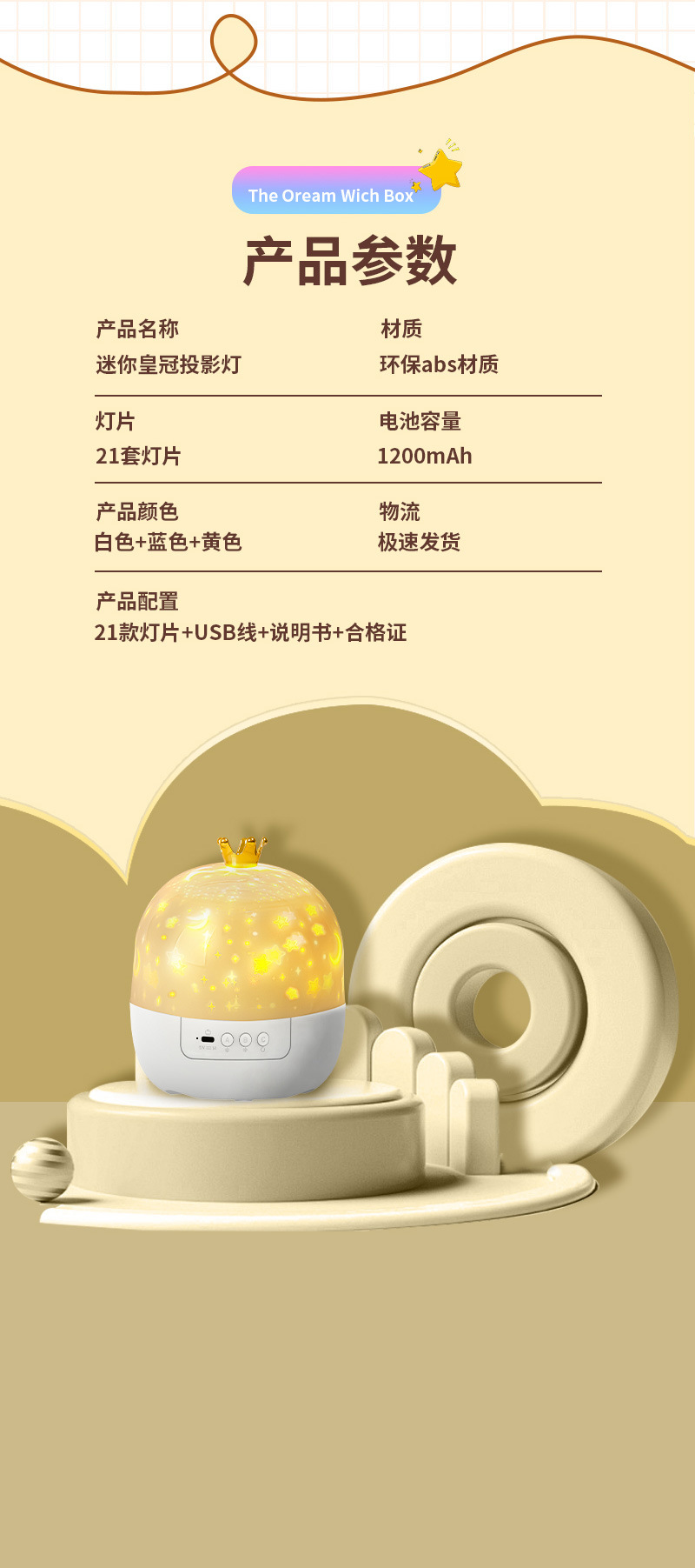 产品标配:梦幻皇冠投影灯*1;USB电源线*1;说明书*1;投影胶片*21;遥控器*1(仅充电款)