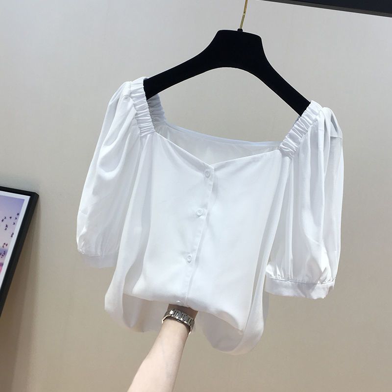 신선한 쉬폰 셔츠 반팔 어깨 탑 여자 2024 년 여름 새로운 올매치 우아한 벨리 커버 트렌디 셔츠