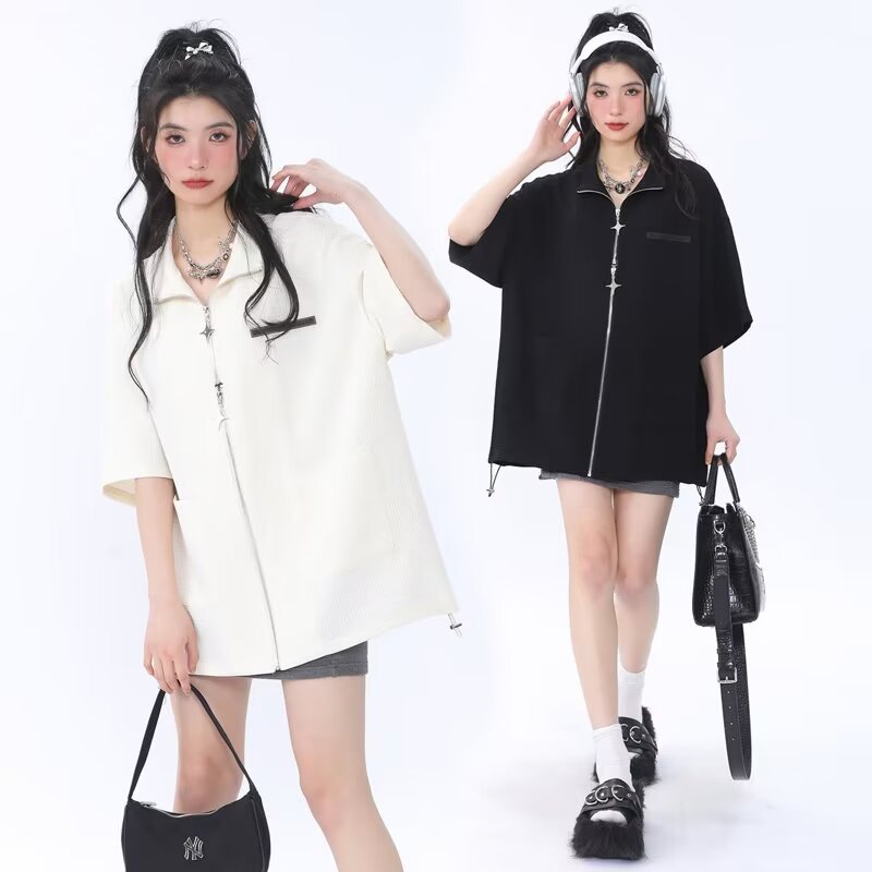 와플 더블 Zip 셔츠 여성의 2024 새로운 플러스 사이즈 통통녀 재킷 여름 얇은 느슨한 캐주얼 폴로 칼라스토어 가기