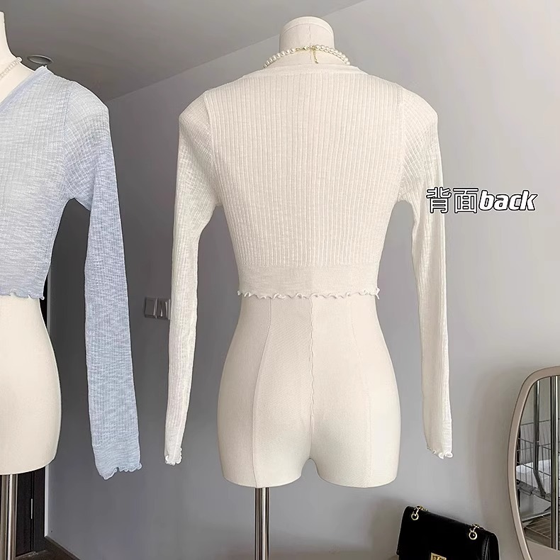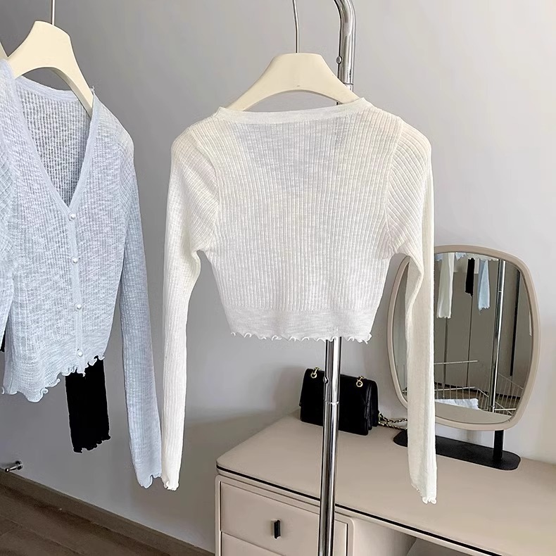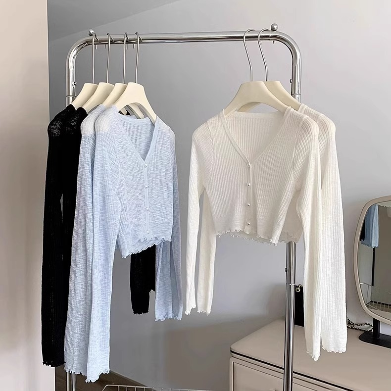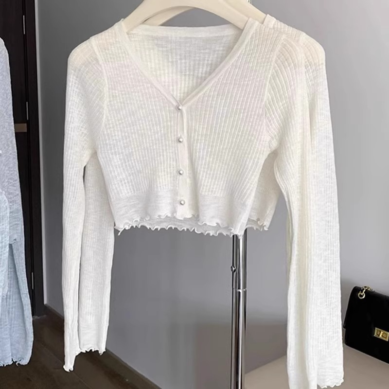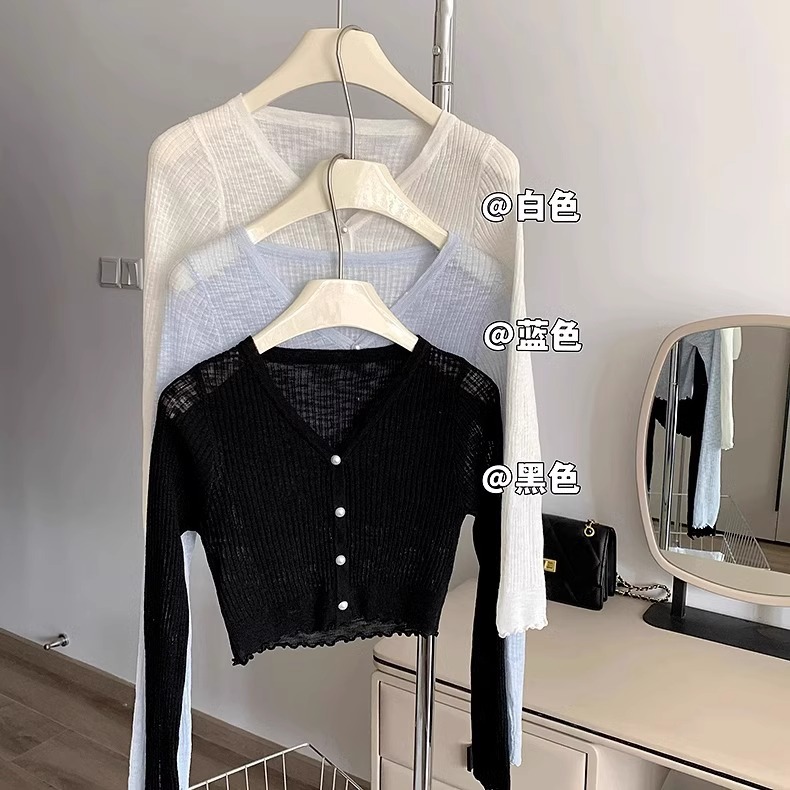 2024 새로운 얇은 선 스크린 니트 카디건 재킷 여성의 여름 아이스 실크 목도리 오버 셔츠 짧은 에어컨 셔츠