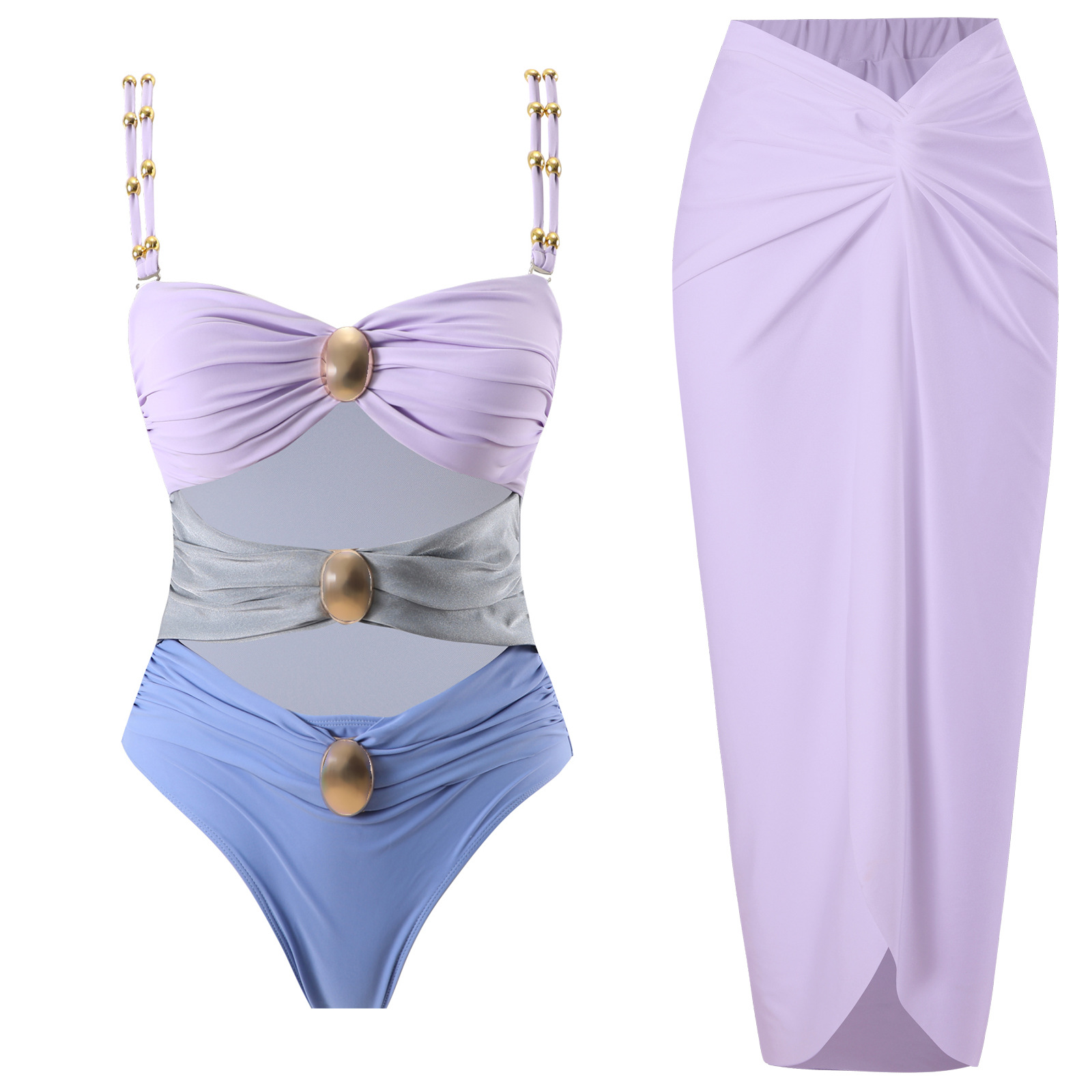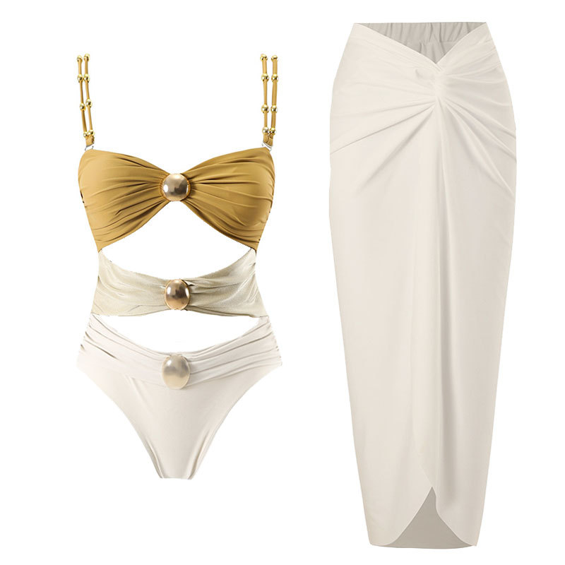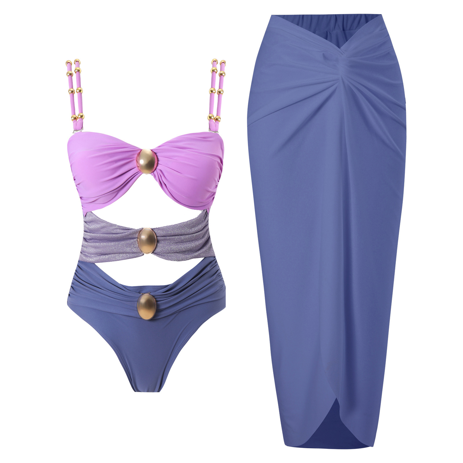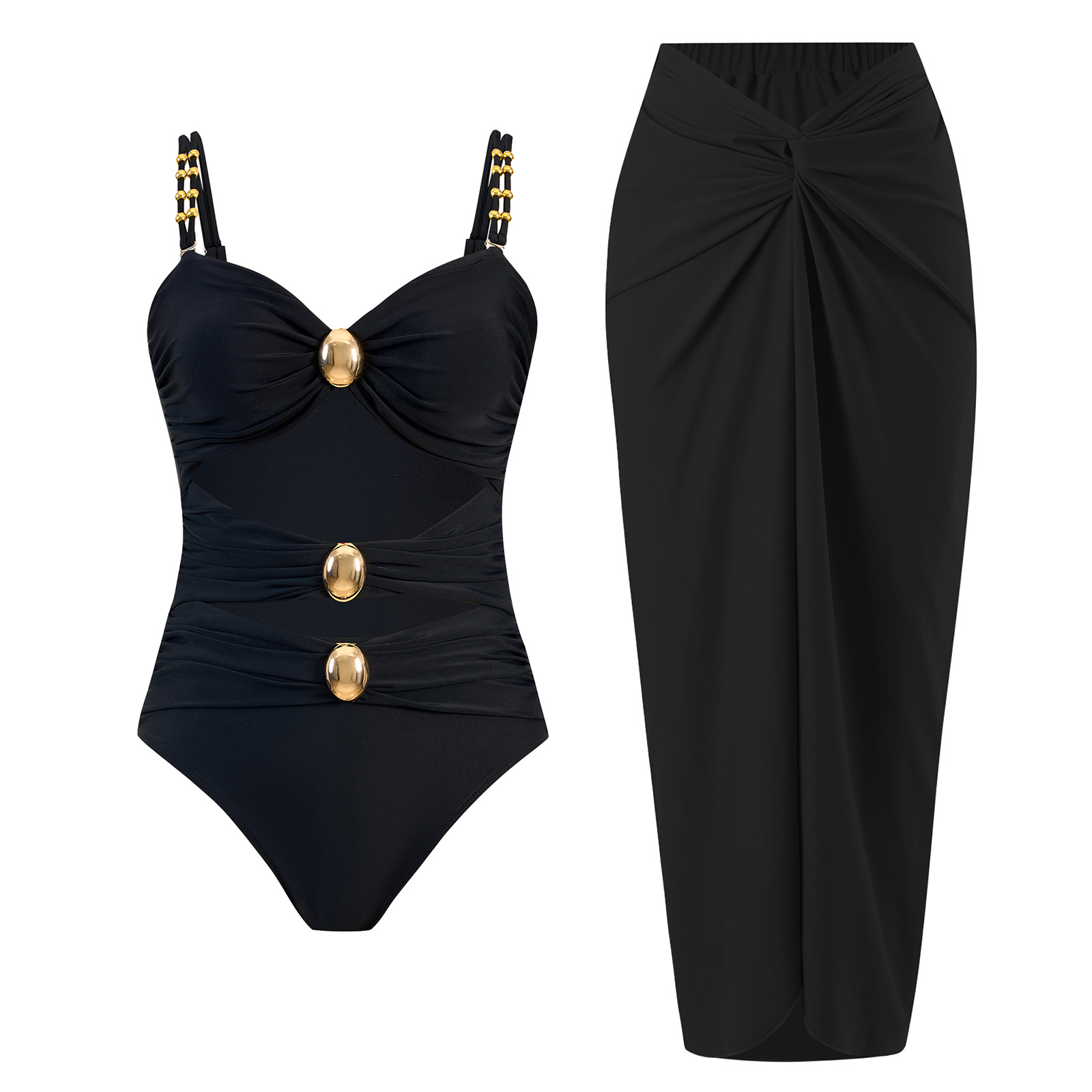 아마존 폭발 단색 접합 수영복 세트 국경 간 뜨거운 판매 유럽과 미국의 복고풍 보수적 인 금속 버클 수영복스토어 가기