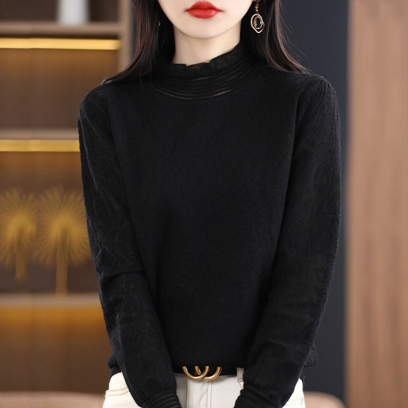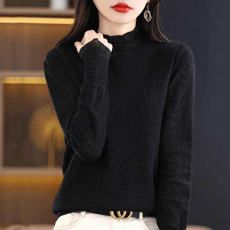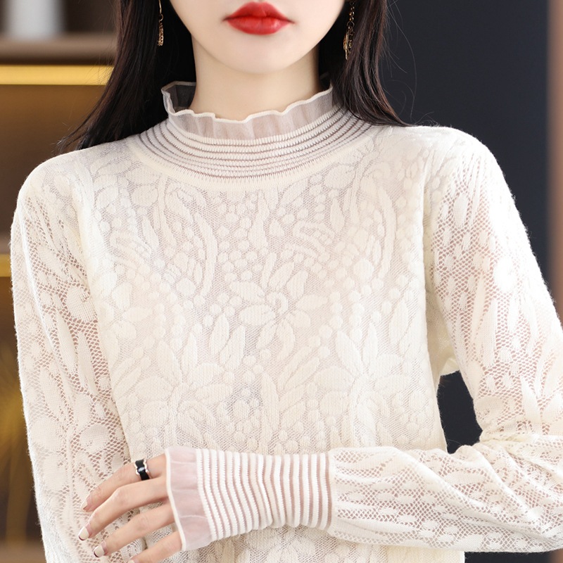 2024 봄과 여름 새로운 할로우 자수 반 높이 칼라 쉬폰 셔츠 레이스 여성용 니트 양모 셔츠베이스 셔츠