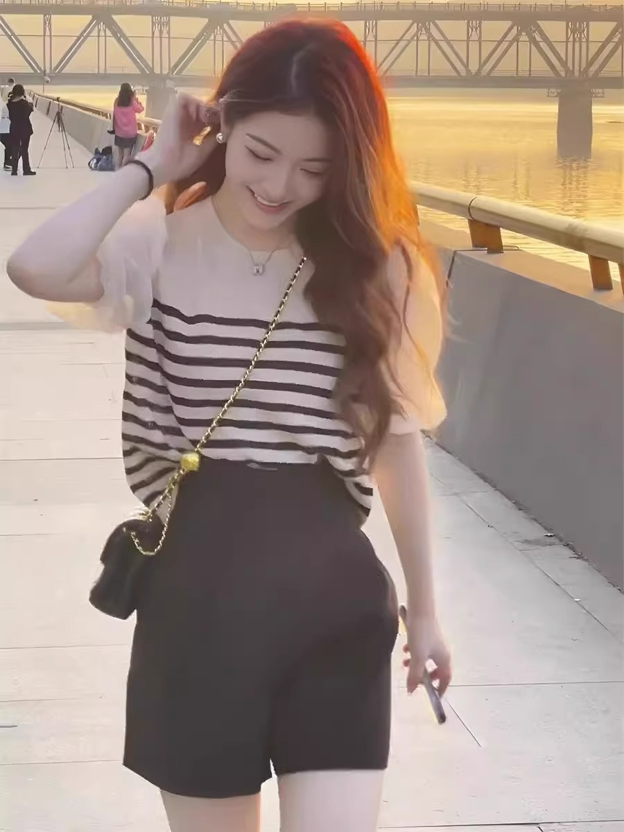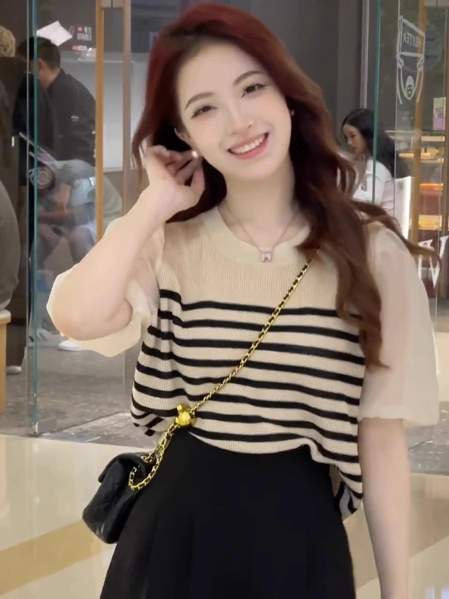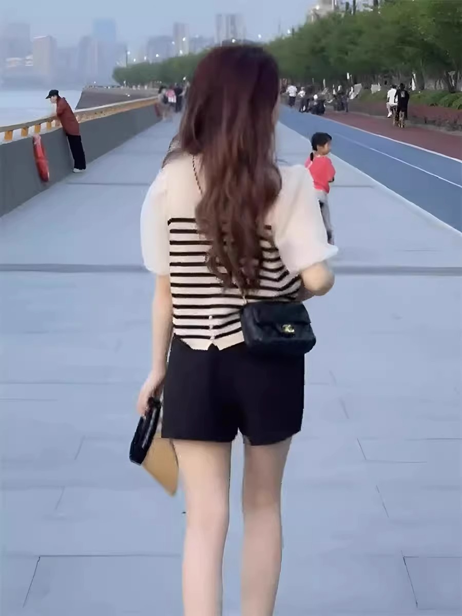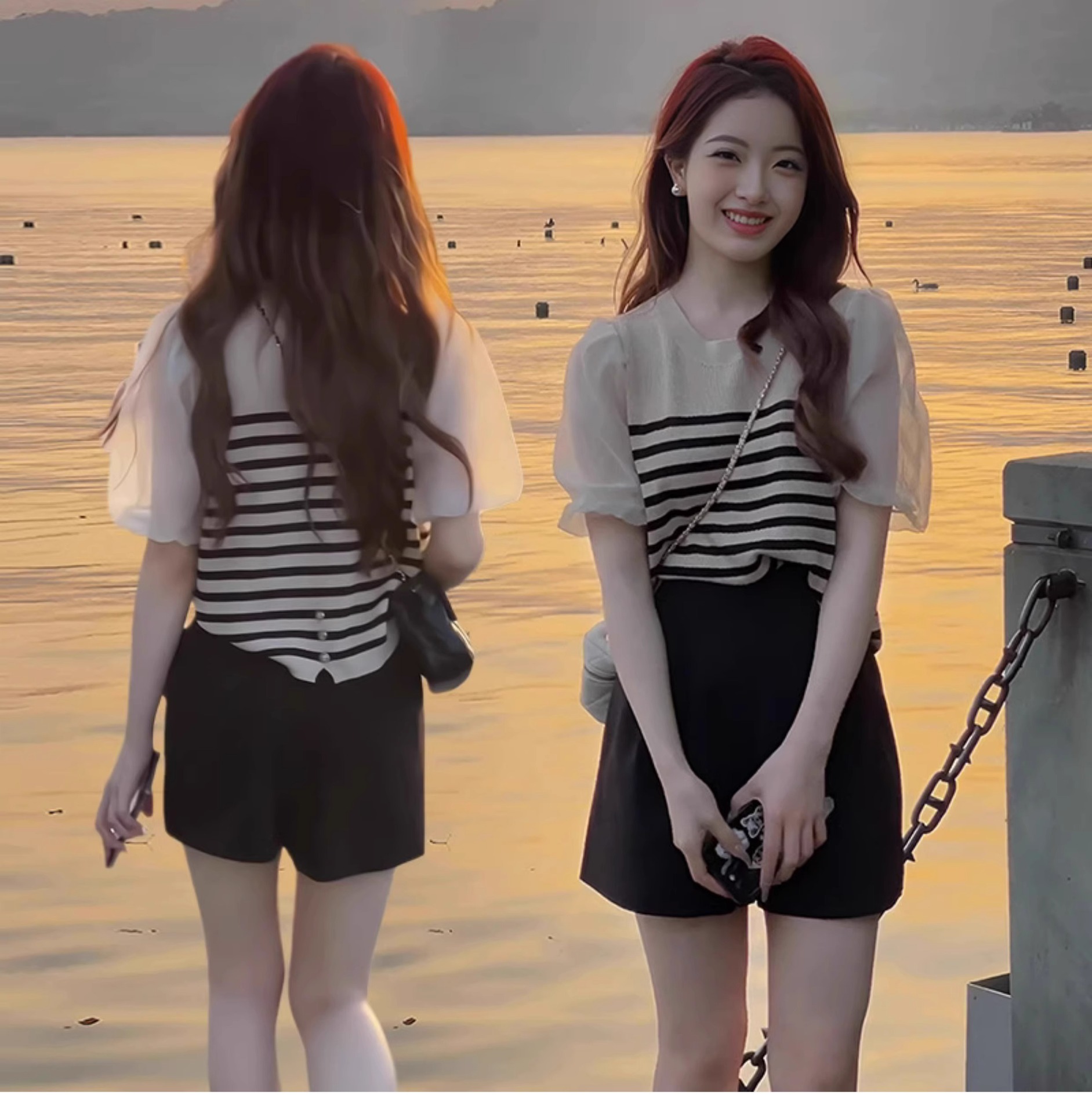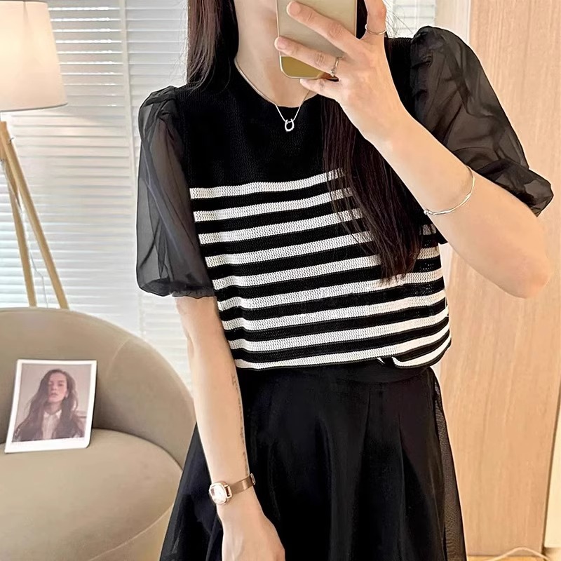아이스 실크 반팔 스웨터 여성의 여름 2024 새로운 도착 유행 슬리밍 서양식 퍼프 슬리브 디자인 센스 스트라이프 탑스토어 가기