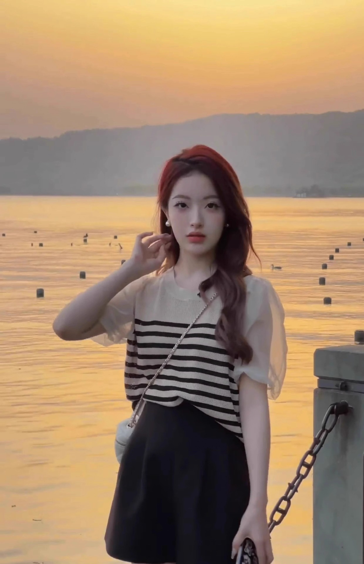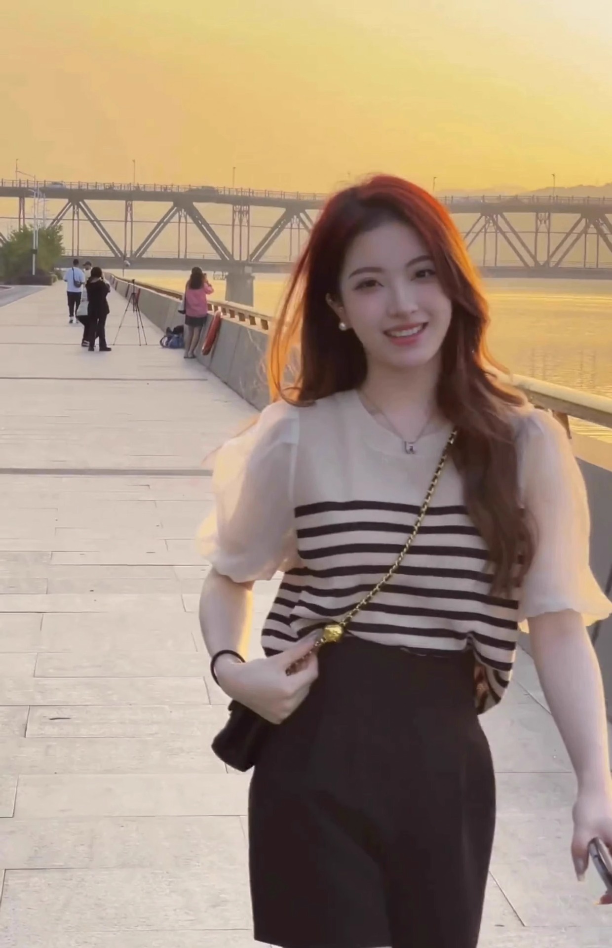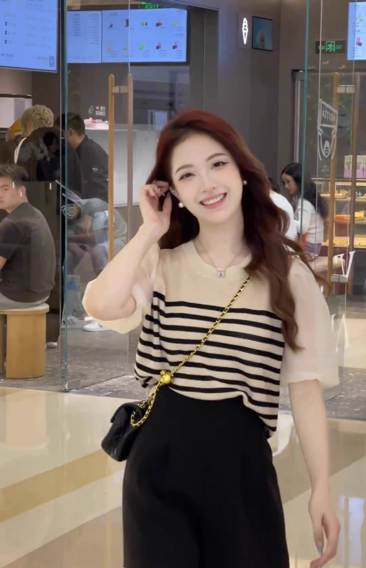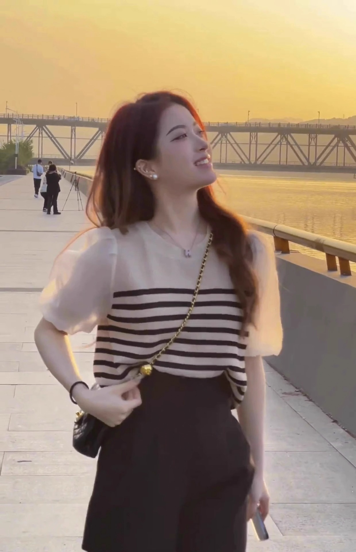 아이스 실크 반팔 스웨터 여성의 여름 2024 새로운 도착 유행 슬리밍 서양식 퍼프 슬리브 디자인 센스 스트라이프 탑스토어 가기