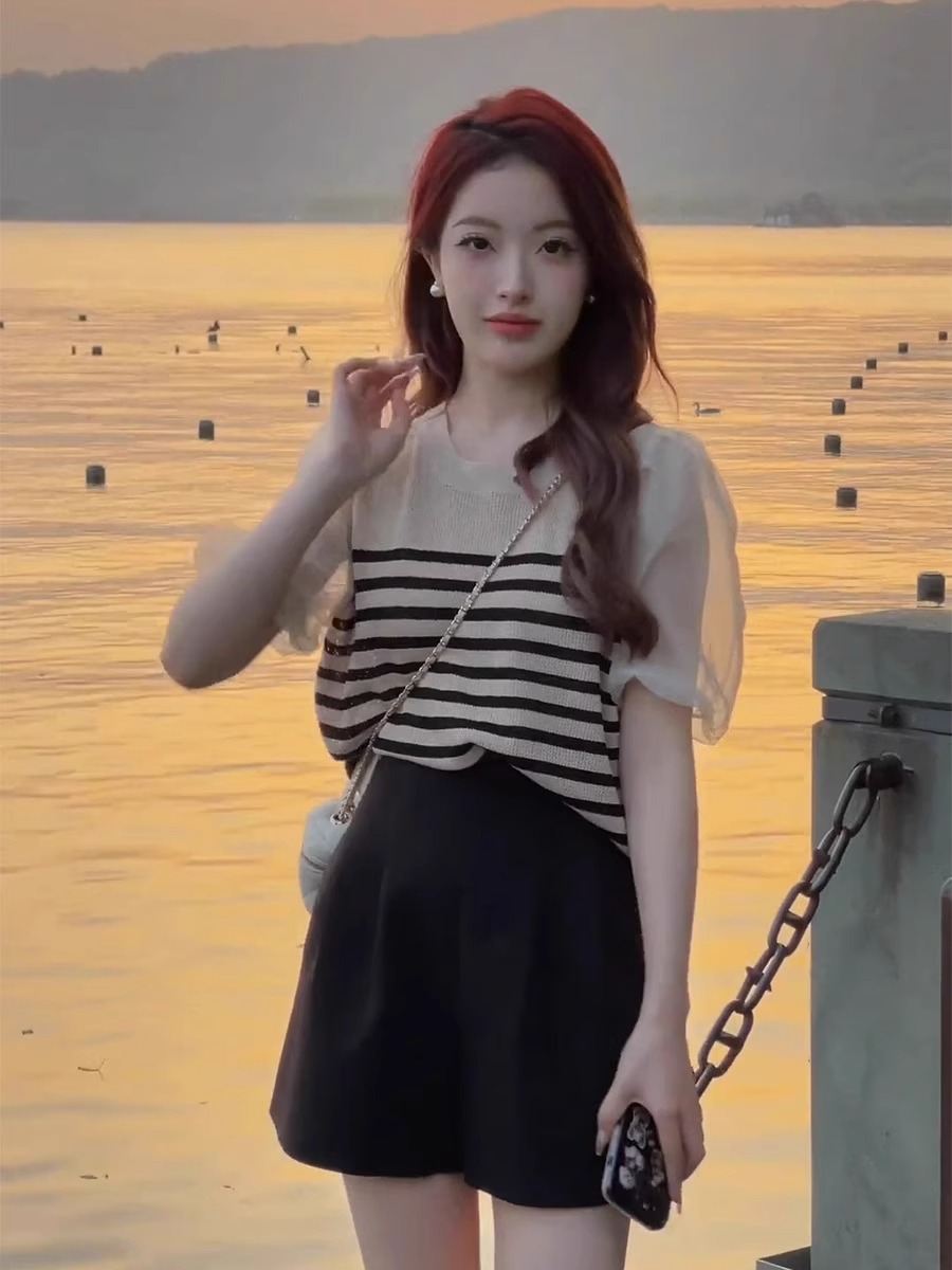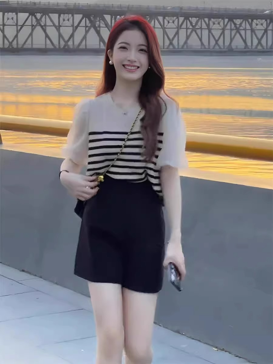 아이스 실크 반팔 스웨터 여성의 여름 2024 새로운 도착 유행 슬리밍 서양식 퍼프 슬리브 디자인 센스 스트라이프 탑