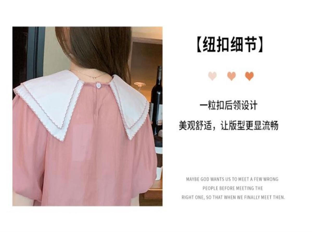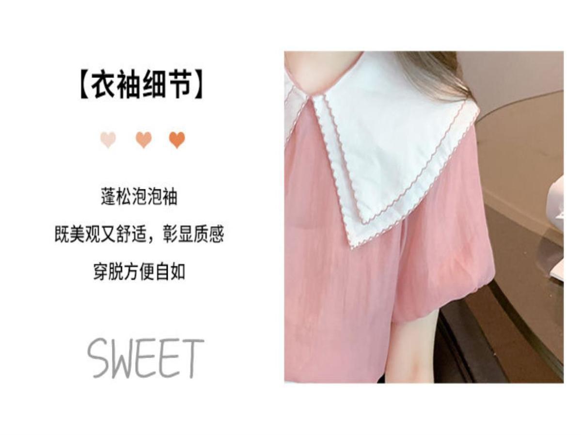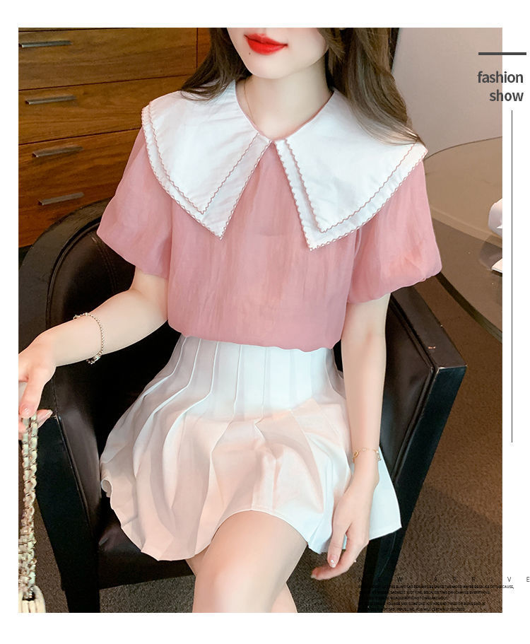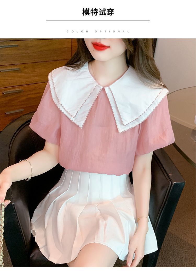 여름 인형 칼라 짧은 소매 쉬폰 셔츠 여성 여름 2024 새로운 탑 느슨한 기질 달콤한 셔츠