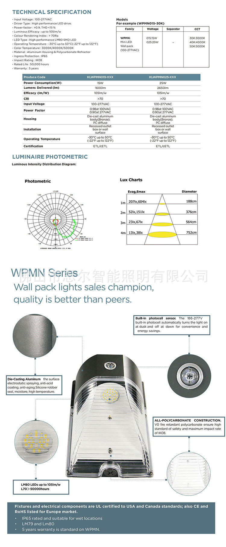 공장 직접 판매 국경 간 LED 야외 ETL 인증 LED 미국 도어 헤드 라이트 25W 조명 제어 미니 소형 벽 램프