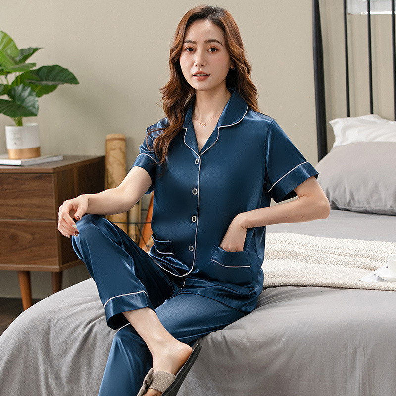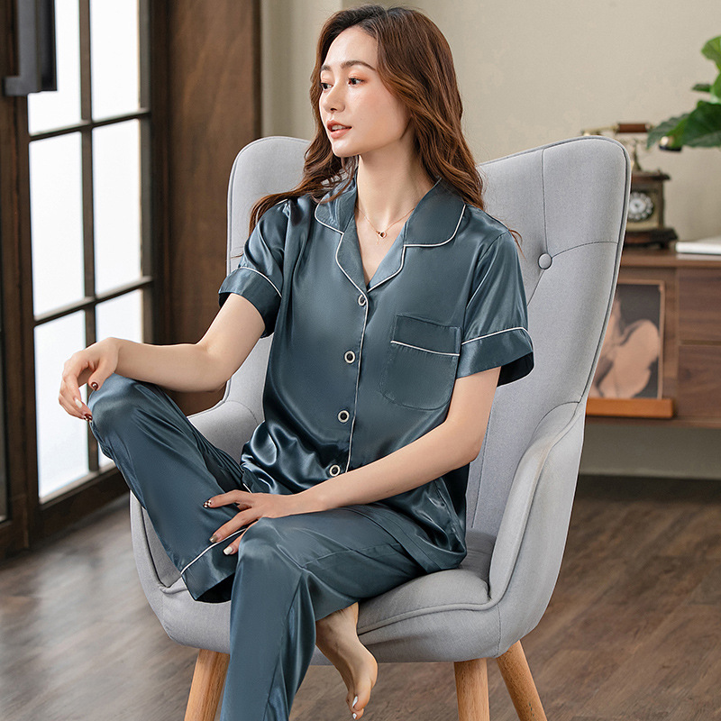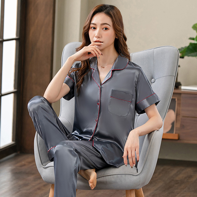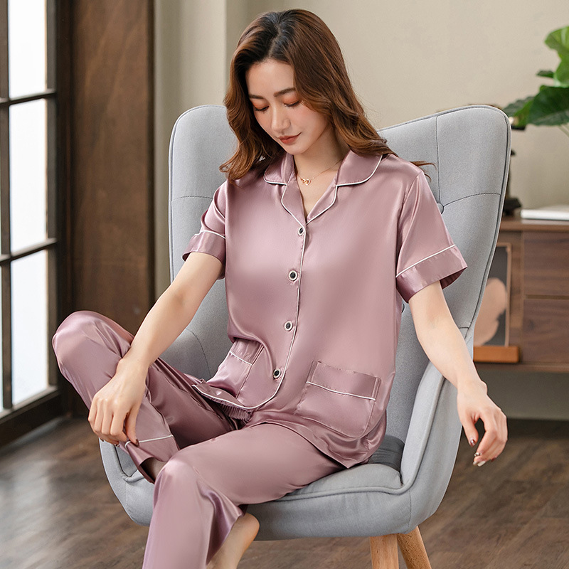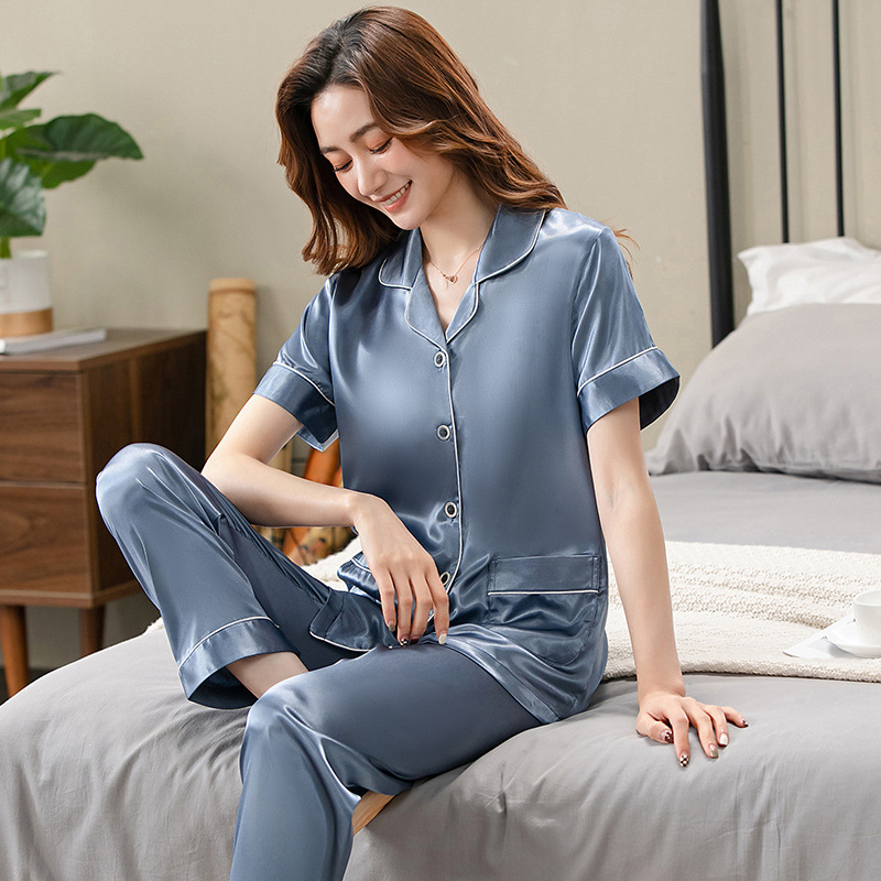 중년 잠옷 여성의 시원한 반팔 바지 여름 얇은 단색 홈 옷 실크 같은 중년 어머니의 세트