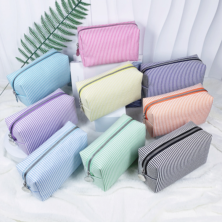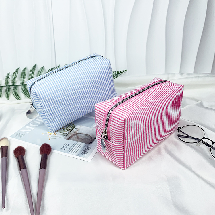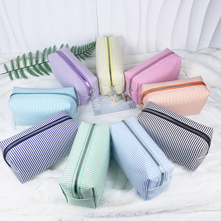 국경 간 뜨거운 판매 Seersucker 화장품 가방 인도 핸드 대용량 워시 백 자수 줄무늬 여행 보관 가방스토어 가기