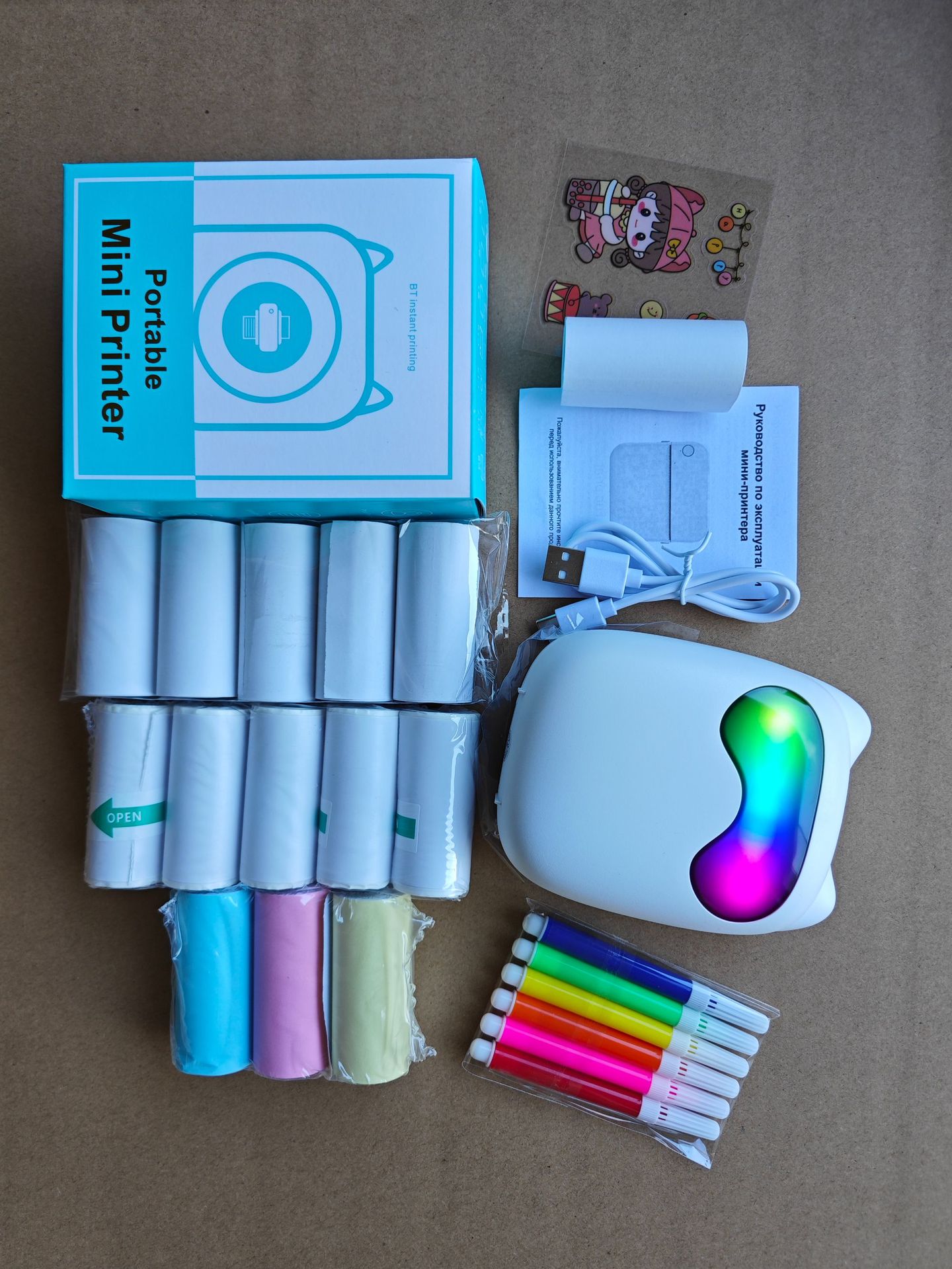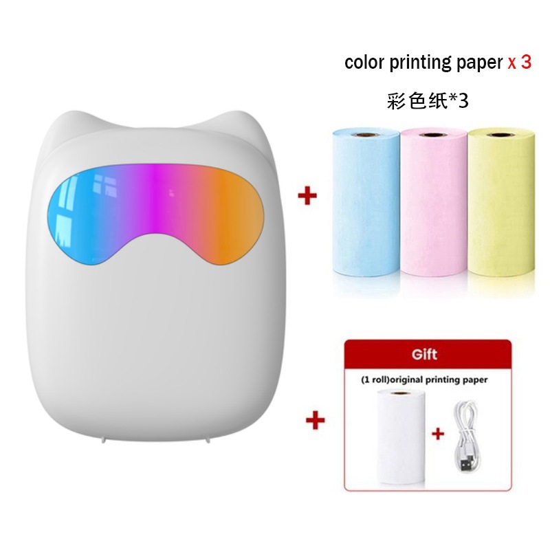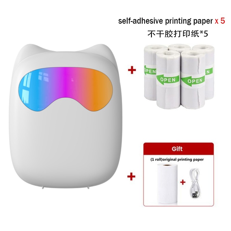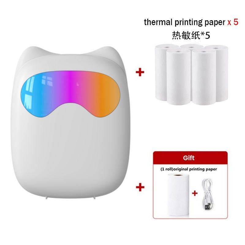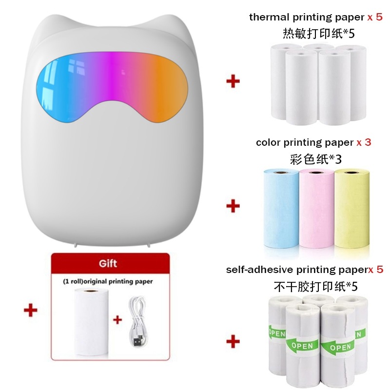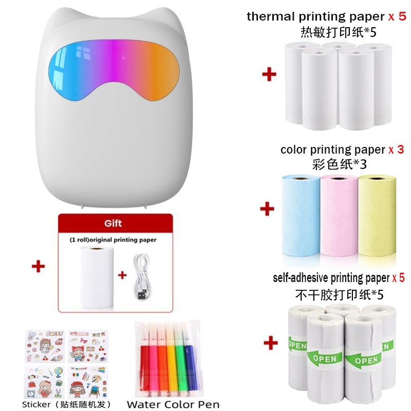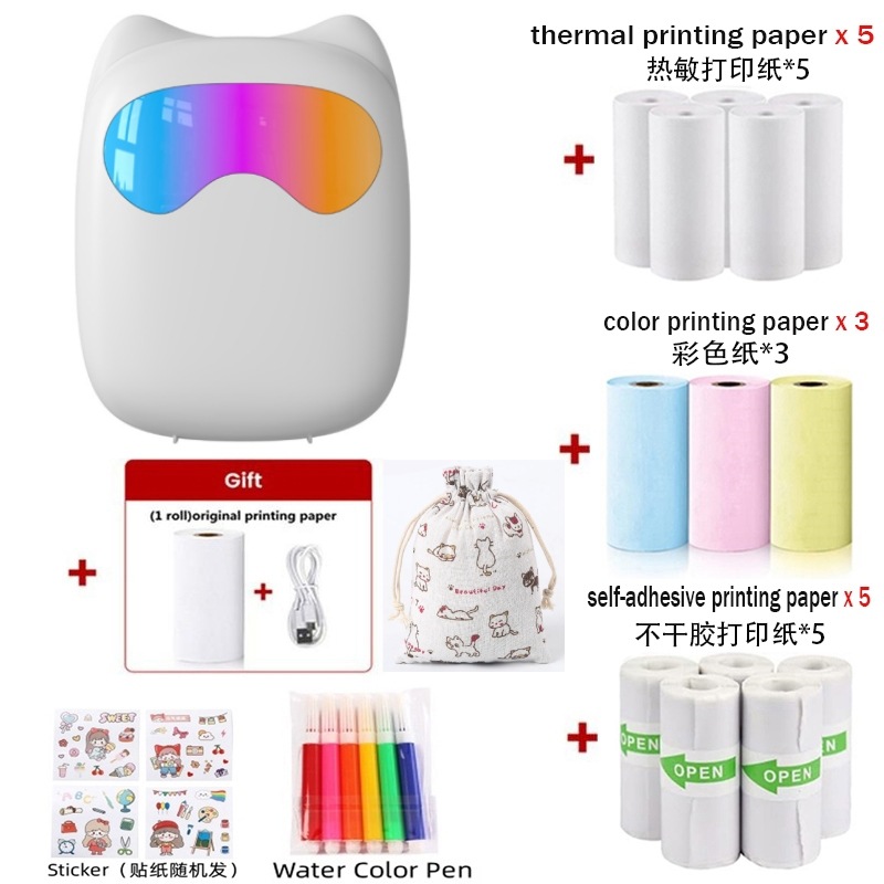 打印机1台+【自带1卷热敏纸+5卷热敏纸+5卷不干胶+3卷彩色纸+6支水彩笔+贴纸】为一整套。