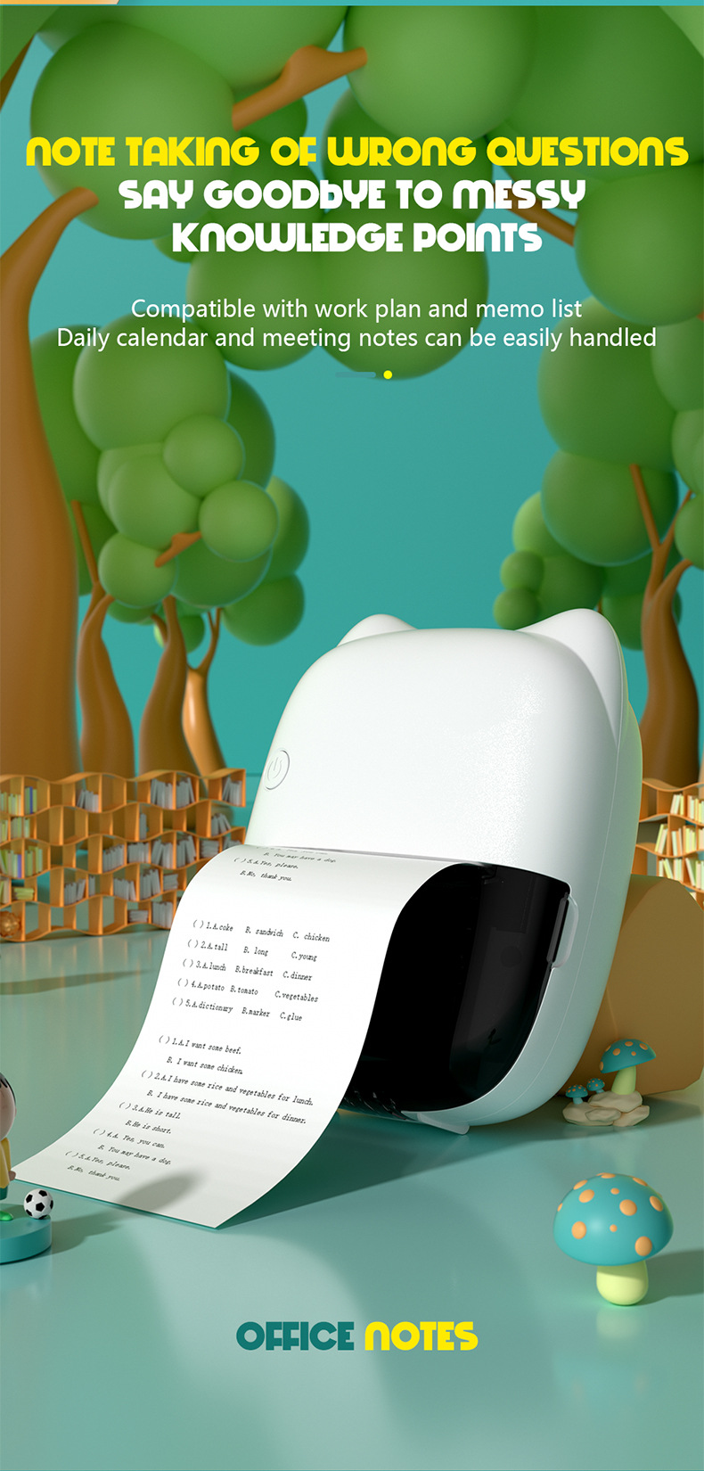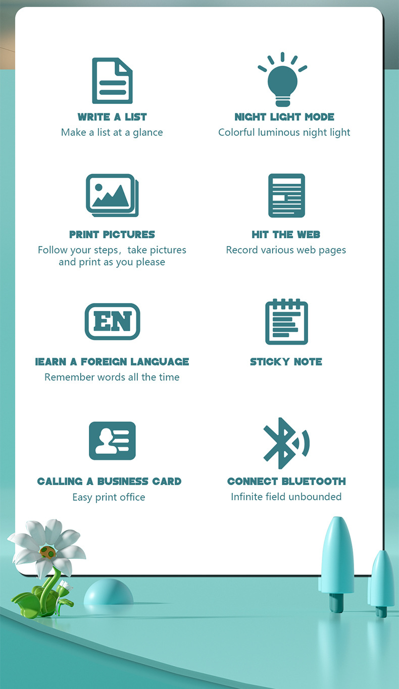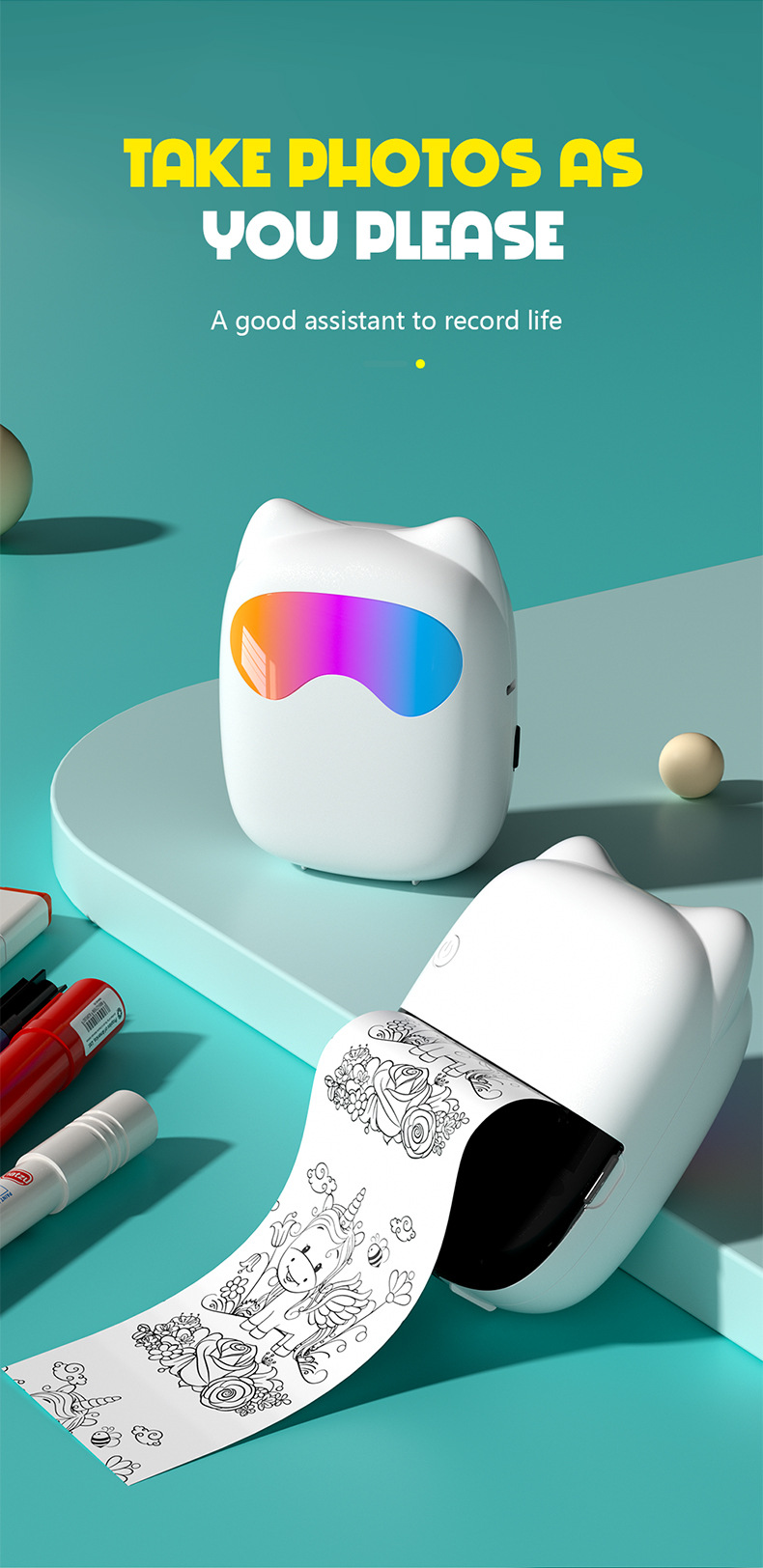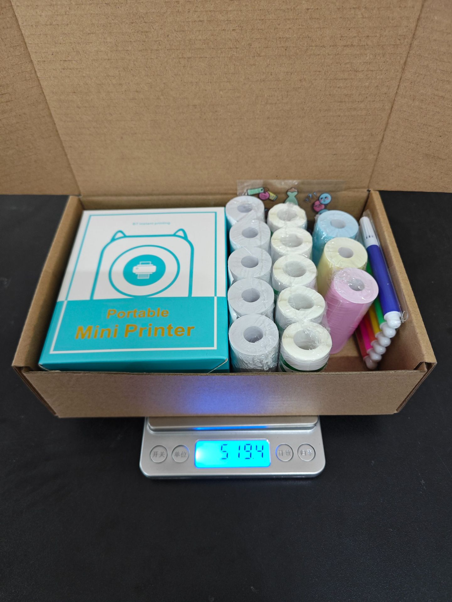 打印机1台+【自带1卷热敏纸+5卷热敏纸+5卷不干胶+3卷彩色纸+6支水彩笔+贴纸】为一整套。