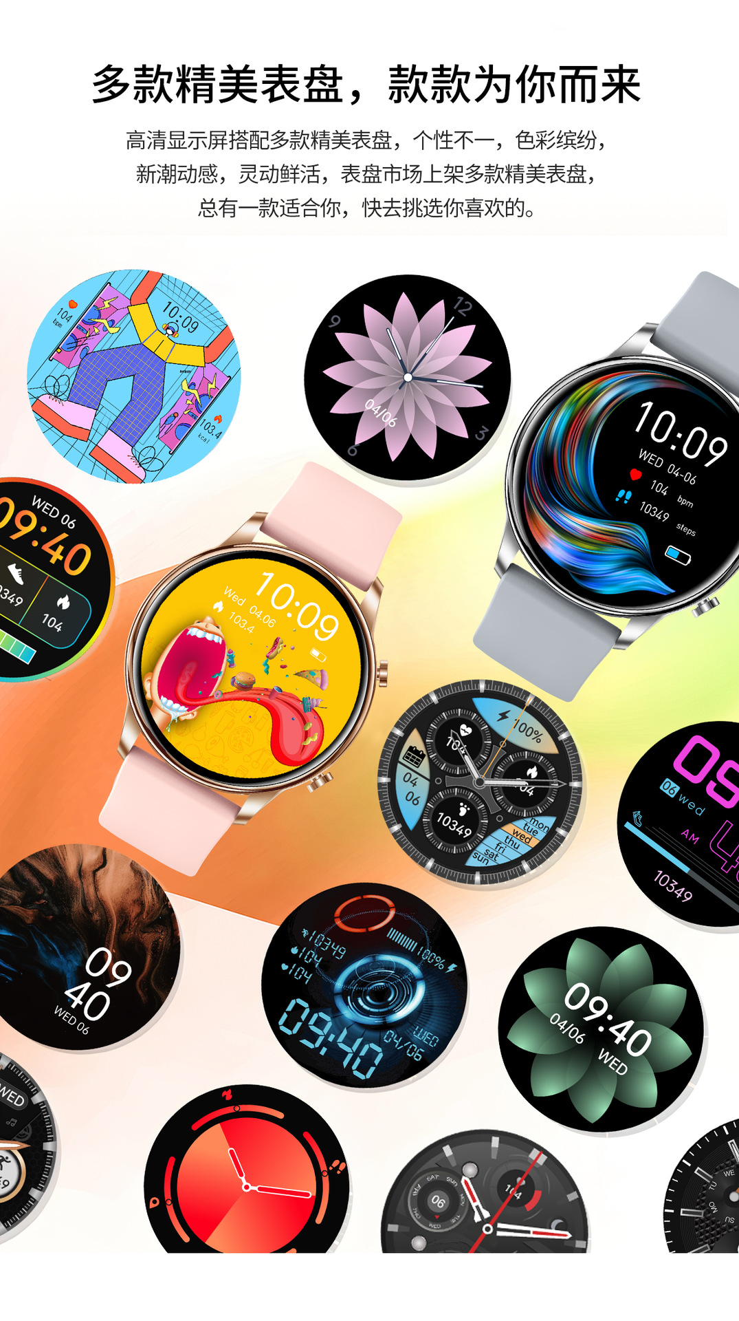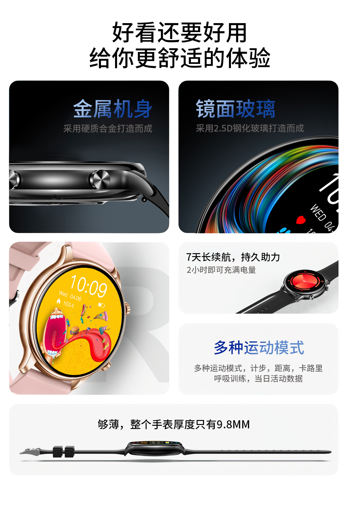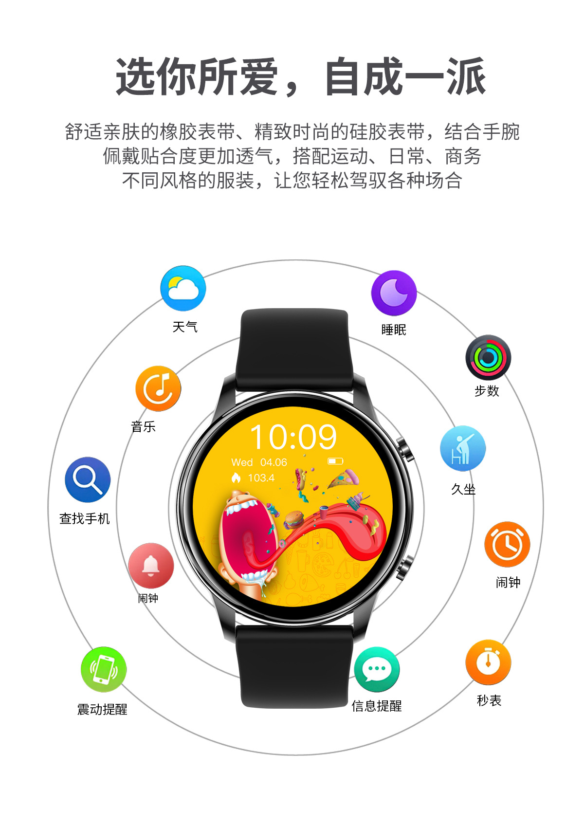 多运动模式 跑步,跳绳,骑行,乒乓球,羽毛球等,健走,登山,篮球,足球,开合跳,椭圆机,瑜伽,游泳。
