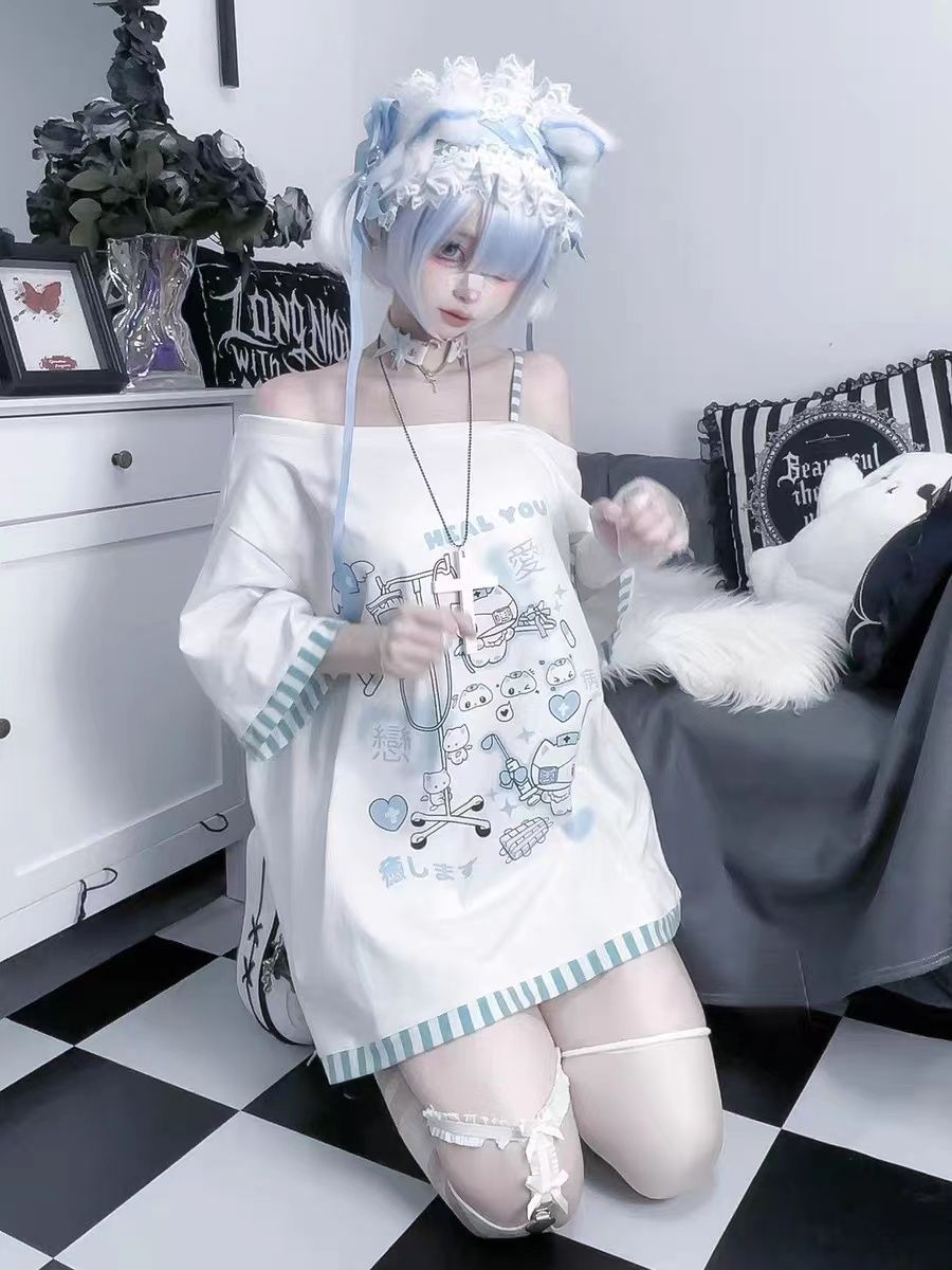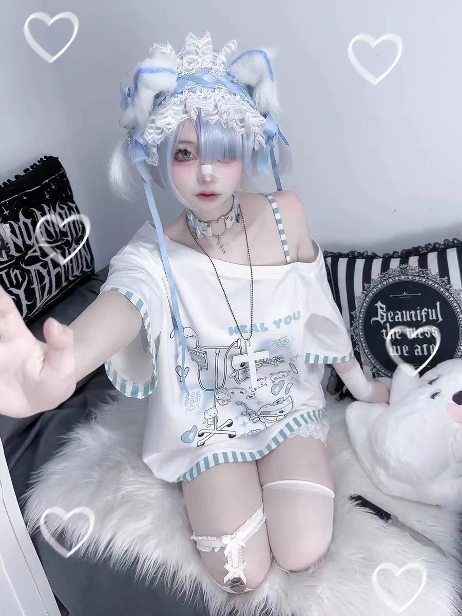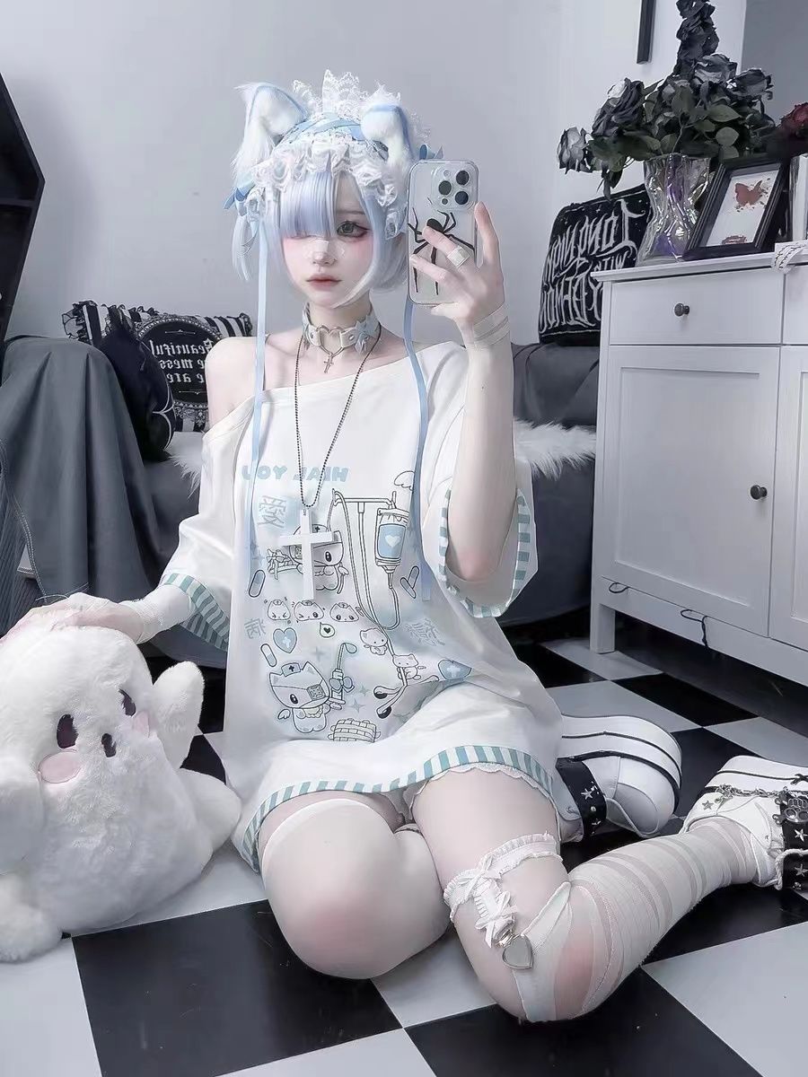 서브 컬쳐 y2k 밀레니엄 스파이스 소녀 질병 치료 새끼 고양이 줄무늬 비스듬한 칼라 어깨 매달려 물 컬러 인쇄 티셔츠 여성용 루즈 탑 트렌디스토어 가기