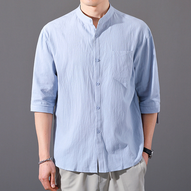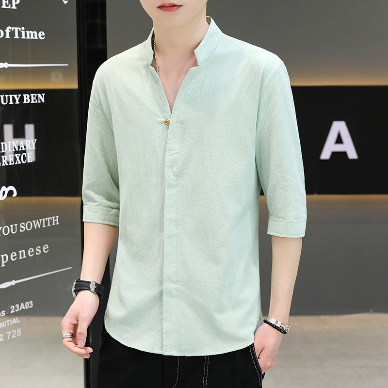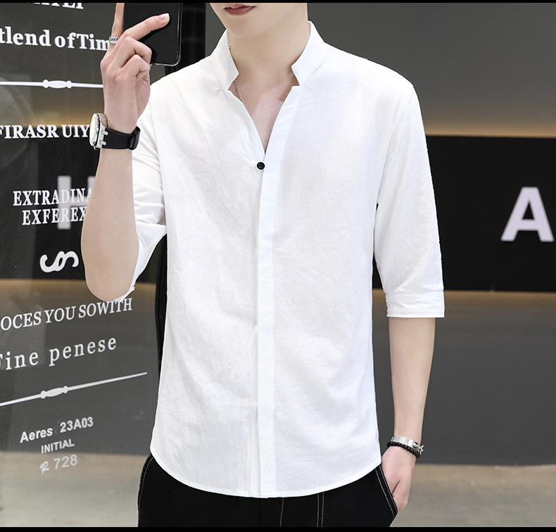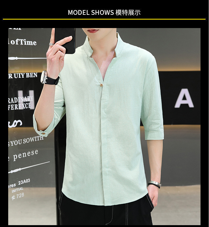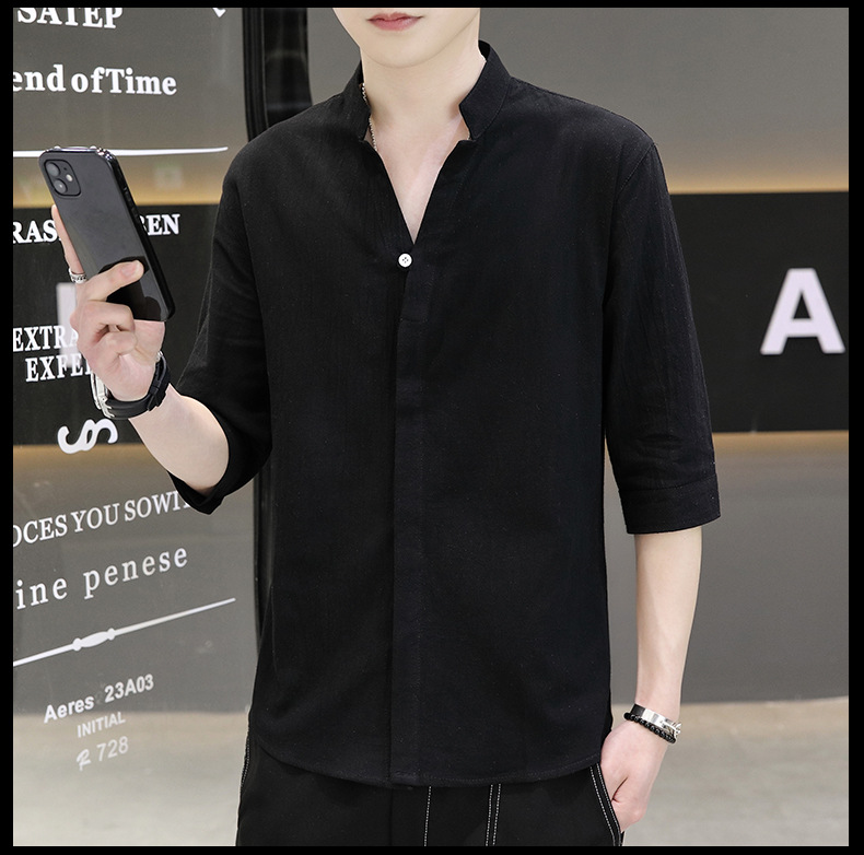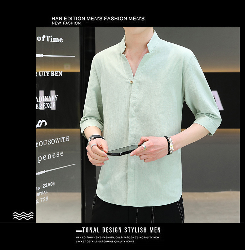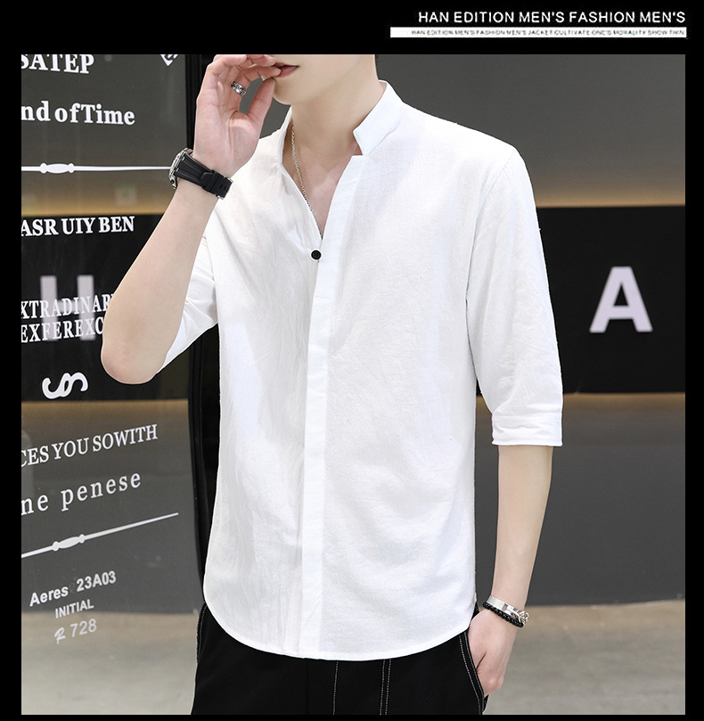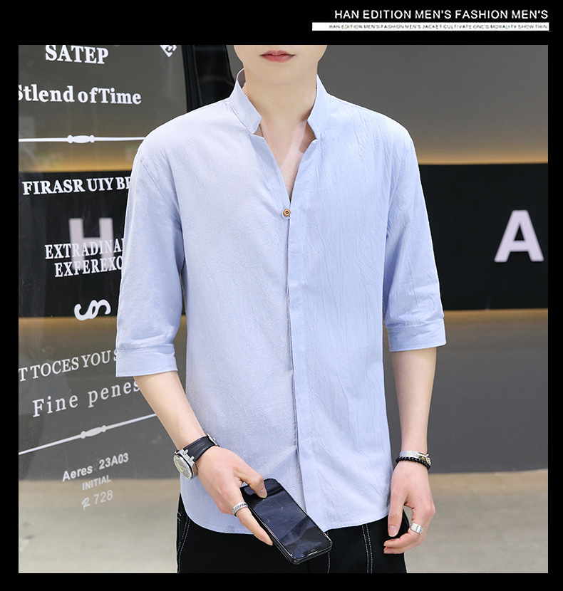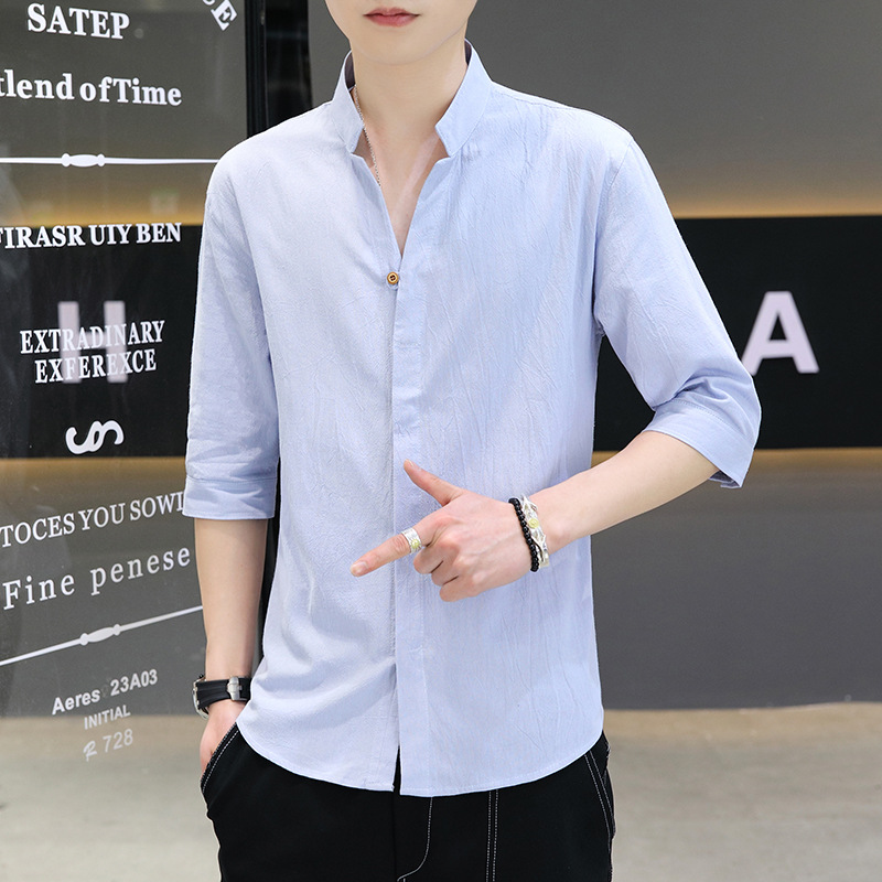 면 및 리넨 세븐 슬리브 셔츠 남자의 여름 유행 수직 칼라 핸즈섬 셔츠 남자의 하이 퀄리티 중간 소매 독특한 한국식 셔츠스토어 가기