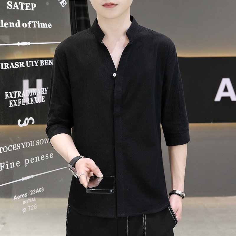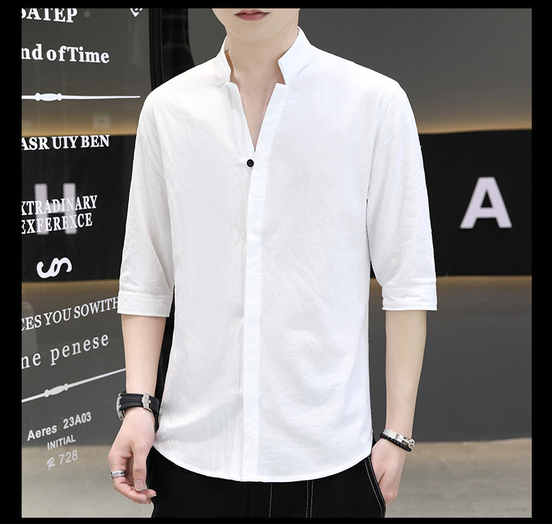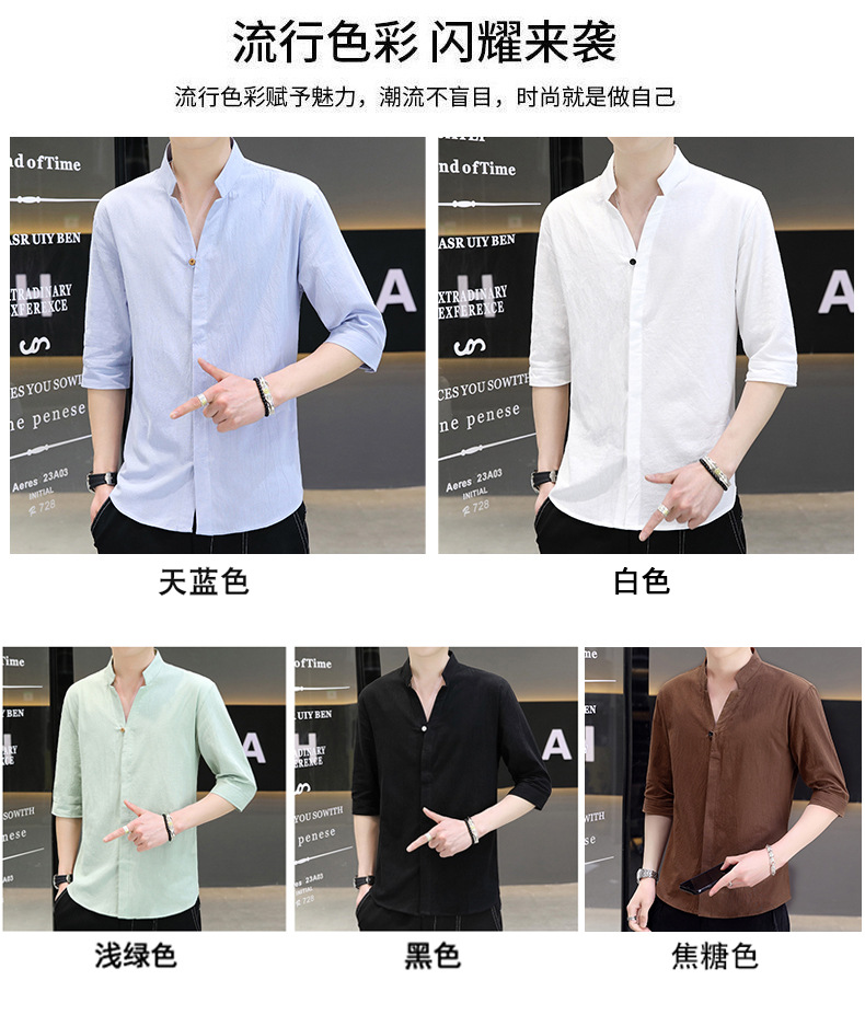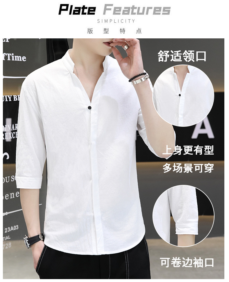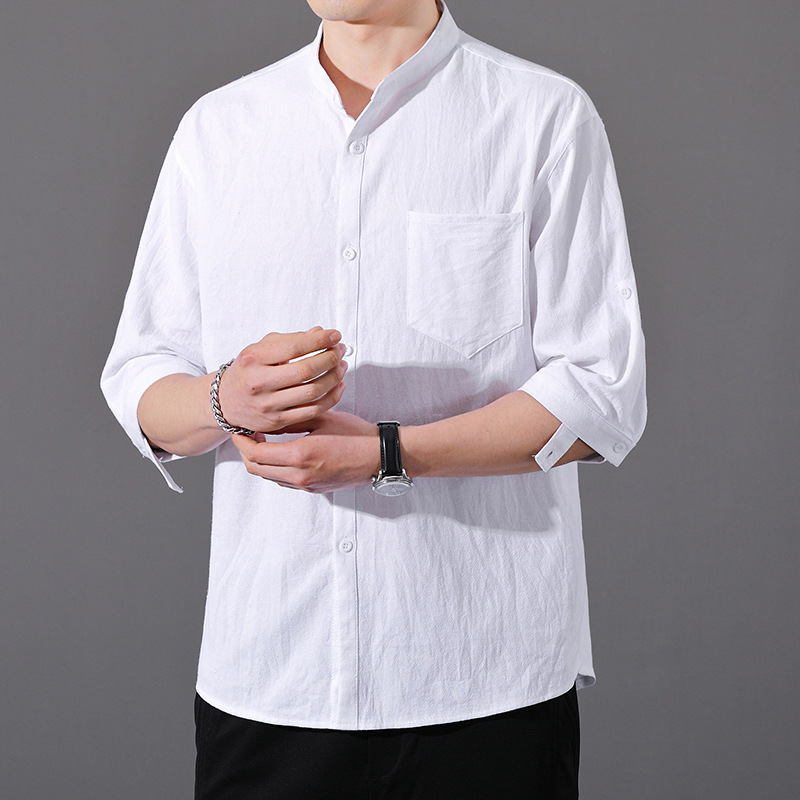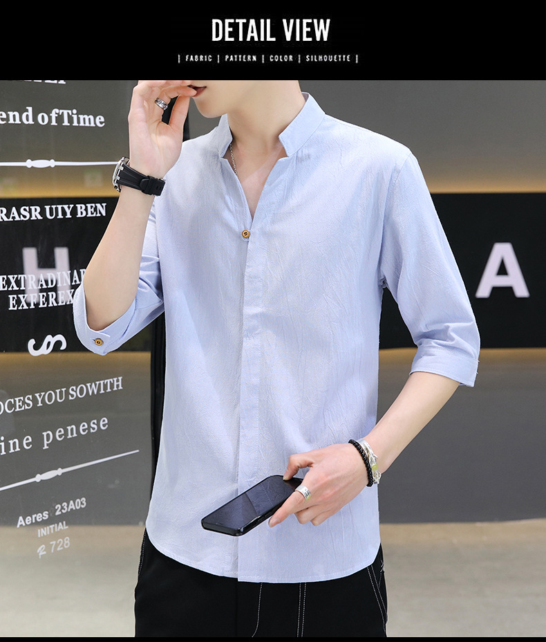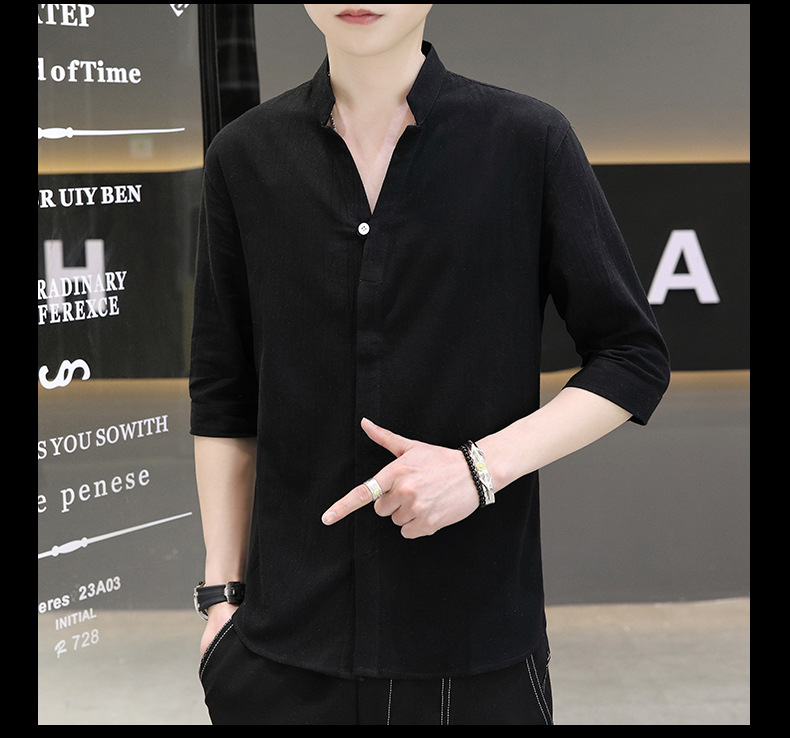 면 및 리넨 세븐 슬리브 셔츠 남자의 여름 유행 수직 칼라 핸즈섬 셔츠 남자의 하이 퀄리티 중간 소매 독특한 한국식 셔츠스토어 가기