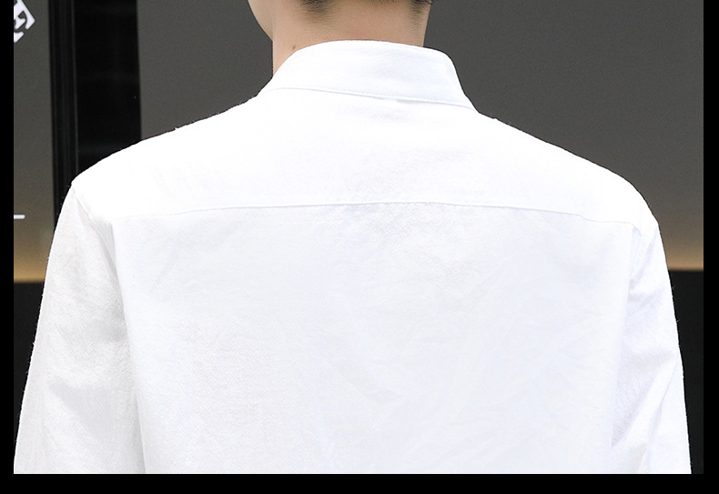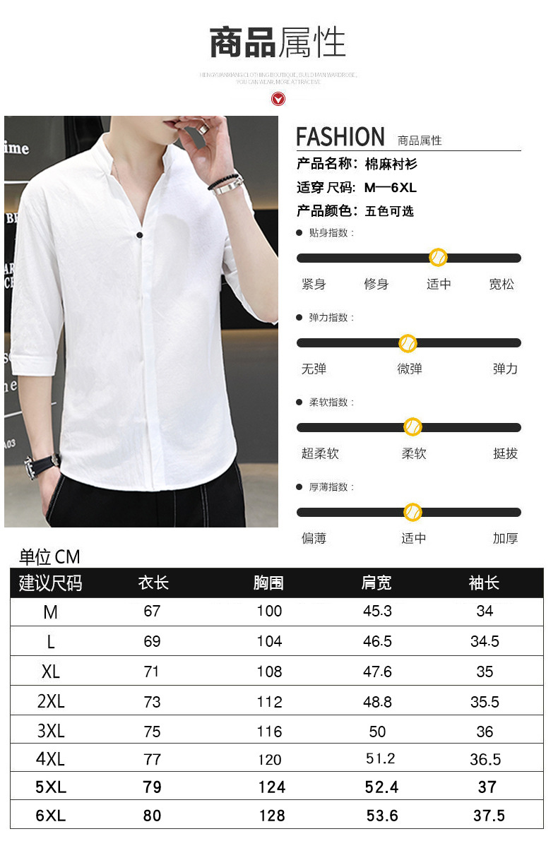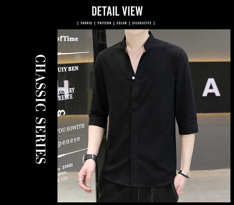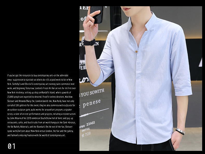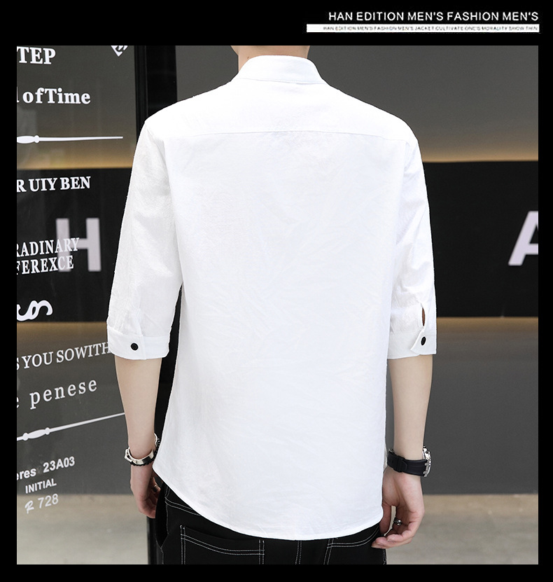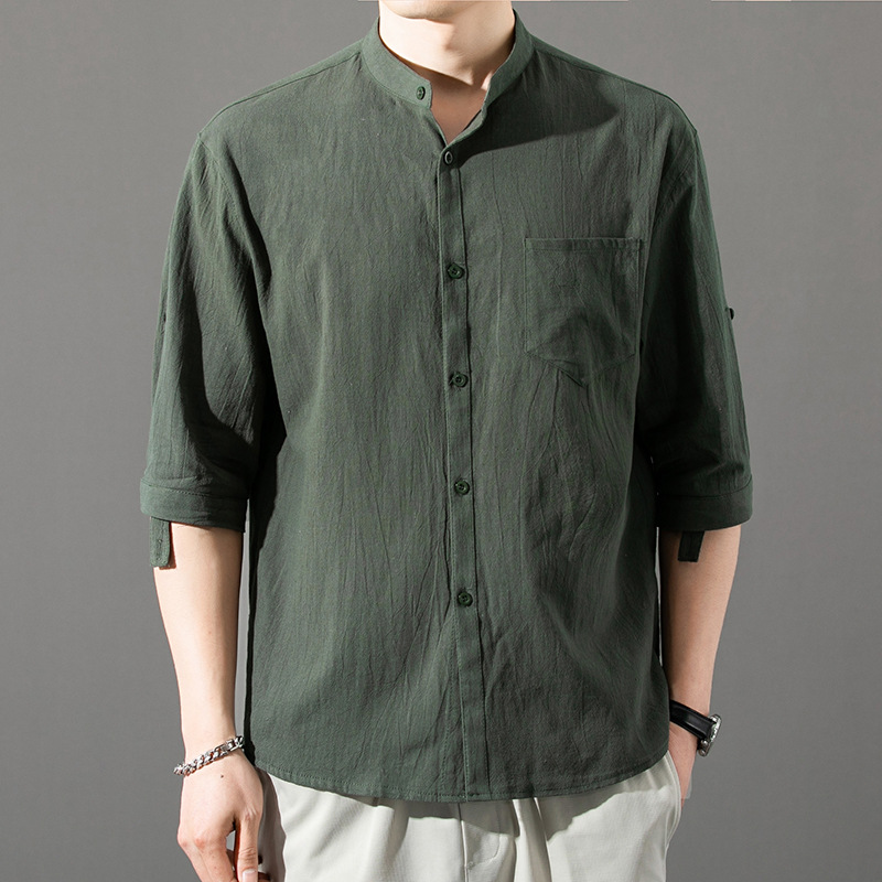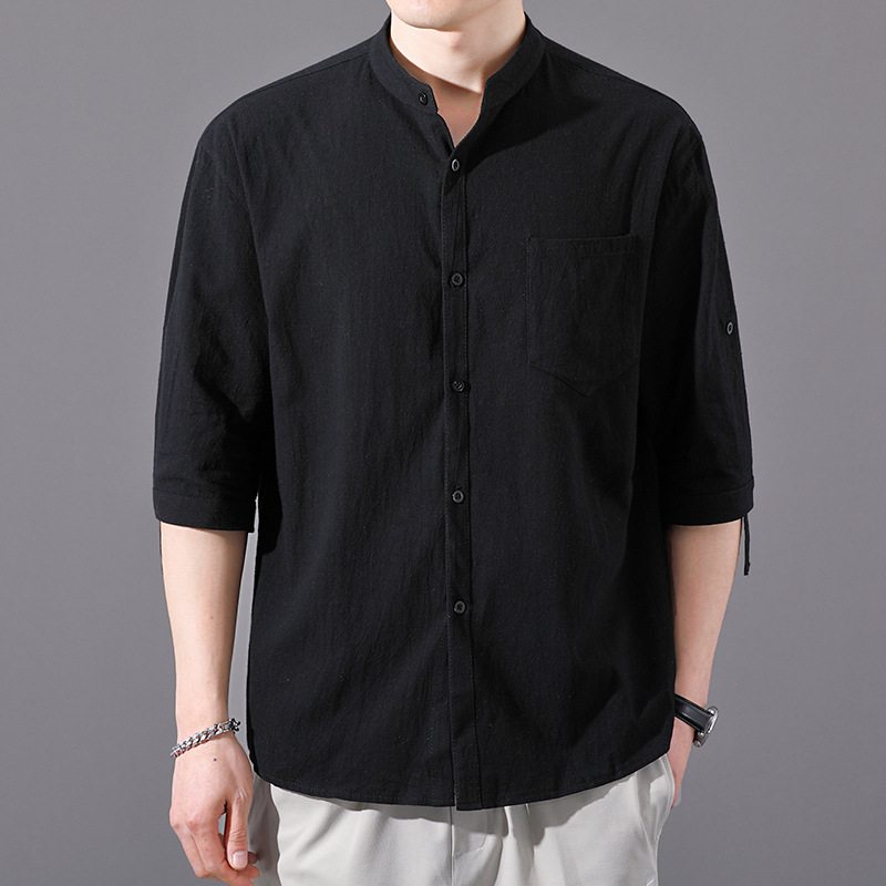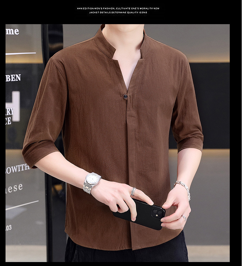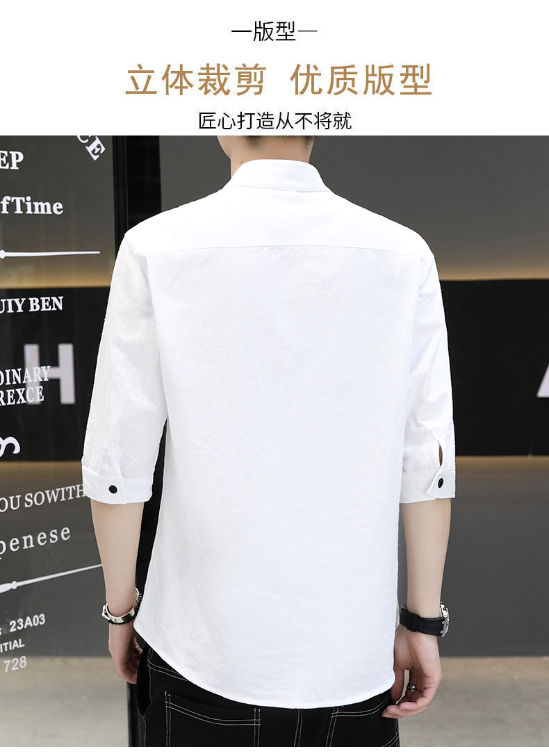 면 및 리넨 세븐 슬리브 셔츠 남자의 여름 유행 수직 칼라 핸즈섬 셔츠 남자의 하이 퀄리티 중간 소매 독특한 한국식 셔츠스토어 가기