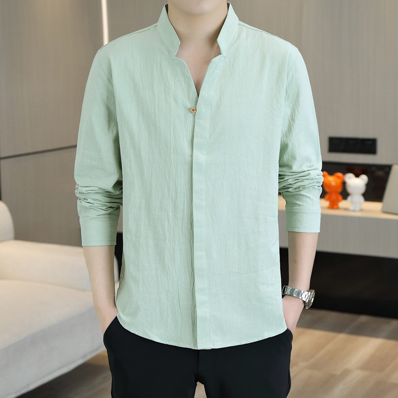 면 및 리넨 세븐 슬리브 셔츠 남자의 여름 유행 수직 칼라 핸즈섬 셔츠 남자의 하이 퀄리티 중간 소매 독특한 한국식 셔츠