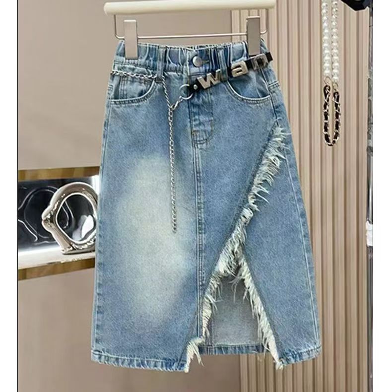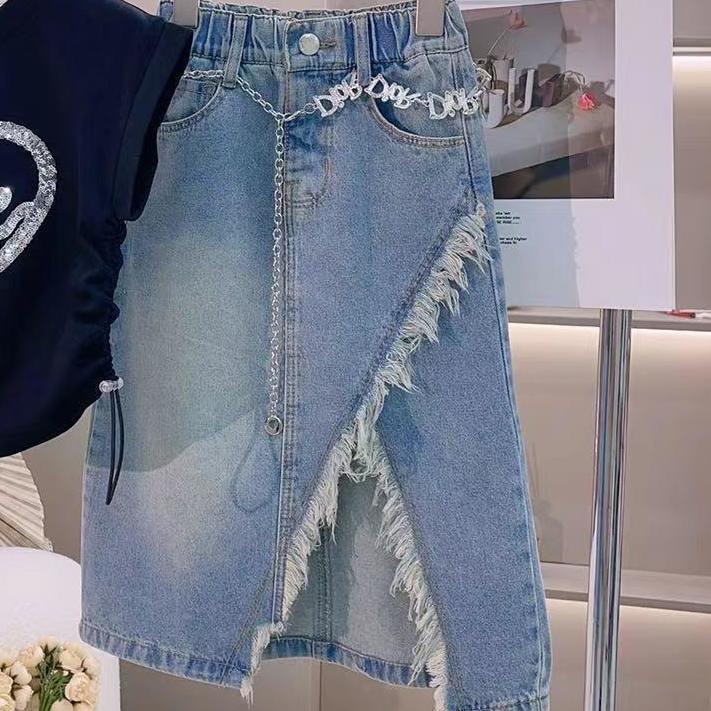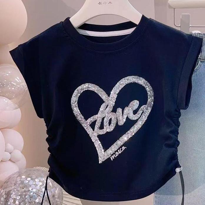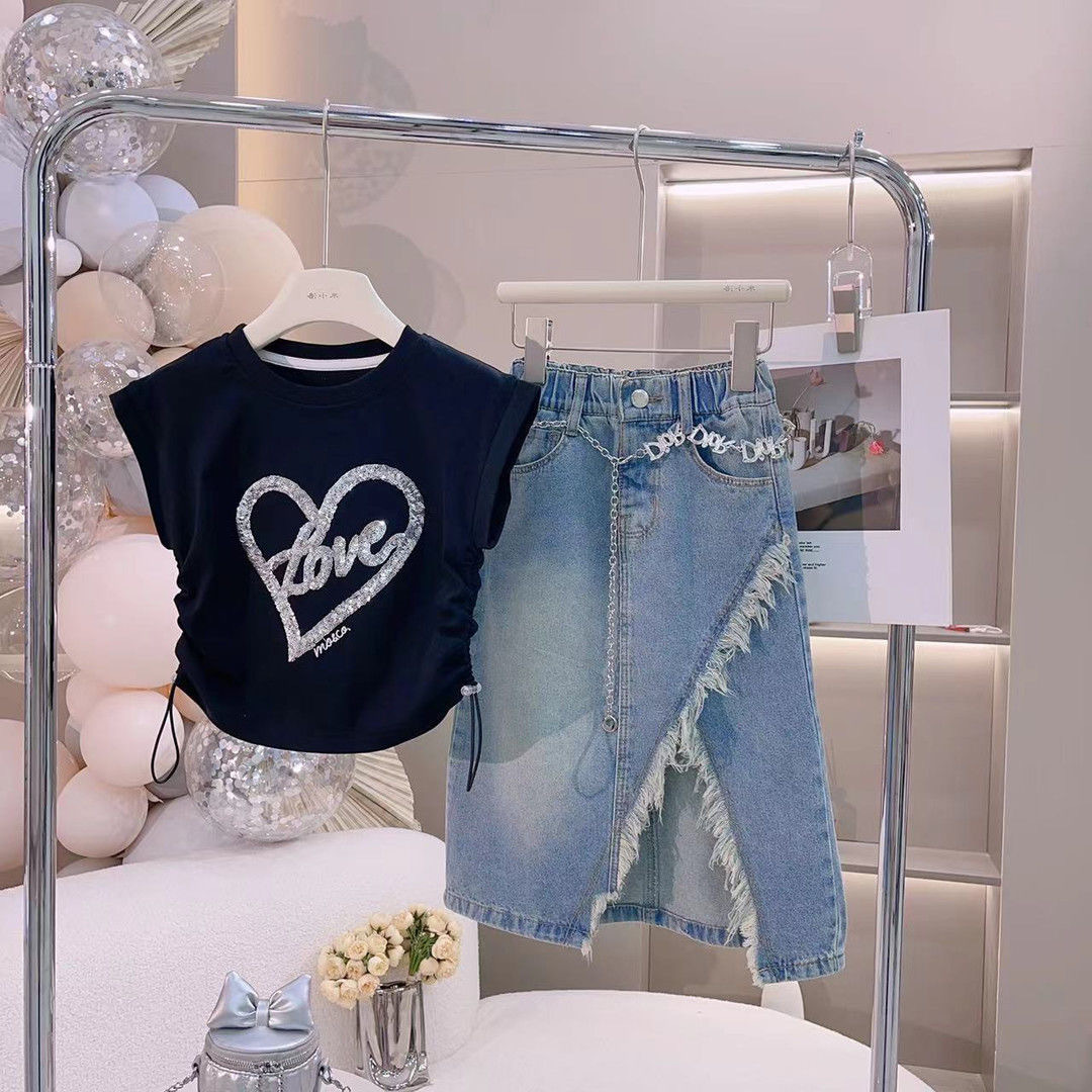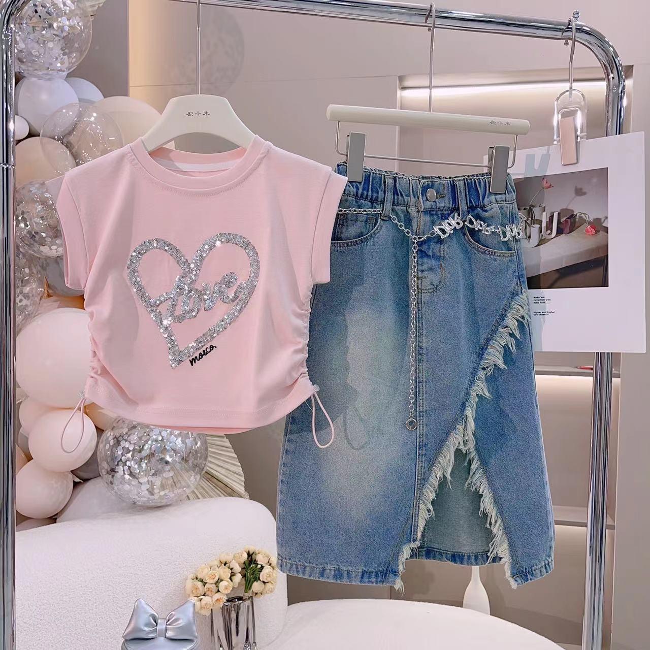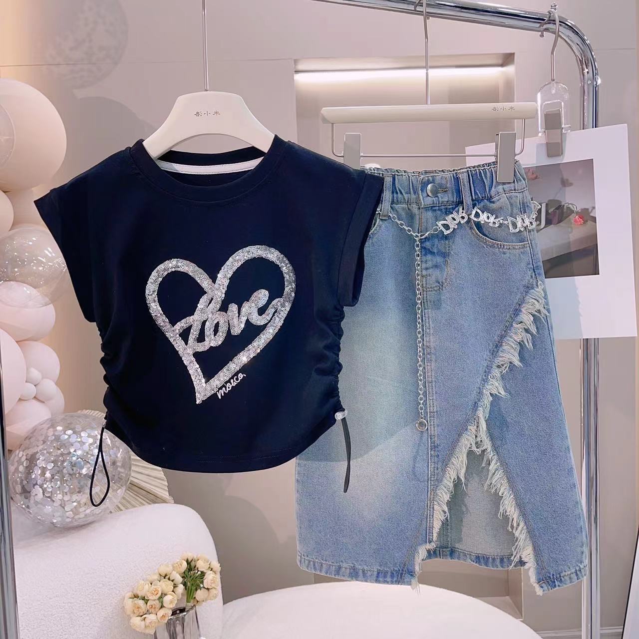 여자 여름 정장 2025 새로운 스타일 큰 어린이 스팽글 러브 티셔츠 데님 로우 엣지 스커트 투피스 세트