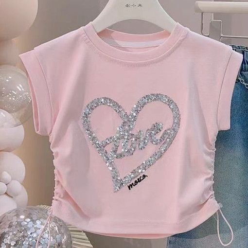 여자 여름 정장 2025 새로운 스타일 큰 어린이 스팽글 러브 티셔츠 데님 로우 엣지 스커트 투피스 세트스토어 가기