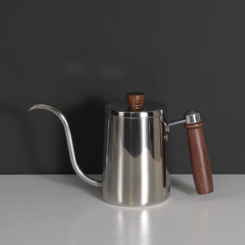 • 긴 주둥이와 나무 손잡이가있는 실버 커피 포트