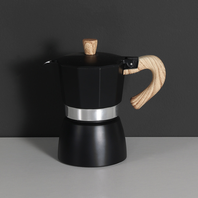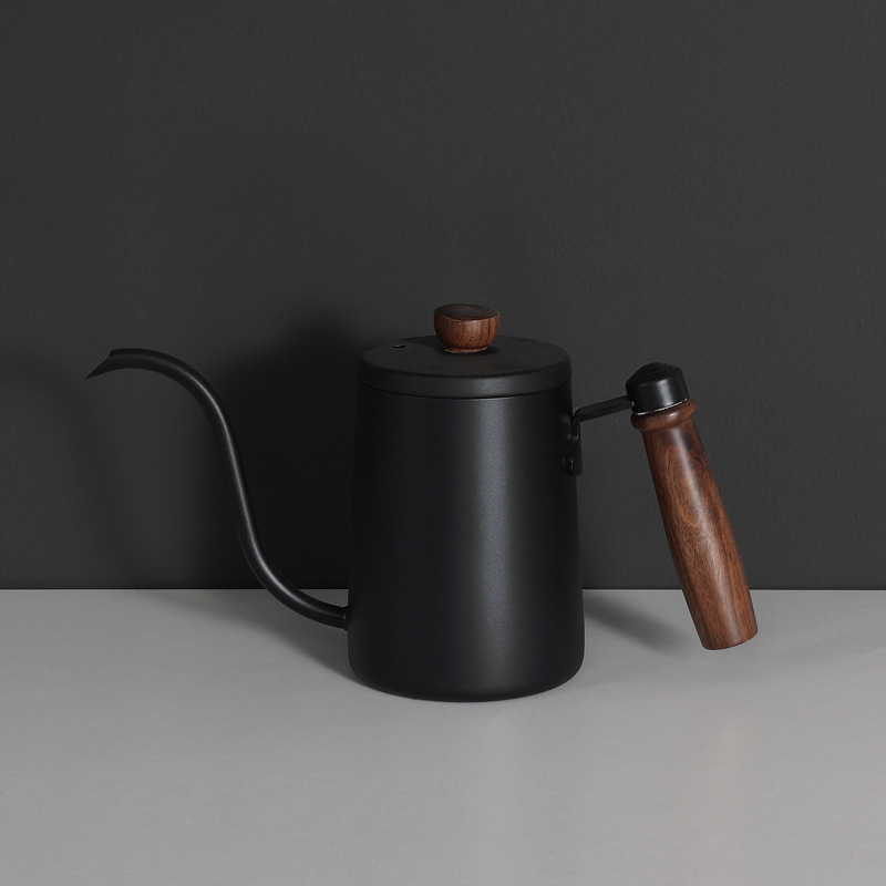 • 긴 부리와 나무 손잡이가있는 검은 커피 냄비