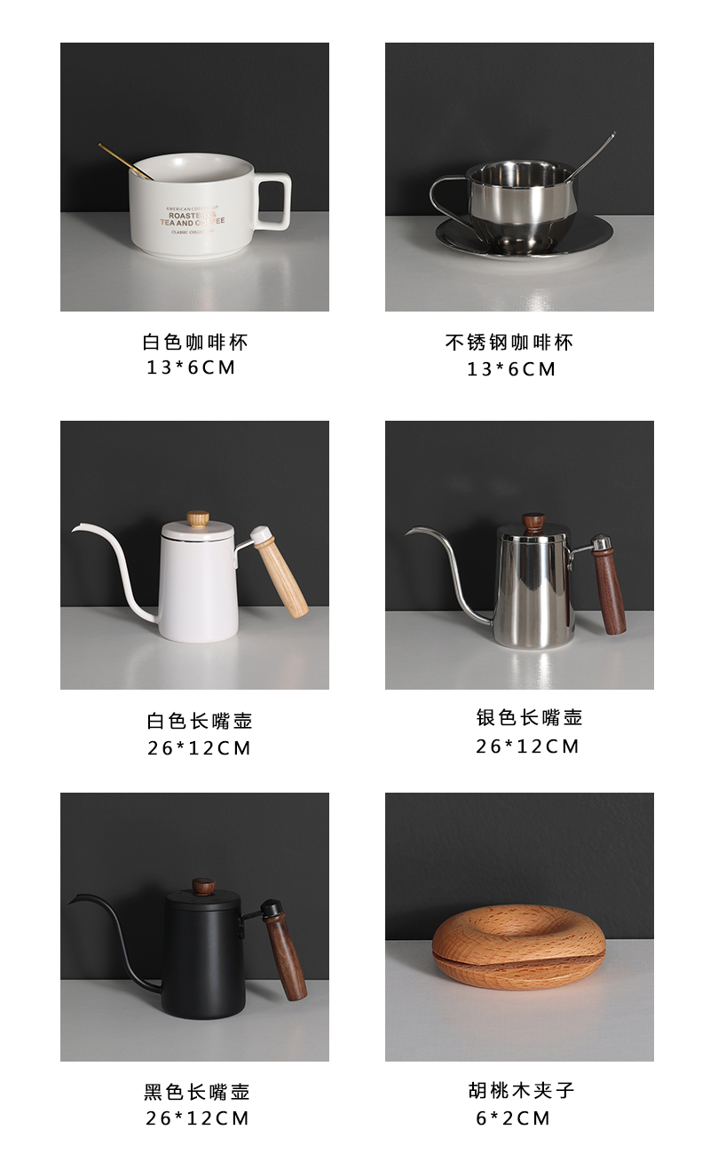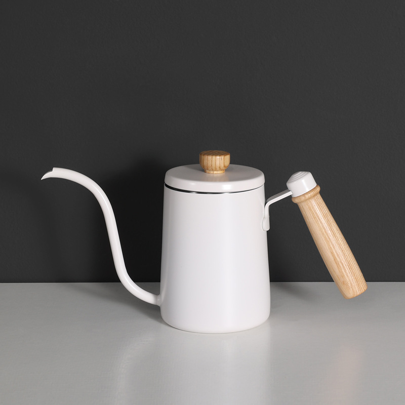 • 긴 부리와 나무 손잡이가있는 흰색 커피 냄비