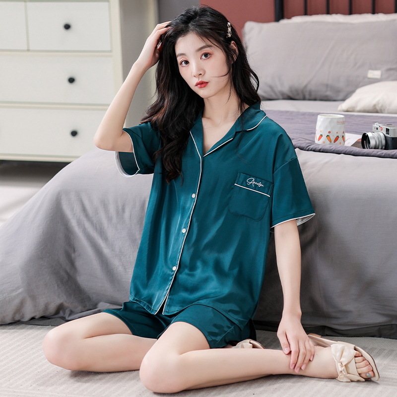 폭발 여성 잠옷 여름 얇은 아이스 실크 짧은 소매 반바지 캐주얼 카디건 여름 겉옷 홈 의류 세트스토어 가기