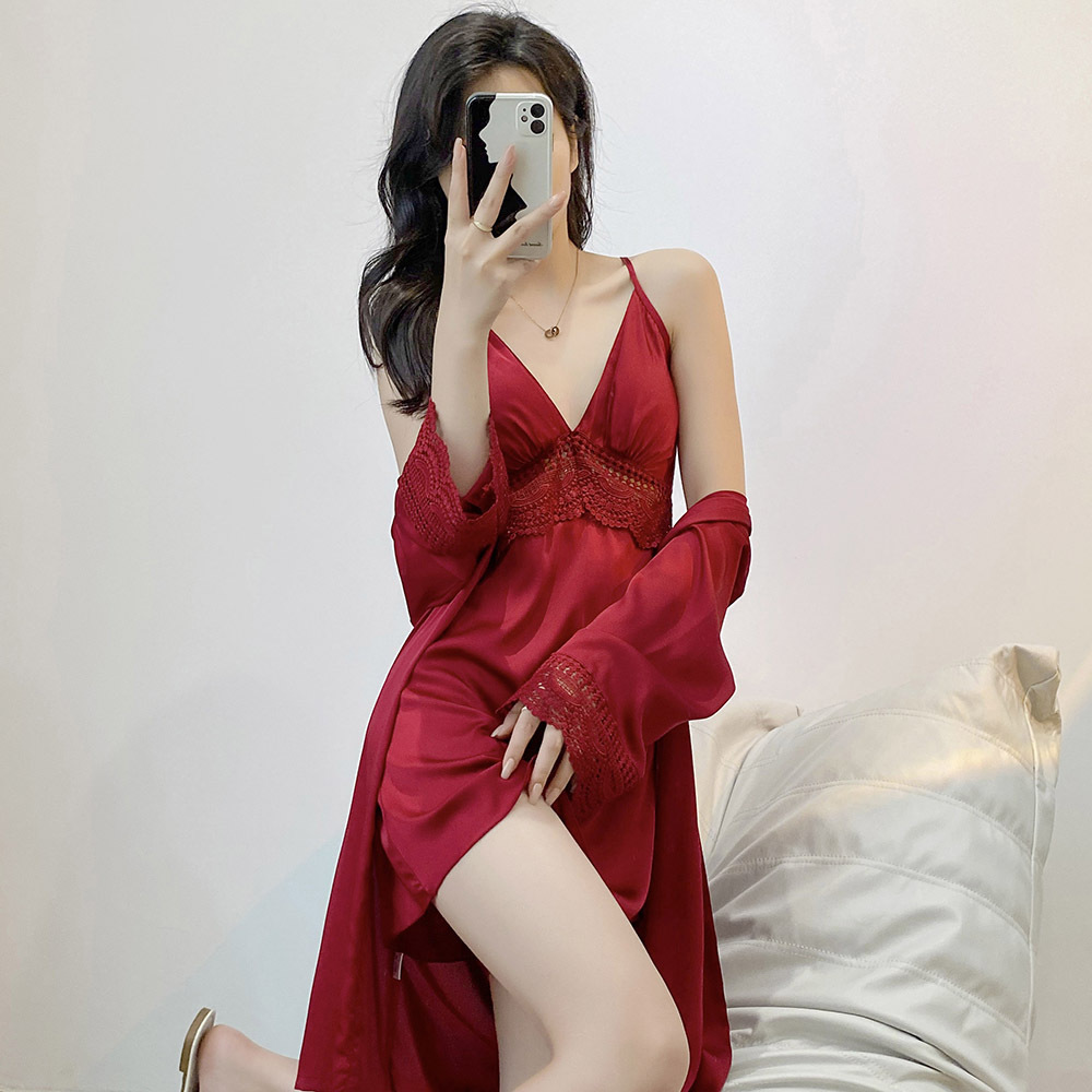 • [2 피스 세트] 버건디-새틴 (나이트 드레스 로브)