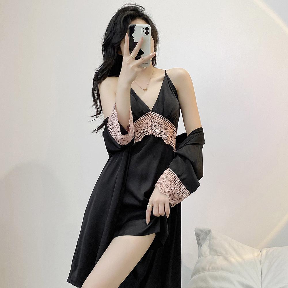 아이스 실크 여성의 봄과 여름 섹시한 잠옷 얇은 긴팔 잠옷 투피스 세트 아름다운 뒷집 옷 아이스 실크 잠옷