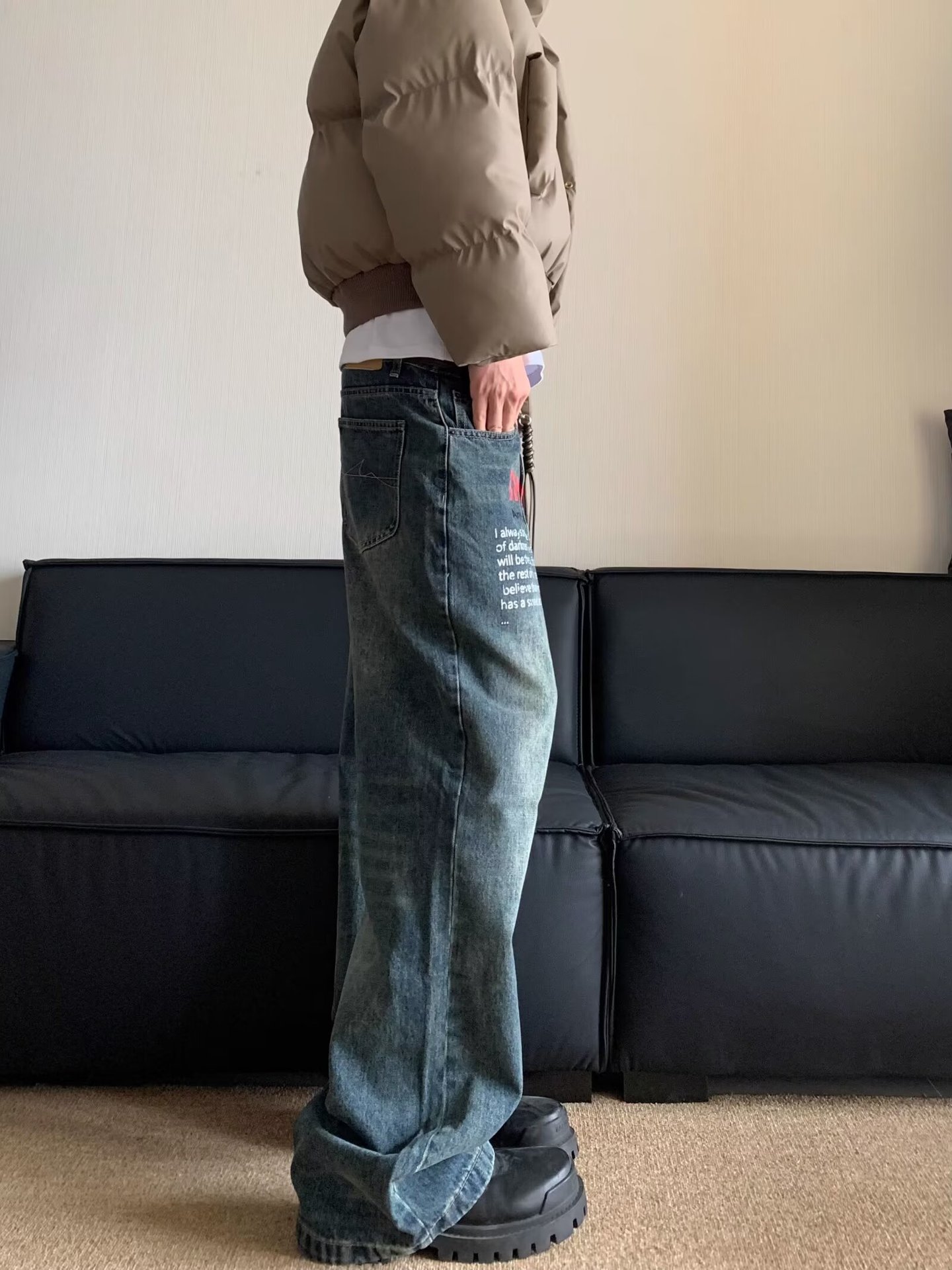 아메리칸 레트로 청바지 남성용 봄과 여름 새로운 세탁 된 오래된 느슨한 스트레이트 바지 유행 브랜드 틈새 디자인 캐주얼 바지스토어 가기