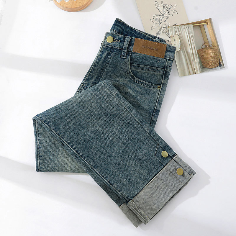 새로운 스티칭 청바지 여성용 틈새 디자인 가죽 라벨 높은 허리 슬림-핏 스트레치 스트레이트 파이프 자른 빈티지 바지