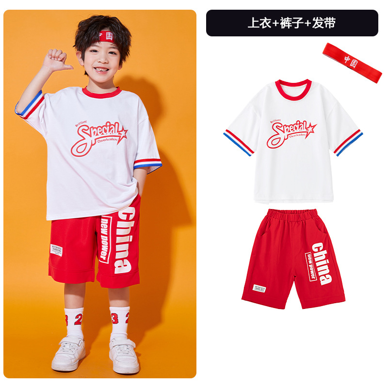 • DL13 소년 빨간 리본 짧은 소매 빨간 중국 반바지 빨간 중국 머리 밴드 흰색 튜브 양말