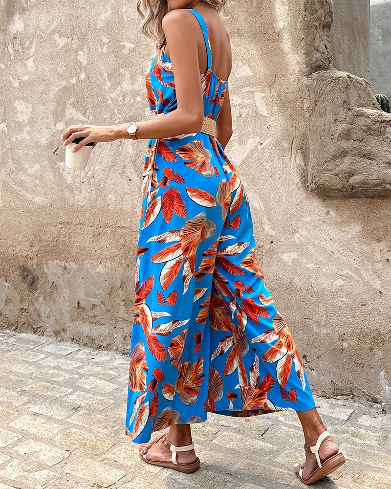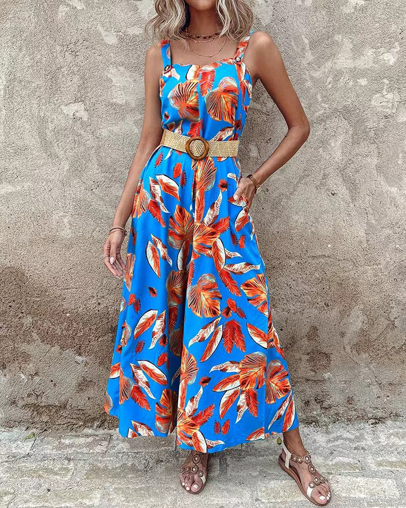 국경 간 대외 무역 여성 의류 아마존 2024 패션 프린트 스트랩 와이드 레그 팬츠 스트랩 허리 허리 점프 수트 벨트