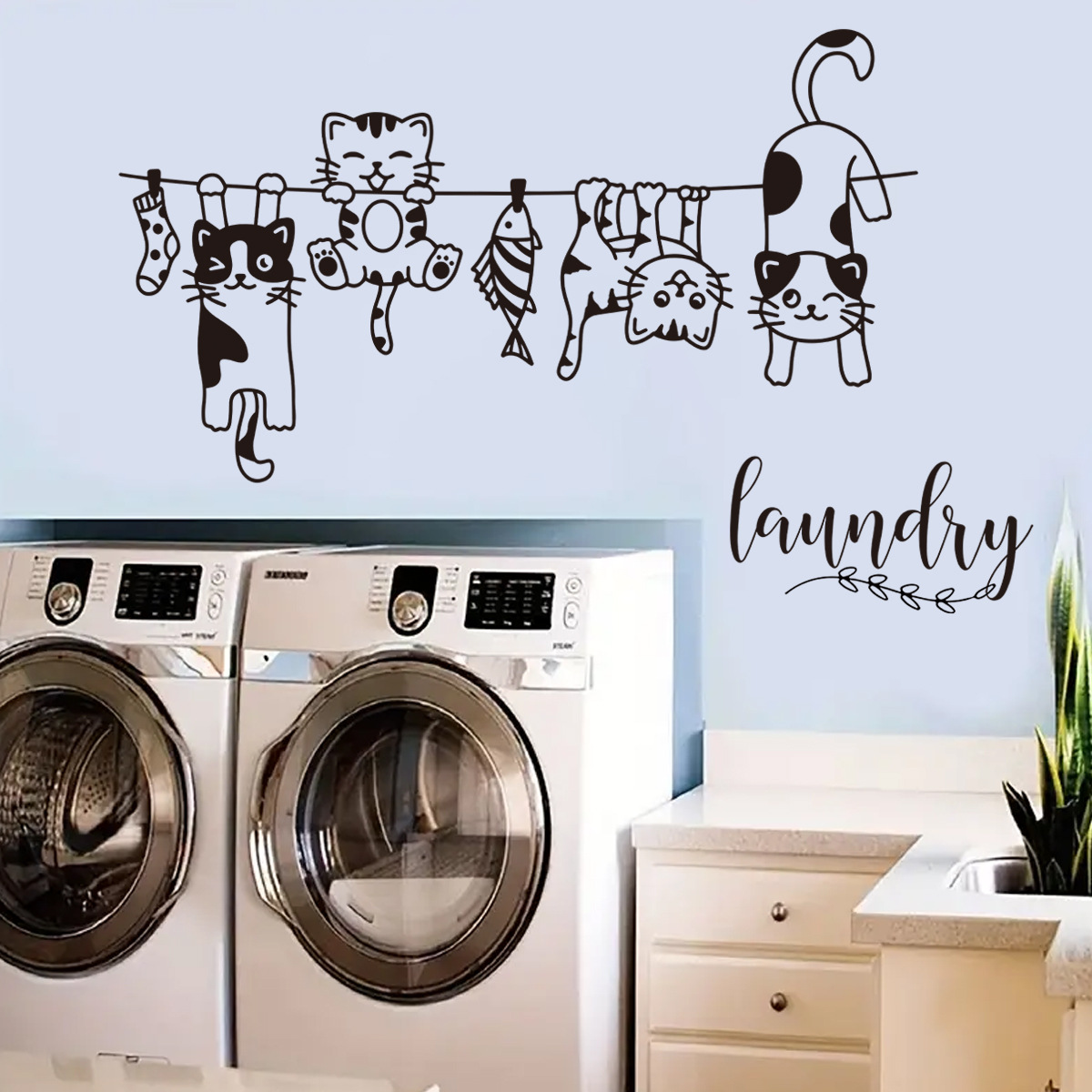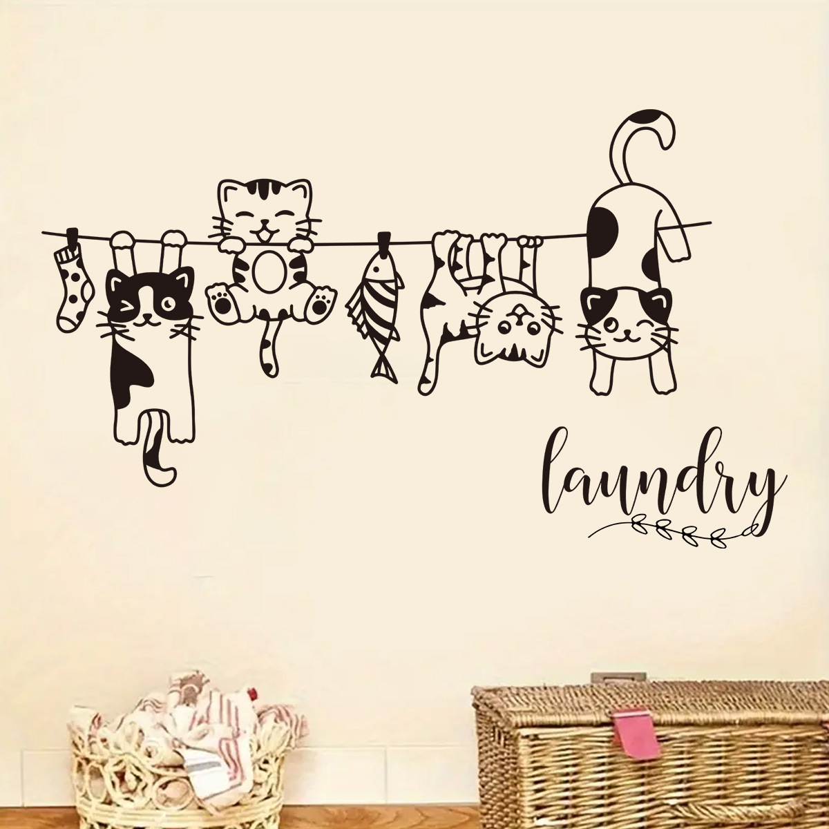 귀여운 고양이 빨랫줄 자체 접착 벽 스티커 만화 어린이 세탁실 배경 벽 장식 스티커 BR0323E스토어 가기