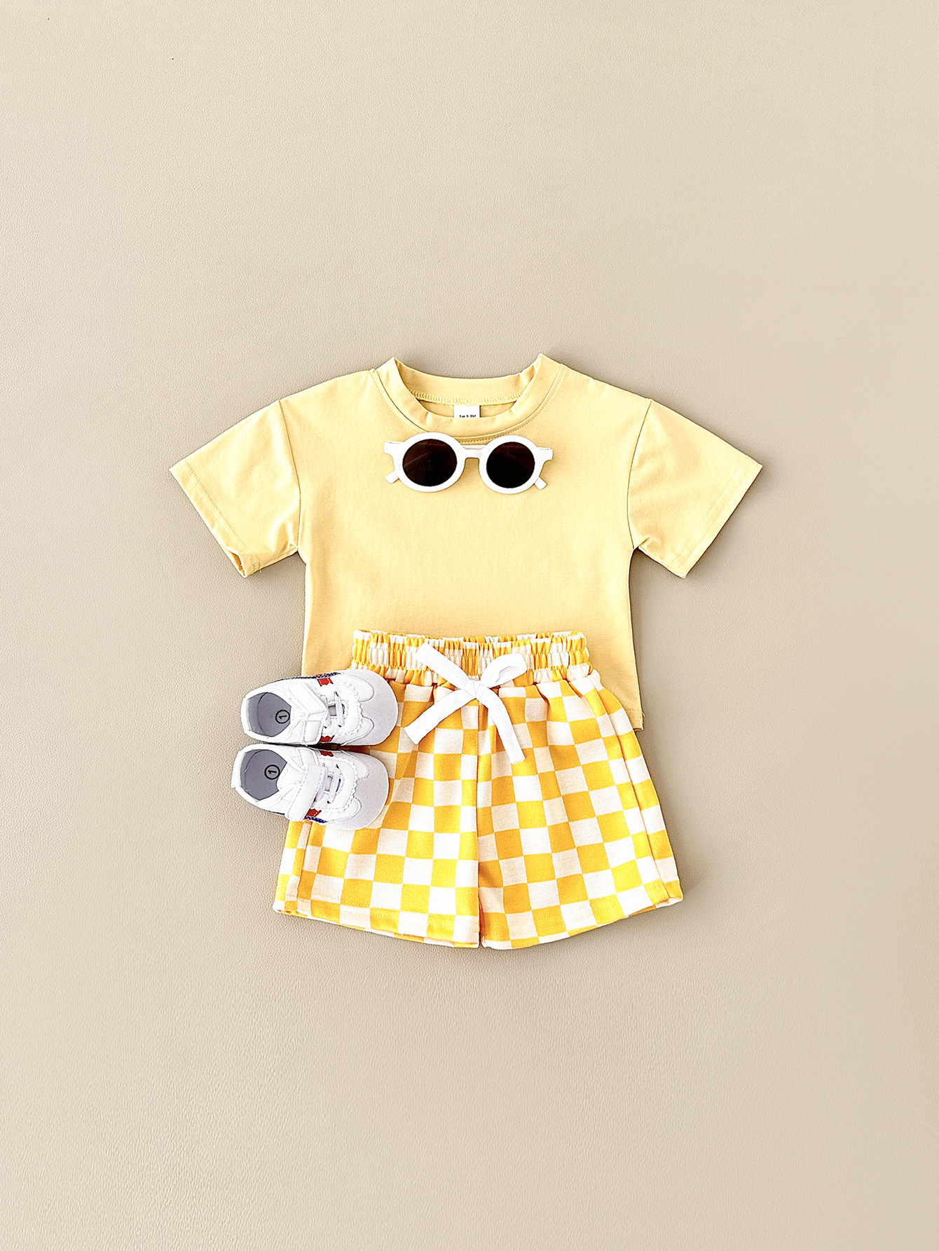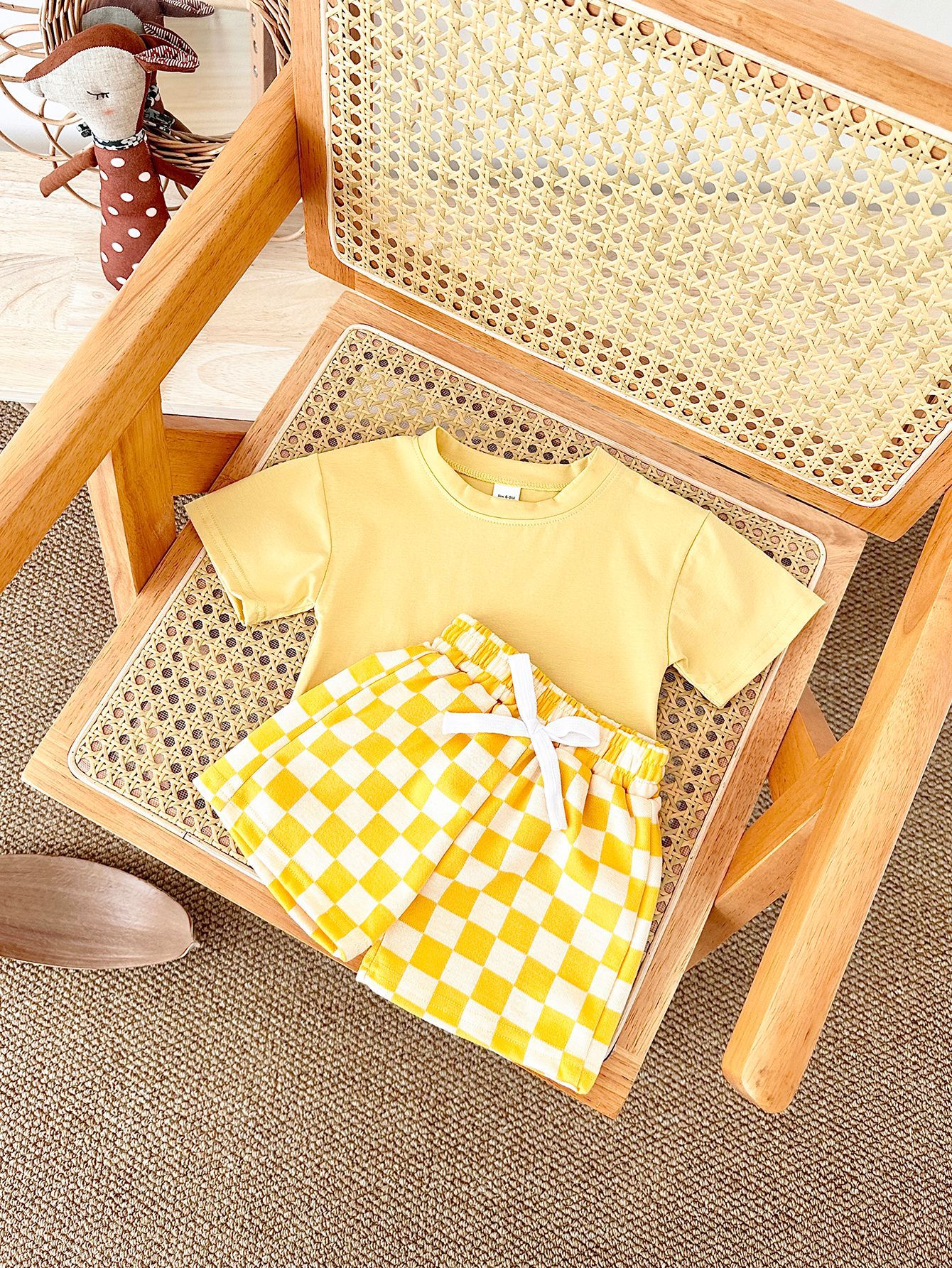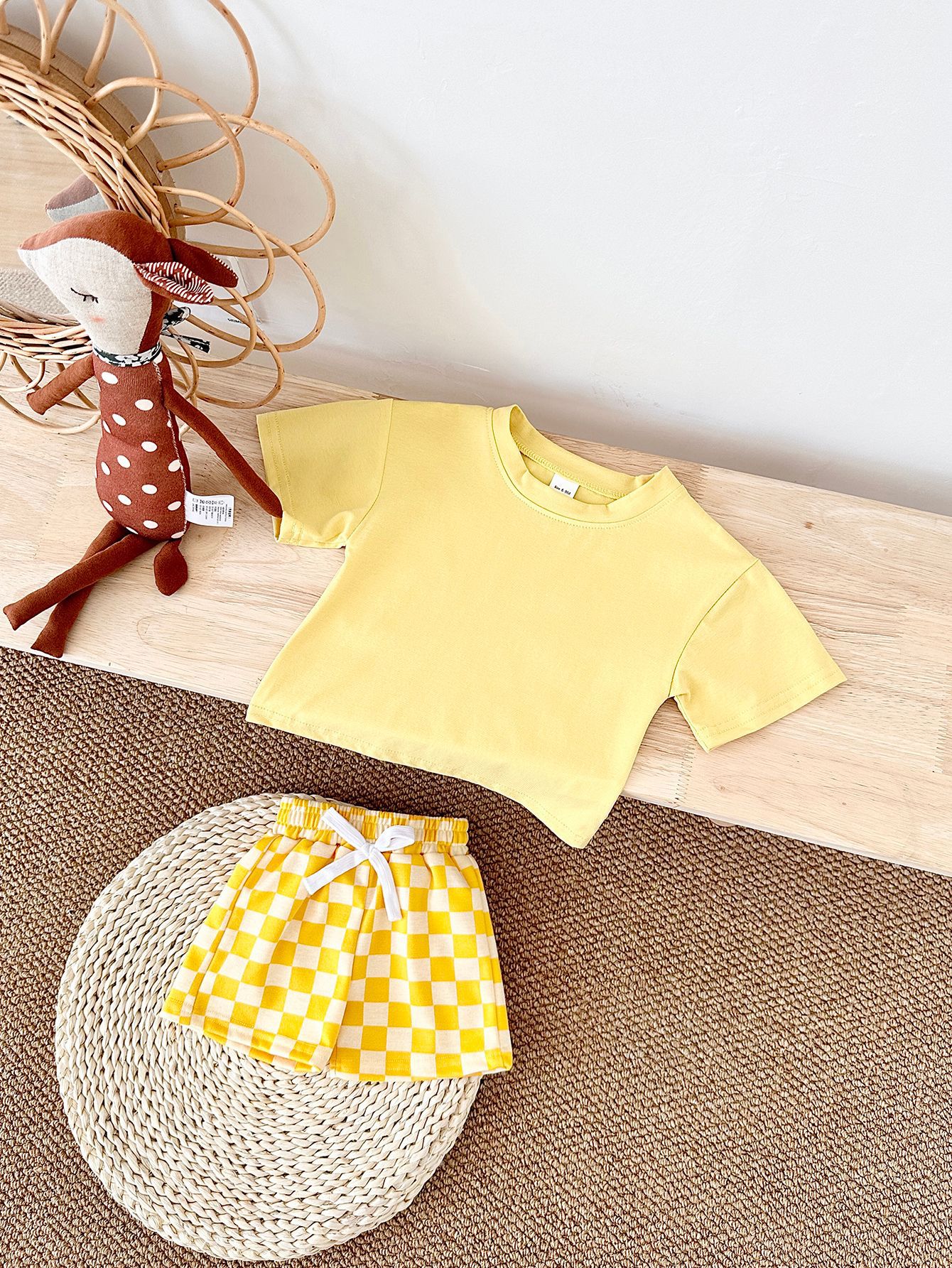 어린이 캐주얼 여름 세트 아기 체크 보드 바지 투피스 솔리드 컬러 티셔츠 의류 크로스 보더 핫 세일