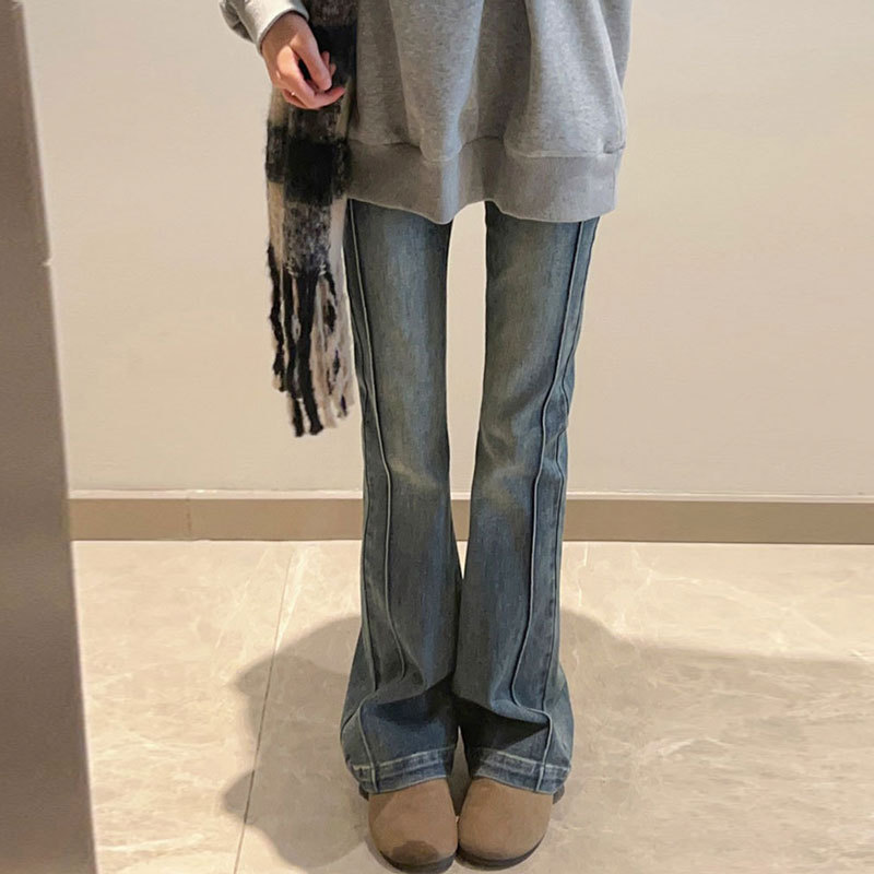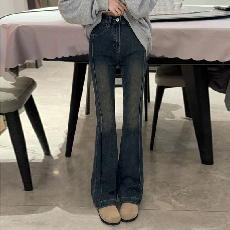 데님 바지 여성의 새로운 블루 그레이 작은 높은 허리 말굽 바지 슬림 핏 스트레치 스티칭 디자인 경적 바지스토어 가기