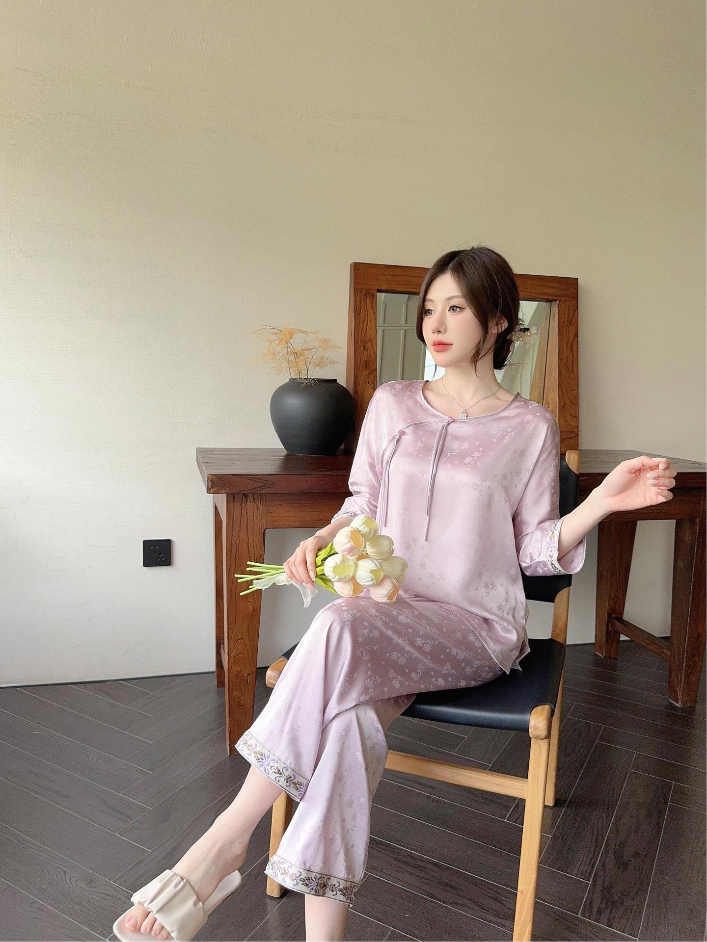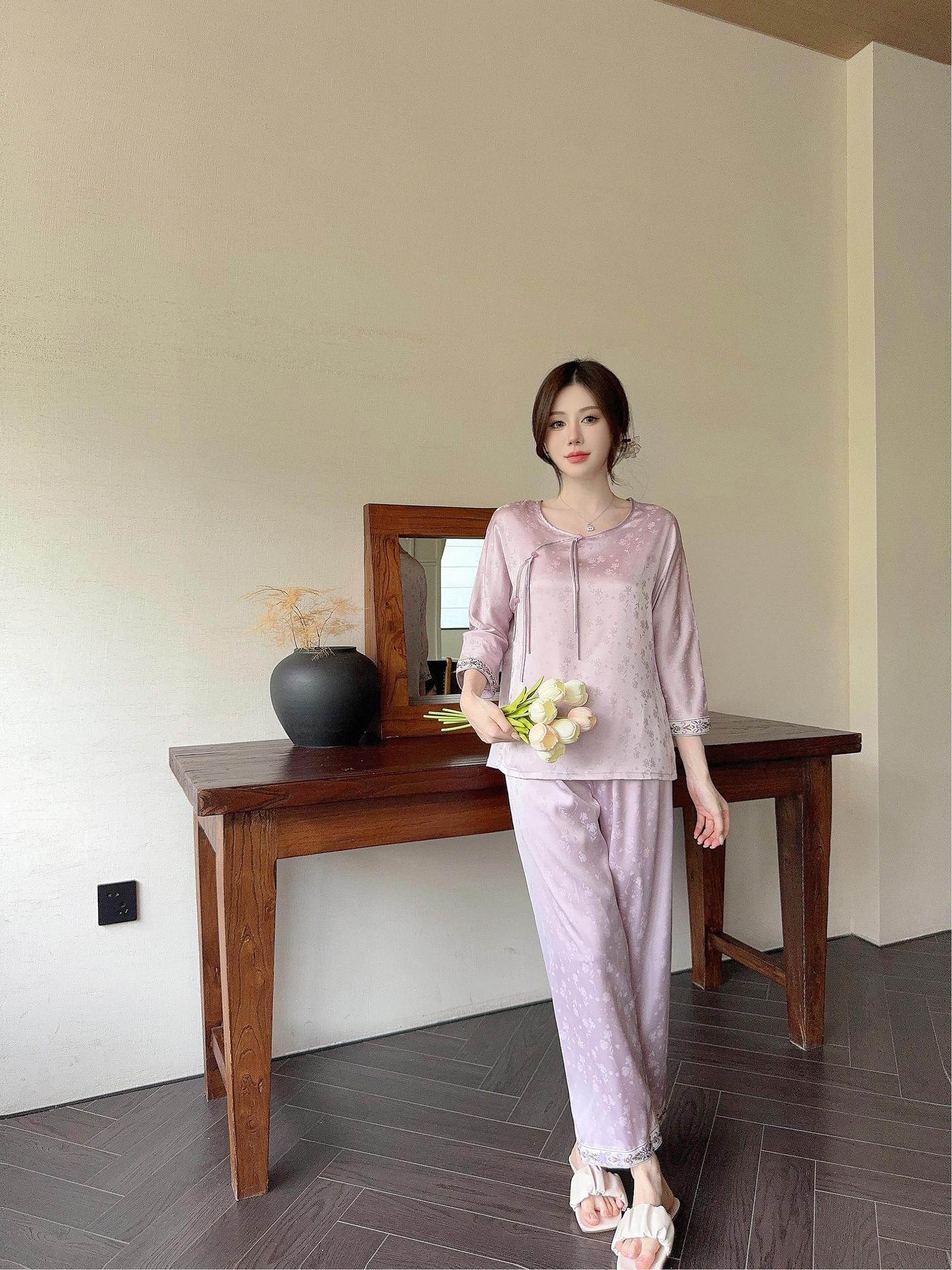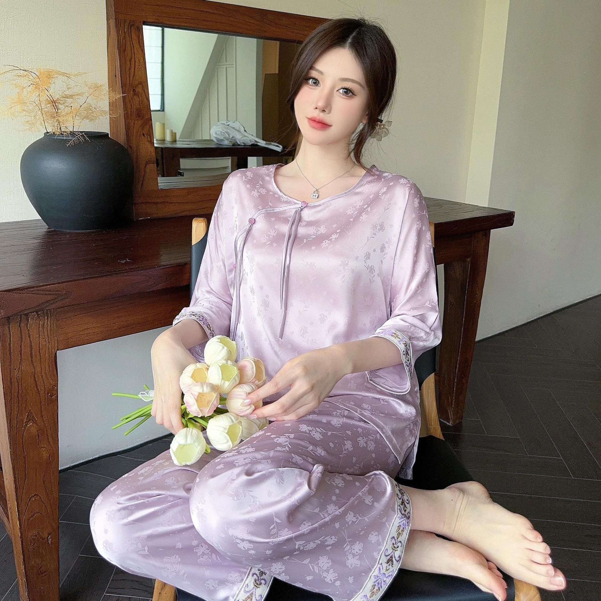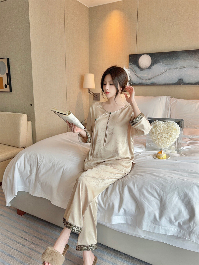 골든 궈펑 아이스 실크 파자마 여성의 얇은 새로운 중국 스타일 홈 의류 세트 빈티지 자카드 하이 엔드 웨어러블