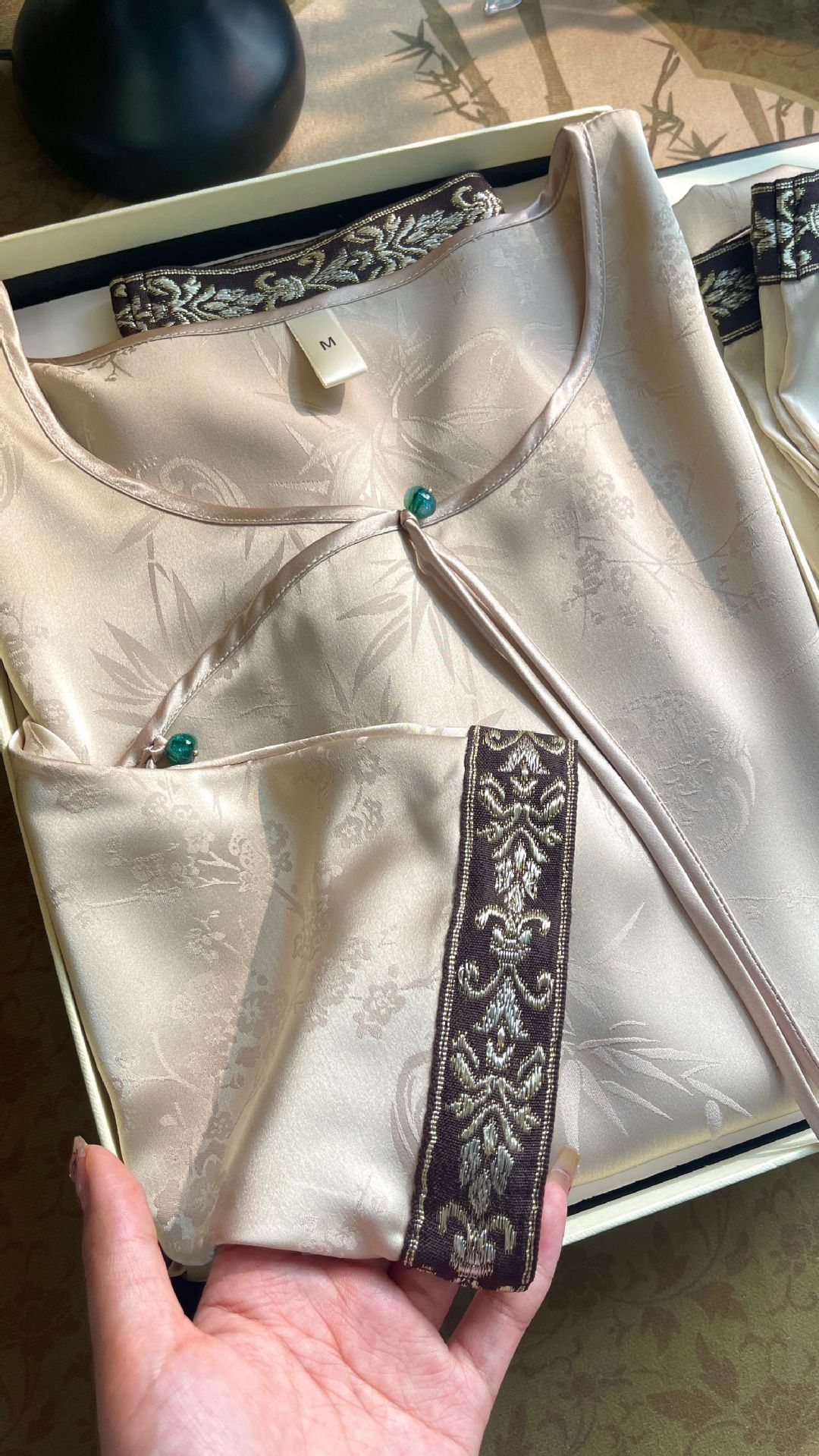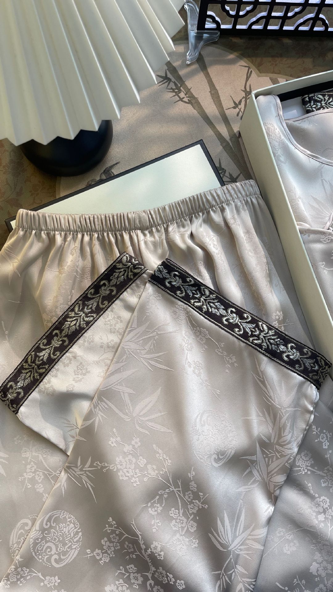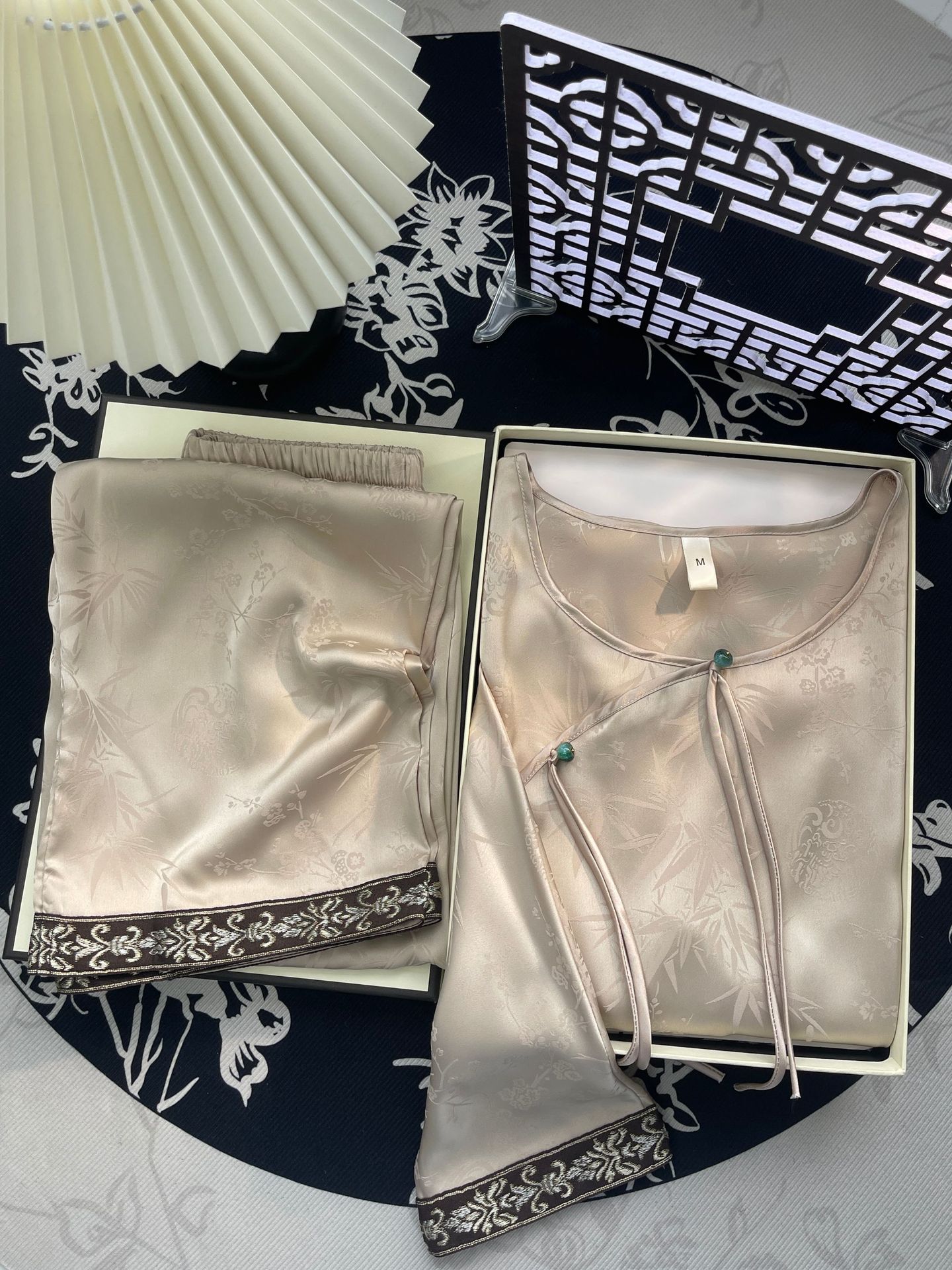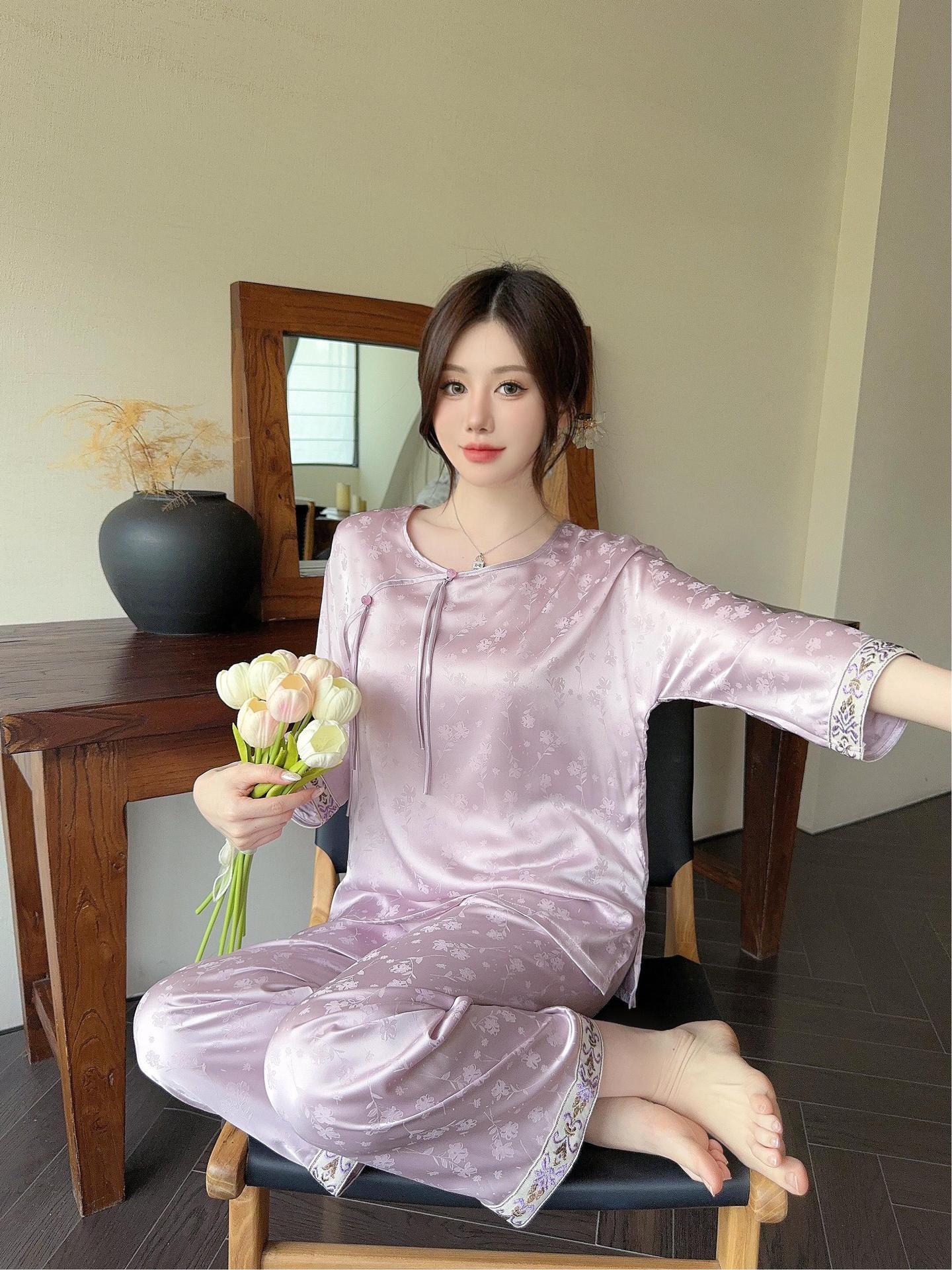 골든 궈펑 아이스 실크 파자마 여성의 얇은 새로운 중국 스타일 홈 의류 세트 빈티지 자카드 하이 엔드 웨어러블