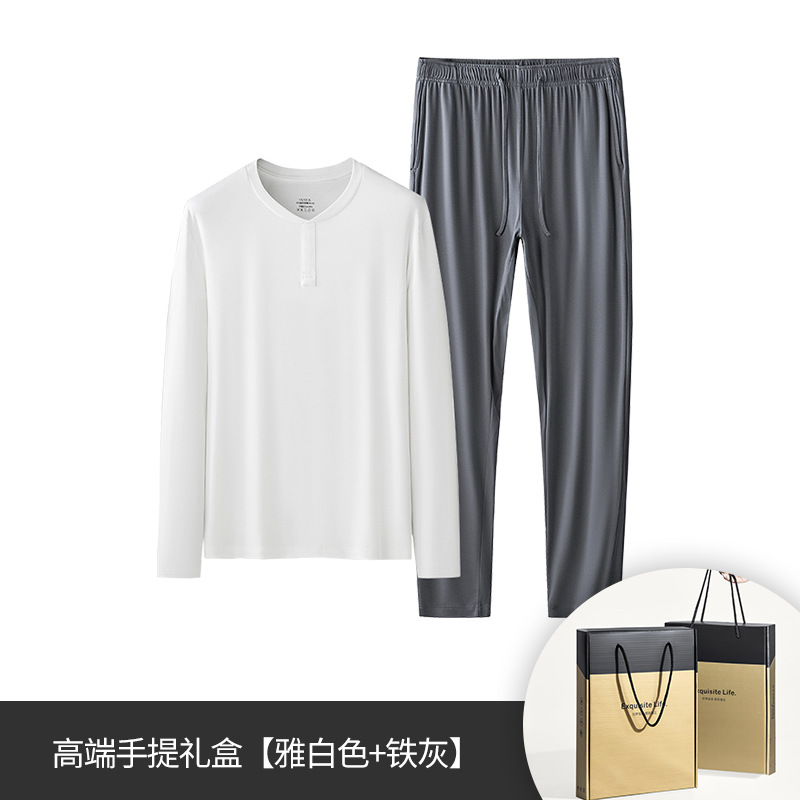 새로운 봄, 여름 양면 모달 남성용 긴팔 티셔츠와 바지 정장 단색 잠옷은 집 밖에서 착용할 수 있습니다.스토어 가기